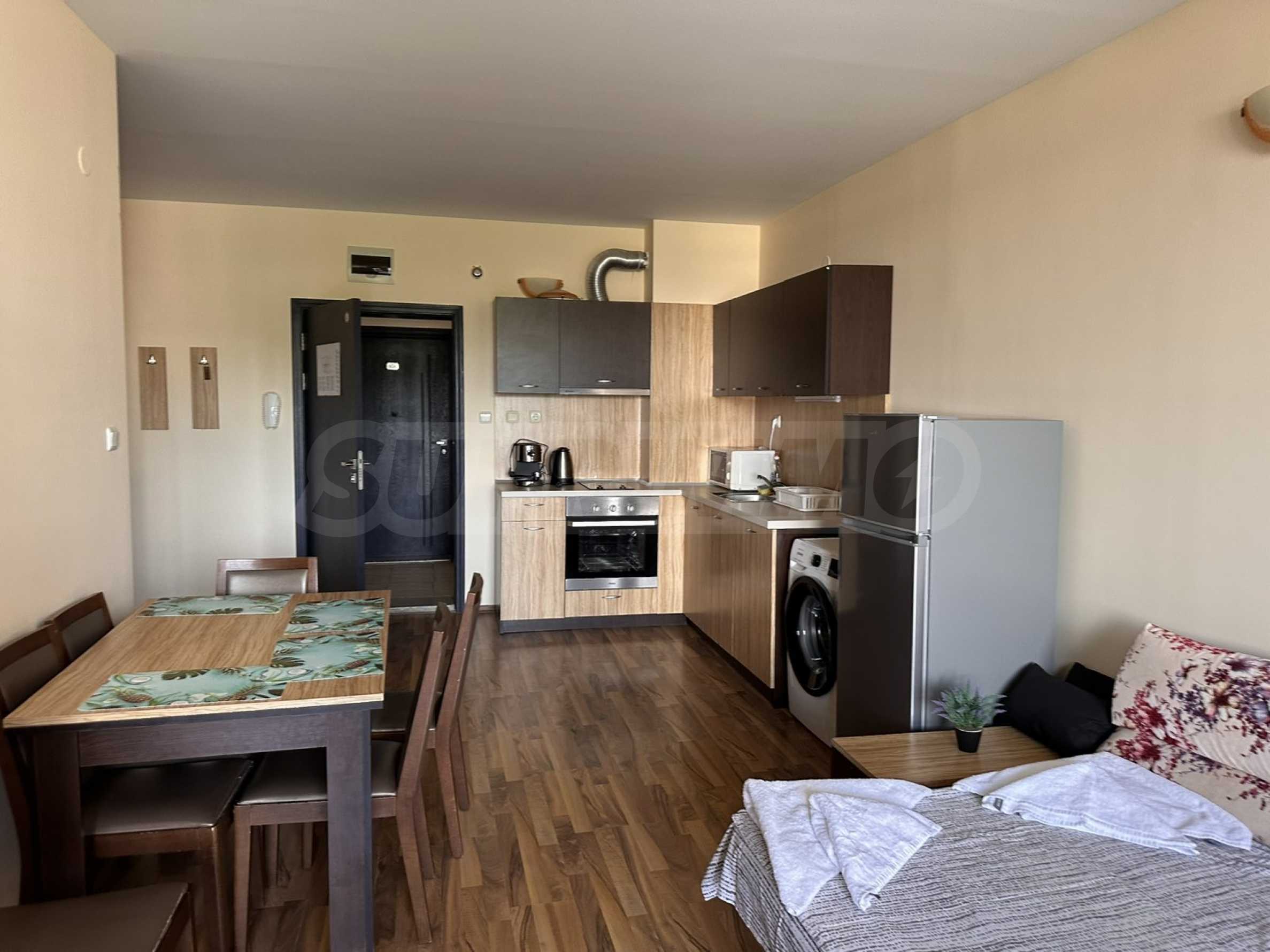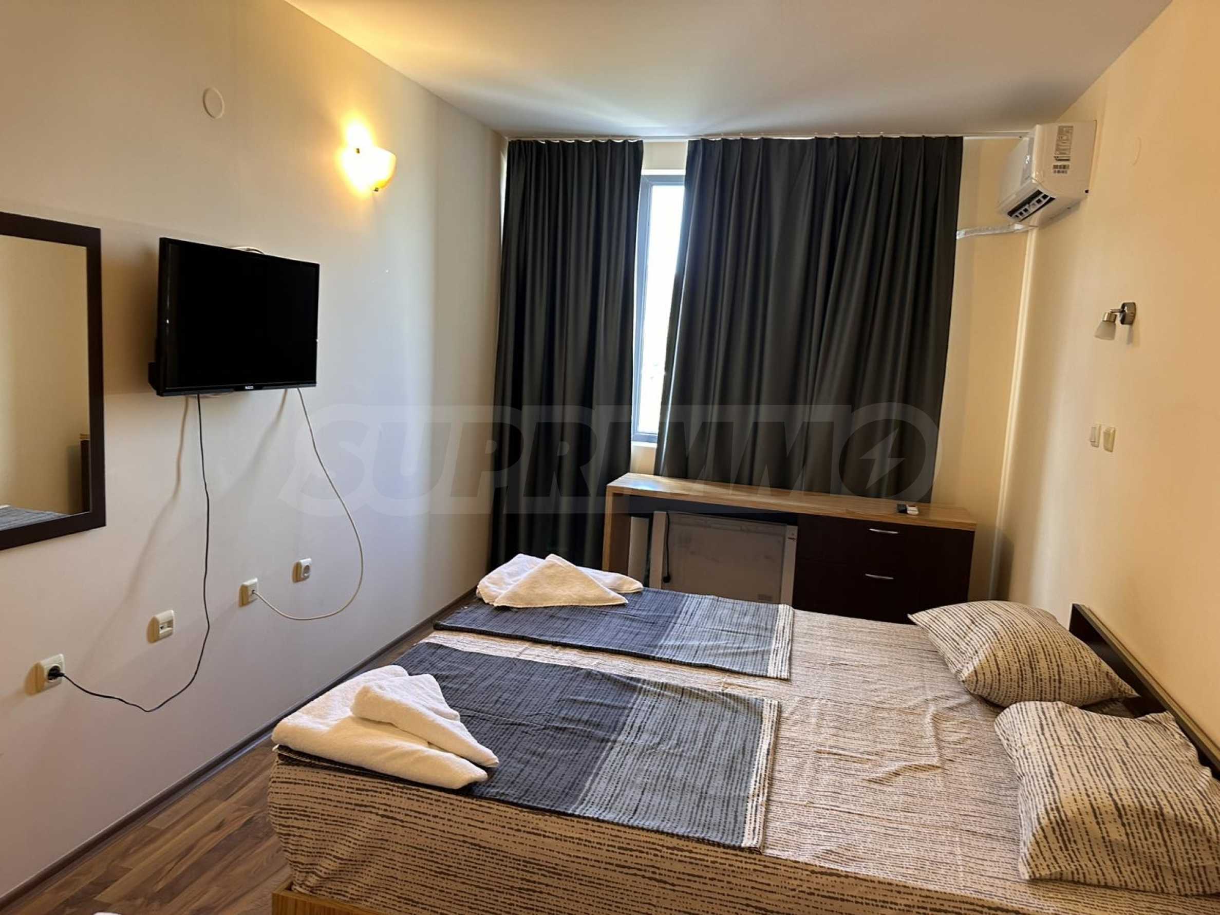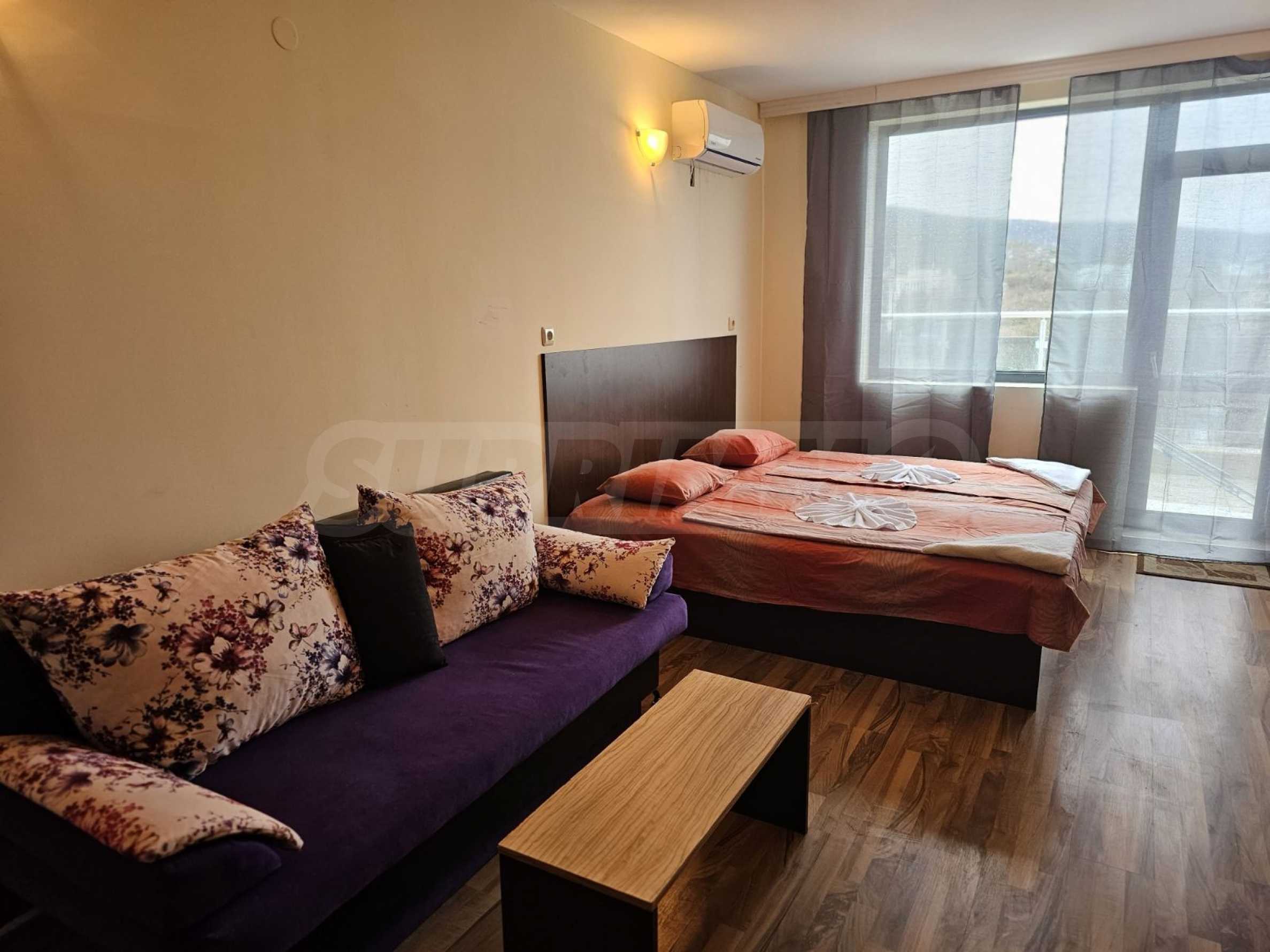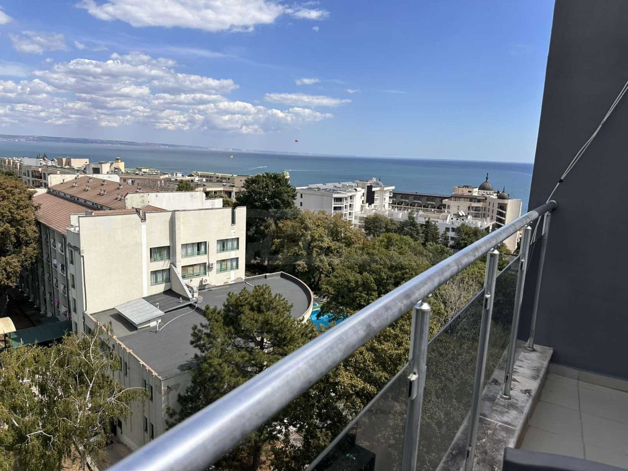 Prezentujemy umeblowany, panoramiczny apartament z jedną sypialnią i widokiem na morze, na sprzedaż w popularnym, strzeżonym kompleksie z basenem w samym sercu kurortu Złote Piaski.