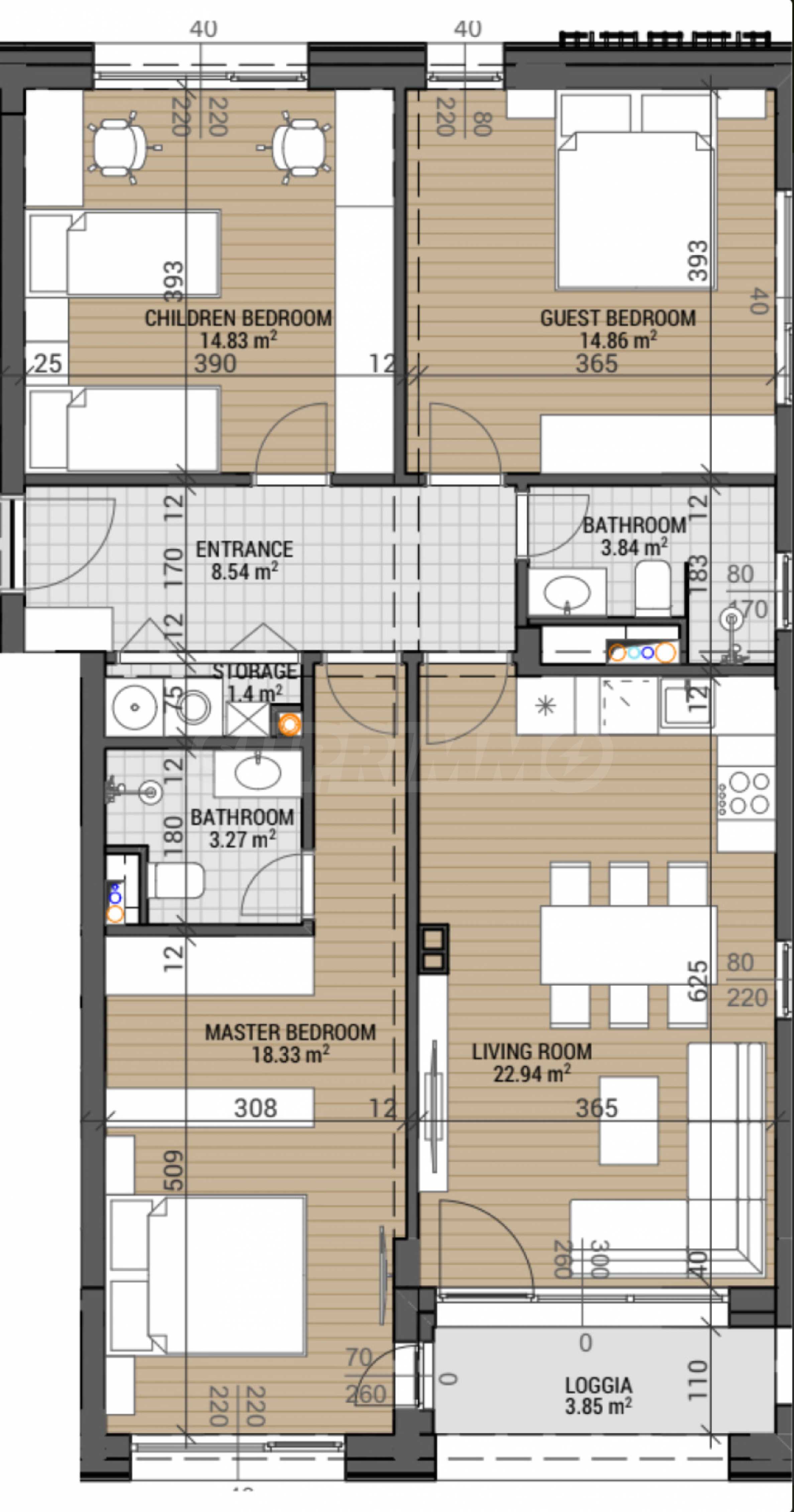 • Salon z jadalnią i kuchnią – 22,94 m2 z wyjściem na loggię – 3,85 m2