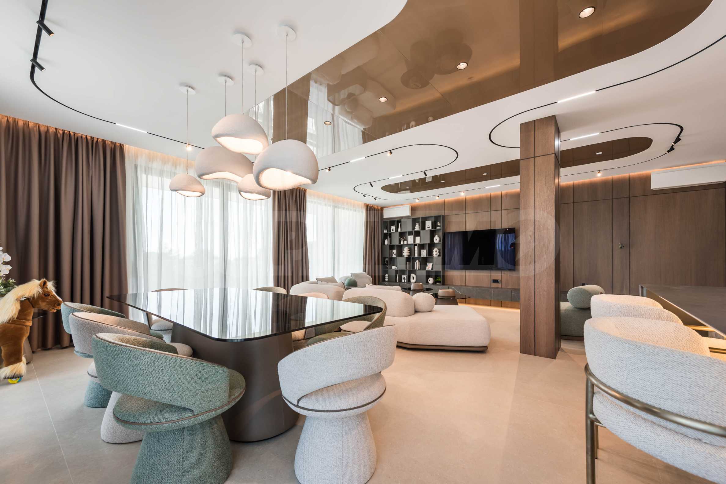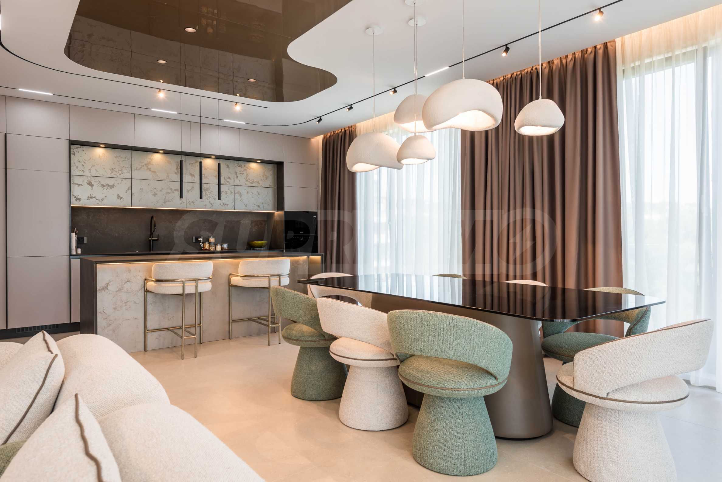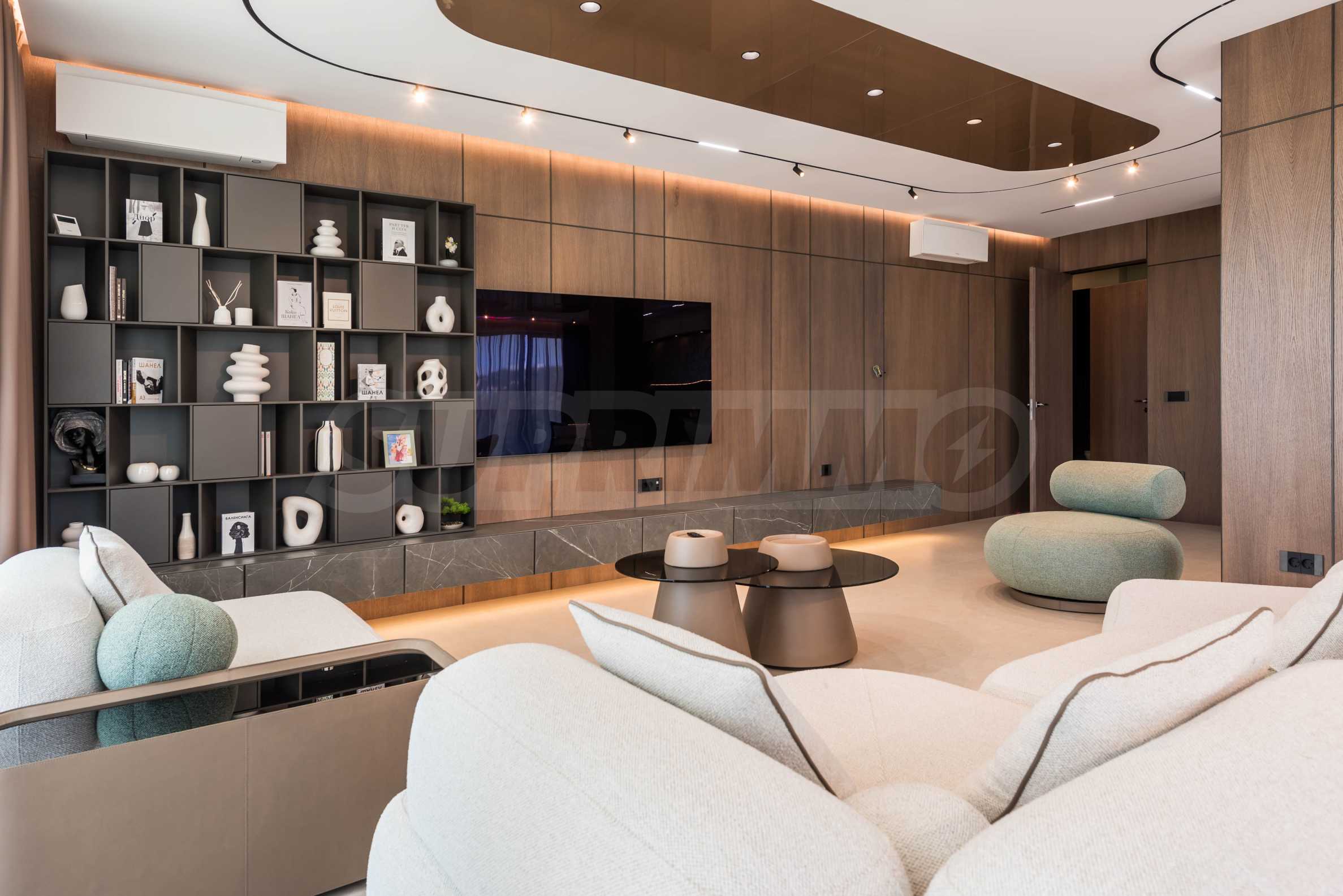 Wnętrze nieruchomości emanuje nowoczesną elegancją i wyjątkową dbałością o detale. Apartament jest luksusowo umeblowany według autorskiego projektu, z włoskimi meblami na zamówienie i wysokiej klasy sprzętem AGD marki Miele. W salonie zachwycają starannie dobrane meble o organicznych kształtach – wygodne sofy i fotele, połączone z niskimi stolikami i stylowym modułem RTV. Przestrzeń zaprojektowano w stonowanych barwach ziemi, a akcenty stanowią atrakcyjne, nowoczesne sufity z nowoczesnym oświetleniem – wbudowanymi, liniowymi i designerskimi lampami wiszącymi, które podkreślają przestrzeń i nadają charakter nieruchomości. Sypialnie utrzymane są w tej samej koncepcji – barwy ziemi, oświetlenie akcentujące i rozwiązania projektowe łączące komfort i styl. Atmosfera została przemyślana tak, aby łączyć luksus z wyciszeniem.