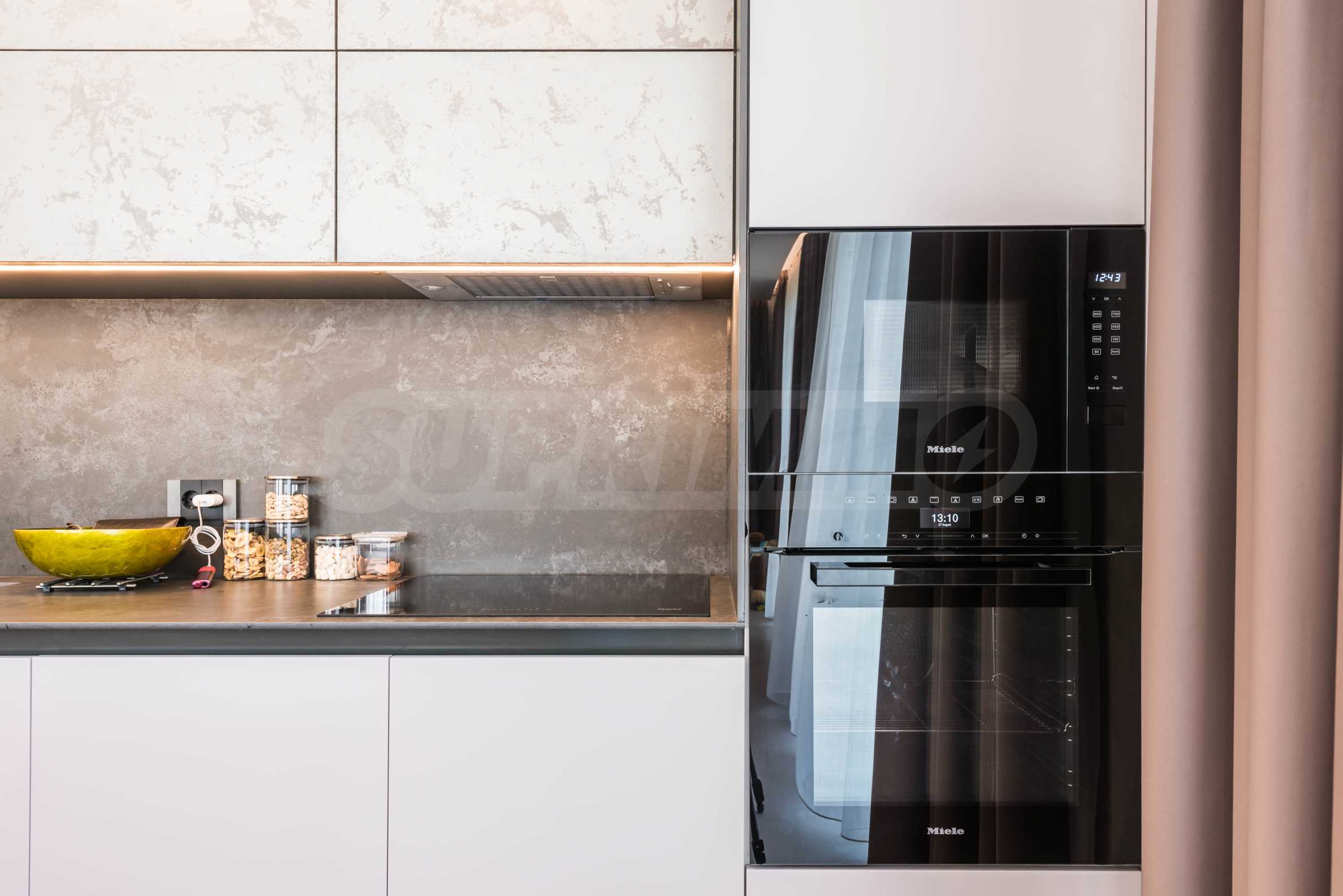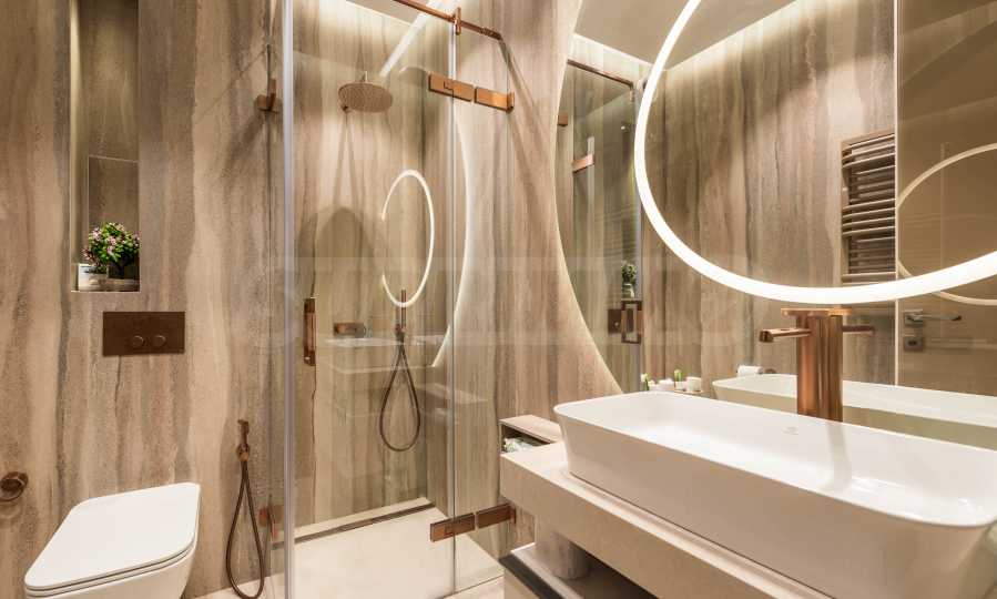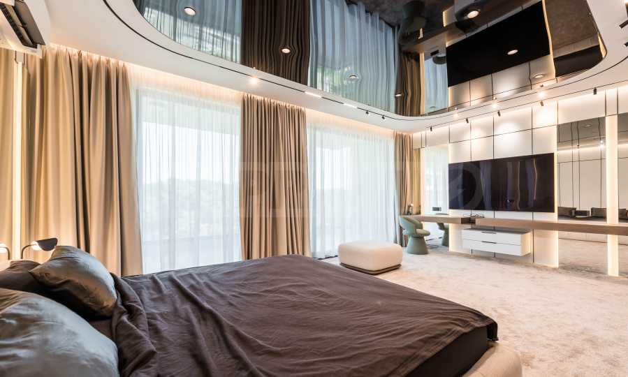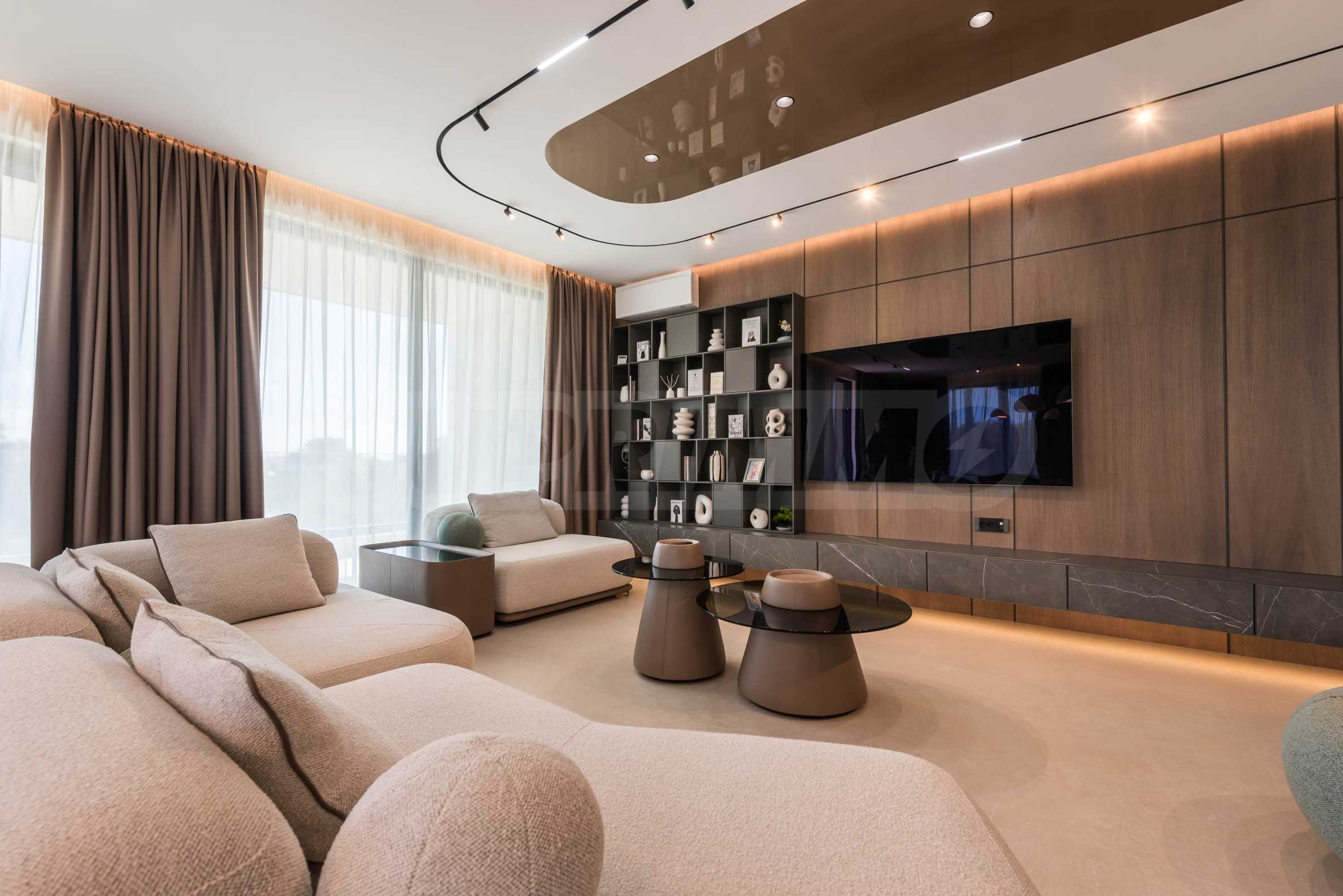 Wnętrze nieruchomości emanuje nowoczesną elegancją i wyjątkową dbałością o detale. Apartament jest luksusowo umeblowany według autorskiego projektu, z włoskimi meblami na zamówienie i wysokiej klasy sprzętem AGD marki Miele. W salonie zachwycają starannie dobrane meble o organicznych kształtach – wygodne sofy i fotele, połączone z niskimi stolikami i stylowym modułem RTV. Przestrzeń zaprojektowano w stonowanych barwach ziemi, a akcenty stanowią atrakcyjne, nowoczesne sufity z nowoczesnym oświetleniem – wbudowanymi, liniowymi i designerskimi lampami wiszącymi, które podkreślają przestrzeń i nadają charakter nieruchomości. Sypialnie utrzymane są w tej samej koncepcji – barwy ziemi, oświetlenie akcentujące i rozwiązania projektowe łączące komfort i styl. Atmosfera została przemyślana tak, aby łączyć luksus z wyciszeniem.