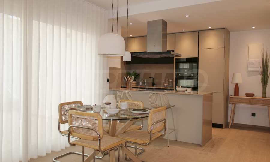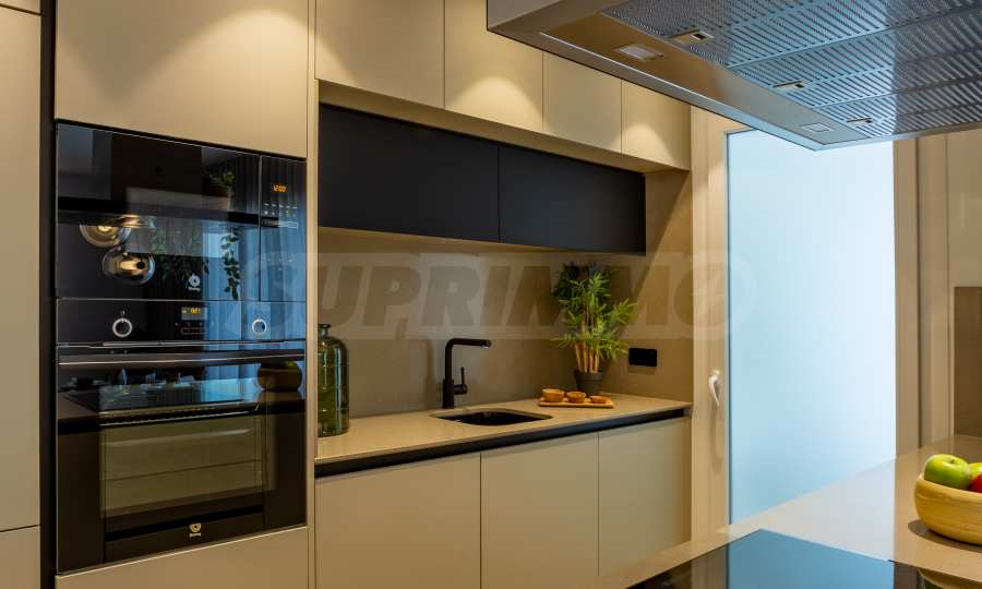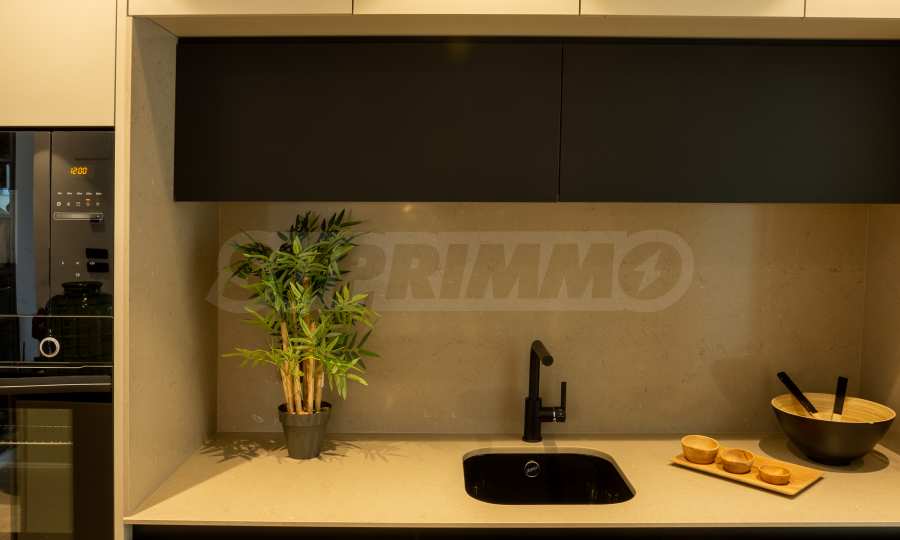 Kuchnia zachwyca nowoczesnym designem i wysokiej jakości materiałami, które łączą styl i funkcjonalność. Otwarty bar płynnie przechodzi w salon, tworząc wrażenie przestronności i przytulnej atmosfery.