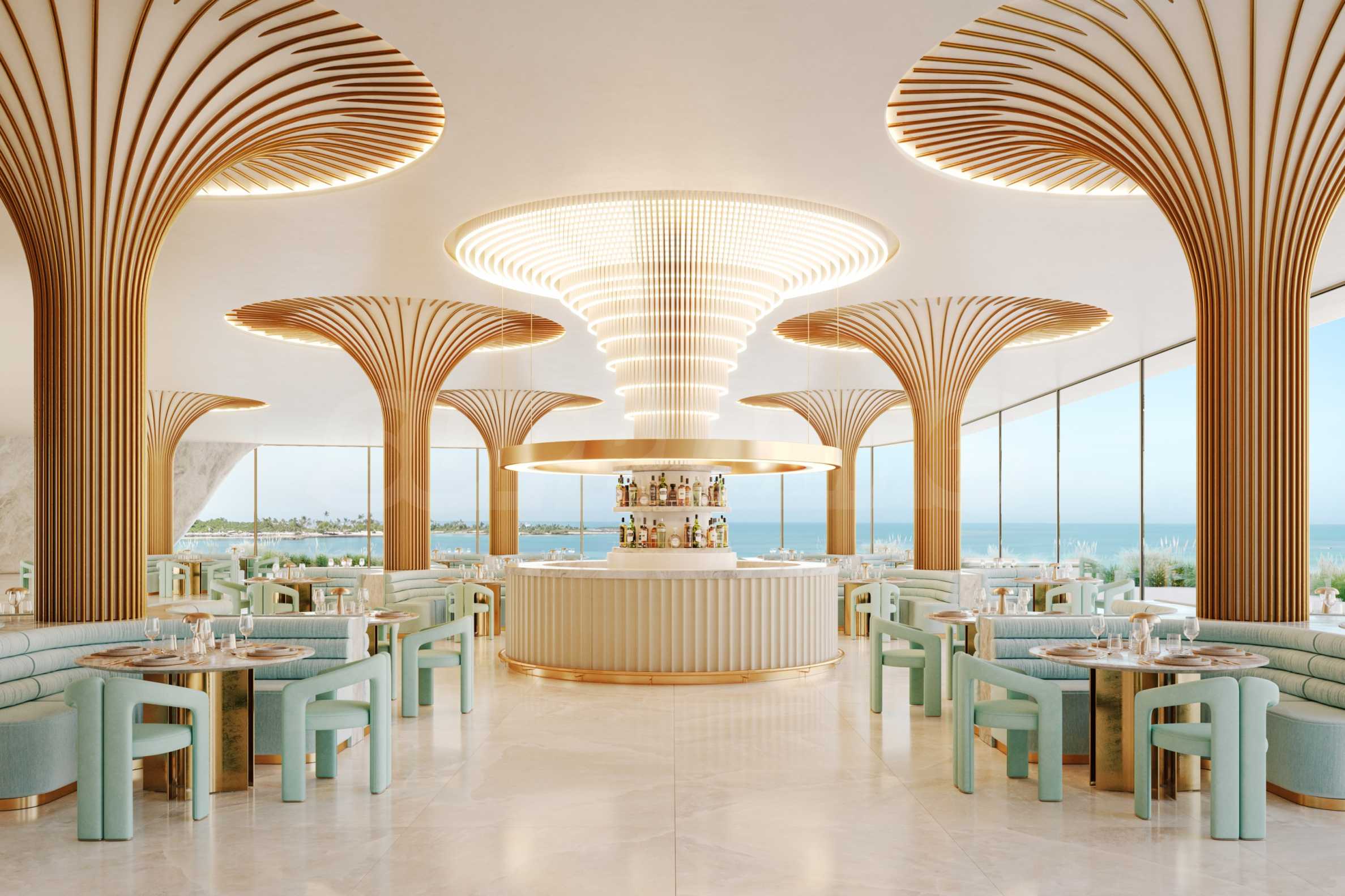 Wysokie sufity i okna sięgające od podłogi do sufitu dają poczucie wolności i światła, płynnie łącząc wnętrze z otoczeniem i tworząc wspólną przestrzeń, w której można poczuć morską bryzę i ciepłe promienie słońca.