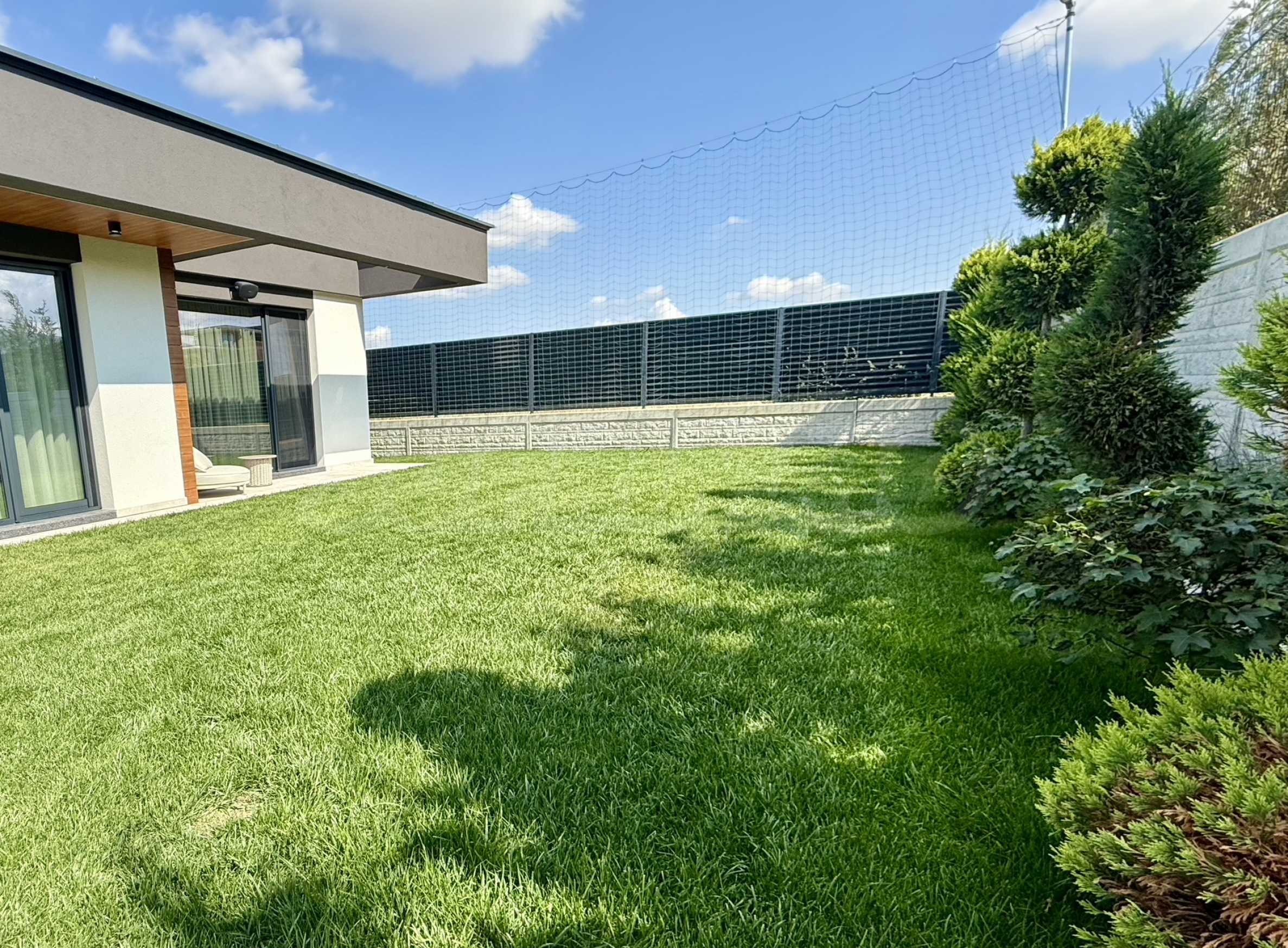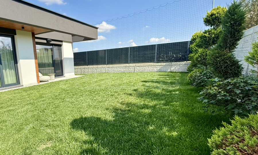 • ogród skierowany na południe, kompletne zagospodarowanie terenu, system nawadniania i weranda;