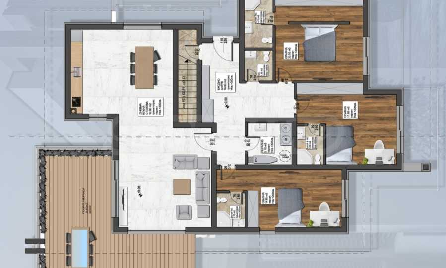• pierwsze piętro - hol wejściowy z wysokim sufitem, korytarz, przestronny salon z aneksem kuchennym i jadalnią, trzy sypialnie, trzy łazienki z toaletą, pralnia i weranda.