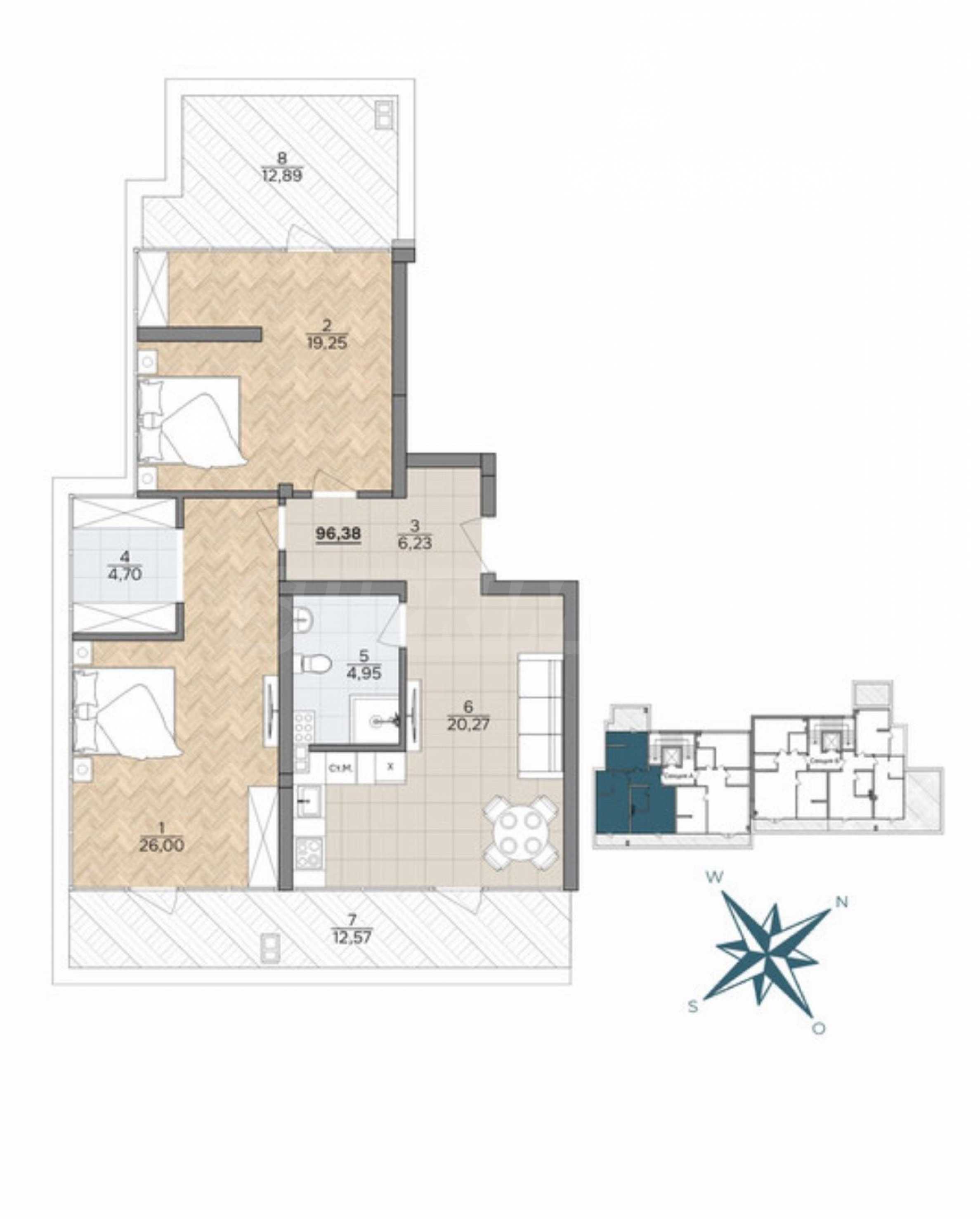 Apartament o powierzchni całkowitej 96 mkw. znajduje się na 6 piętrze w 6.