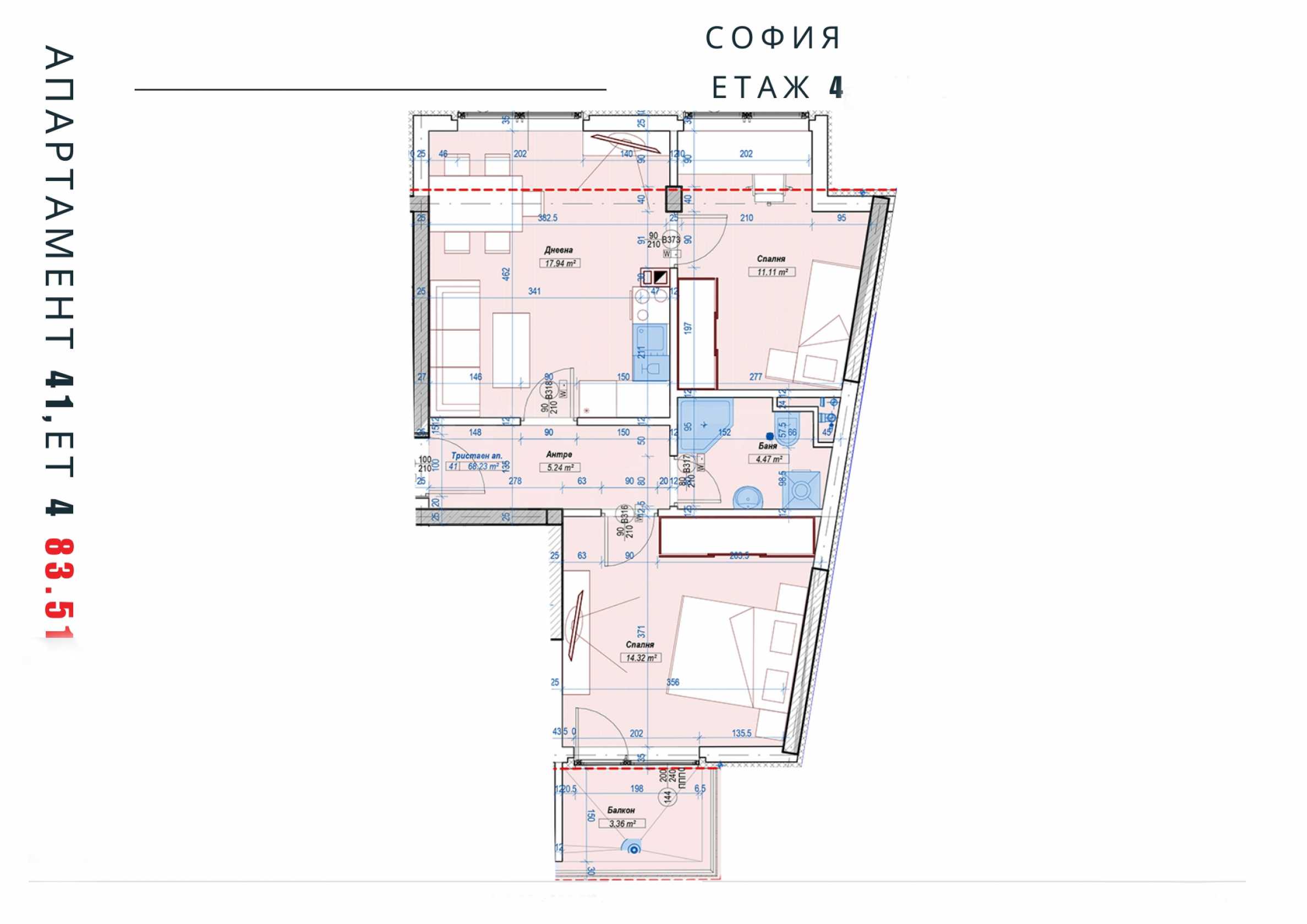 Trzypokojowe mieszkanie (41) ma powierzchnię całkowitą 83,51 m kw. (powierzchnia zabudowana 68,23 m kw., części wspólne 15,28 m kw.).