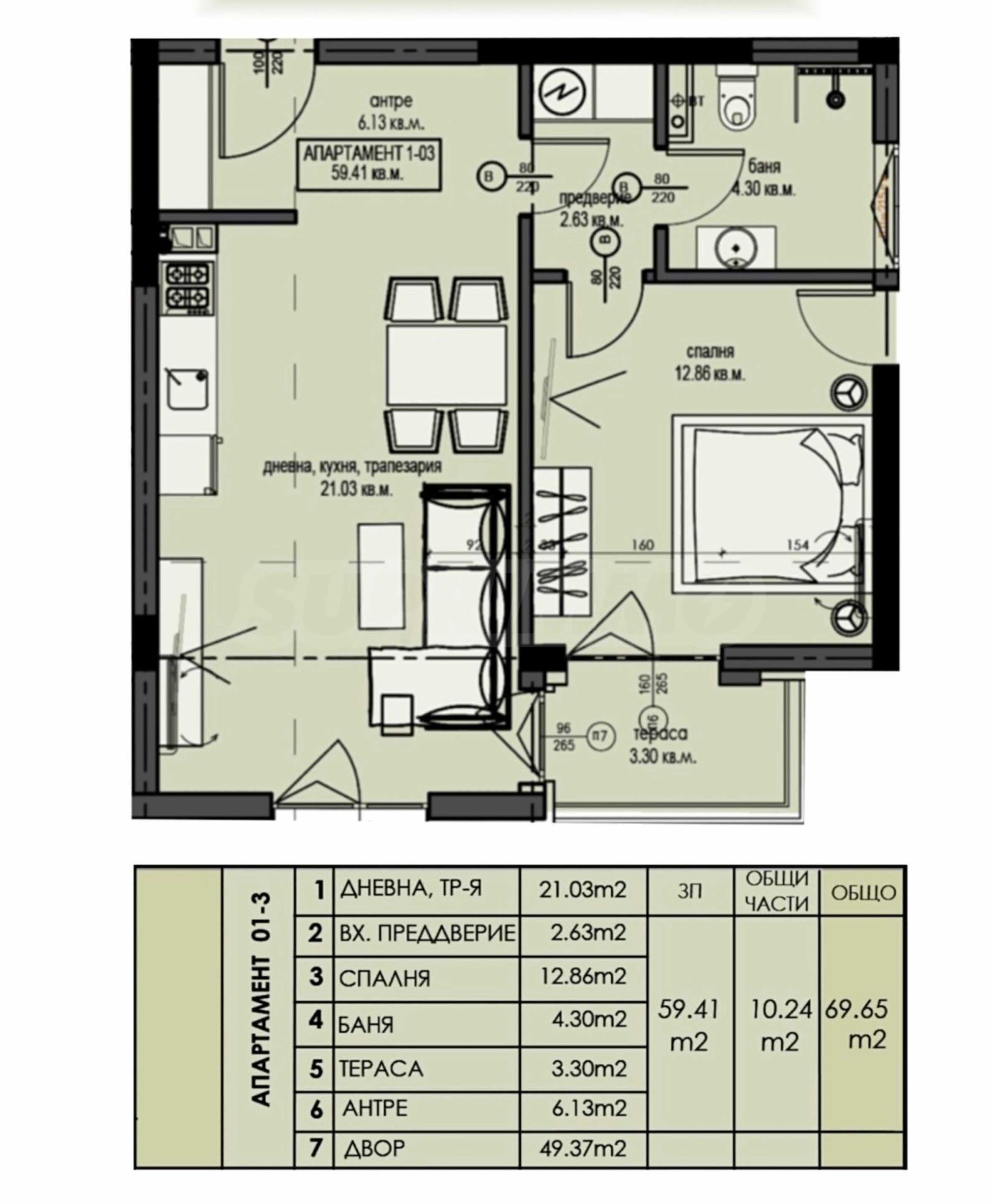 Oferujemy apartament z jedną sypialnią i ogródkiem w nowym budynku o nowoczesnym designie i architekturze, zaledwie kilka metrów od centrum Welingradu i strefy SPA.