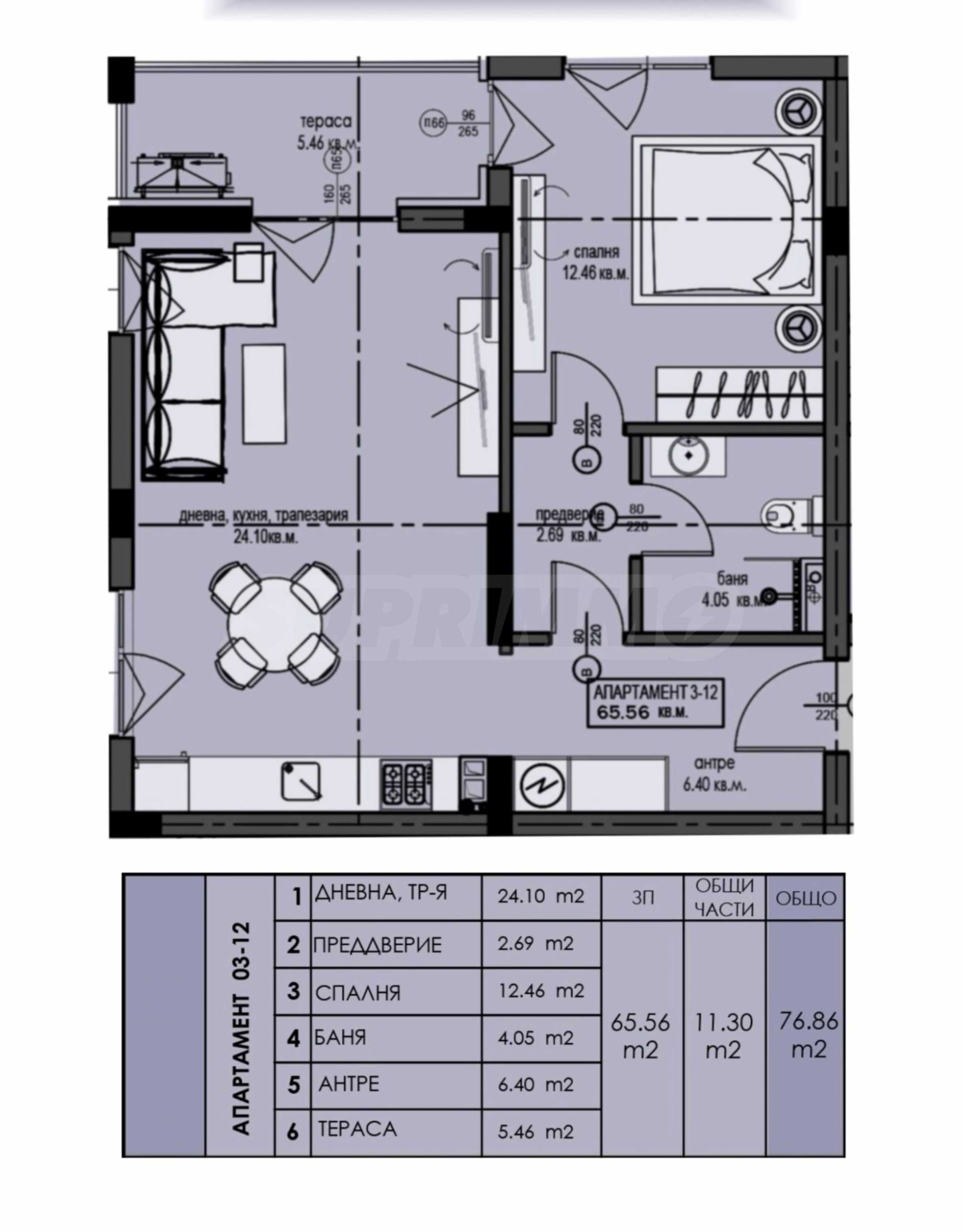 Układ nieruchomości: powierzchnia całkowita 76,86 m2 (powierzchnia netto 65,56 m2 + powierzchnie wspólne 11,30 m2), położone na trzecim piętrze.