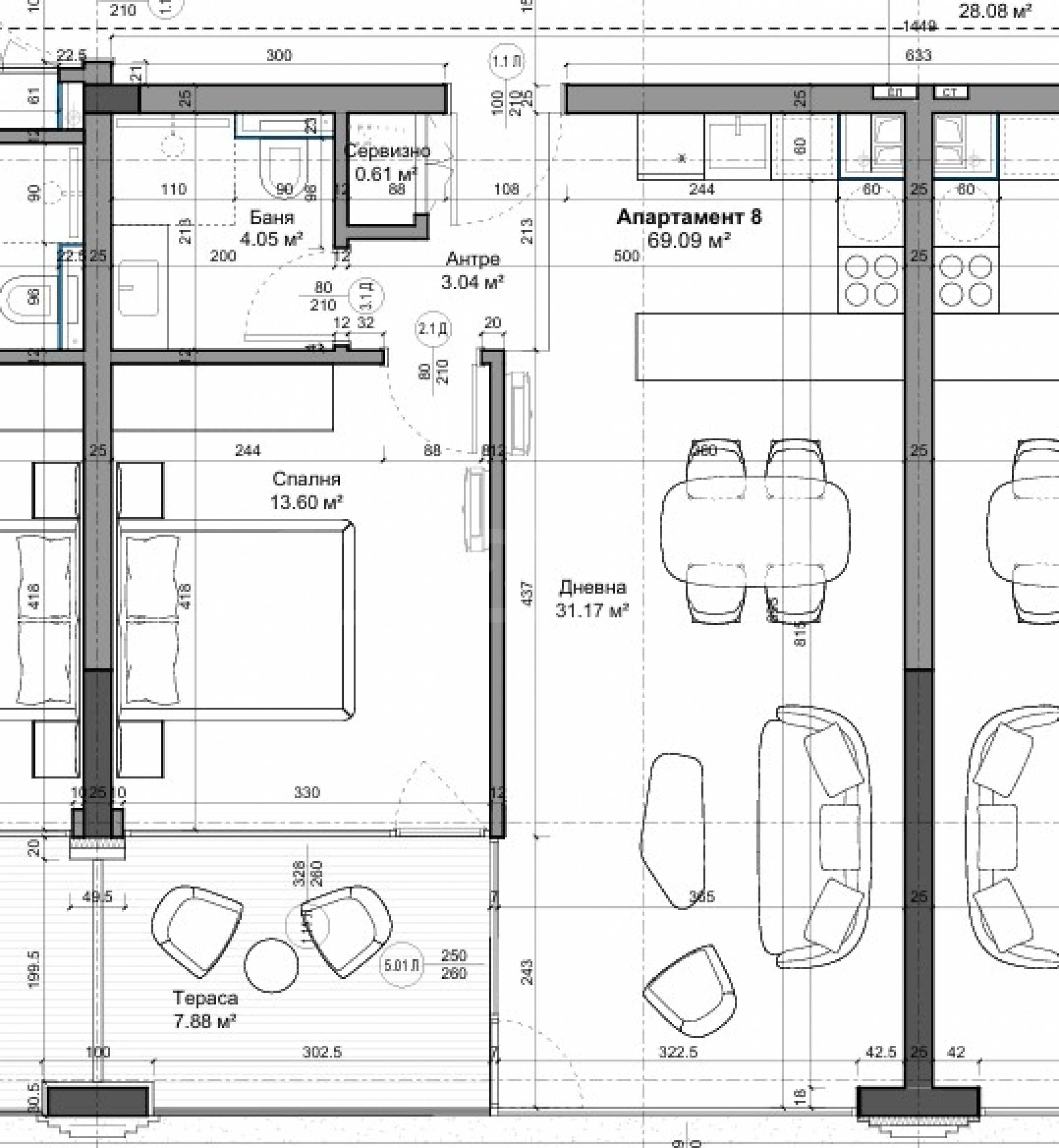 • salon z kuchnią i jadalnią - 31,17 m2;