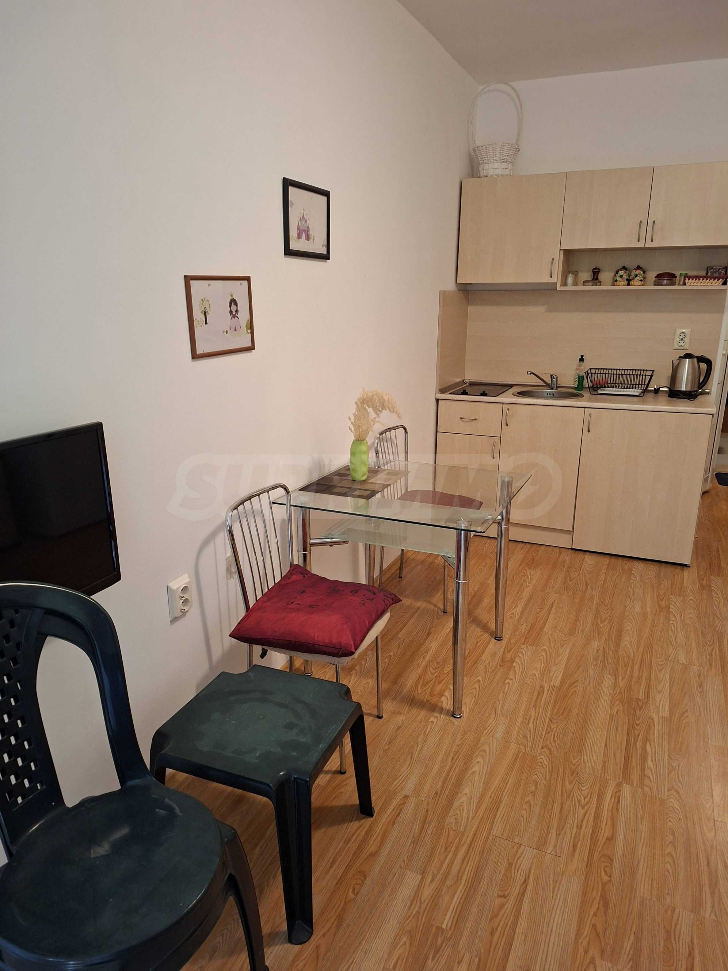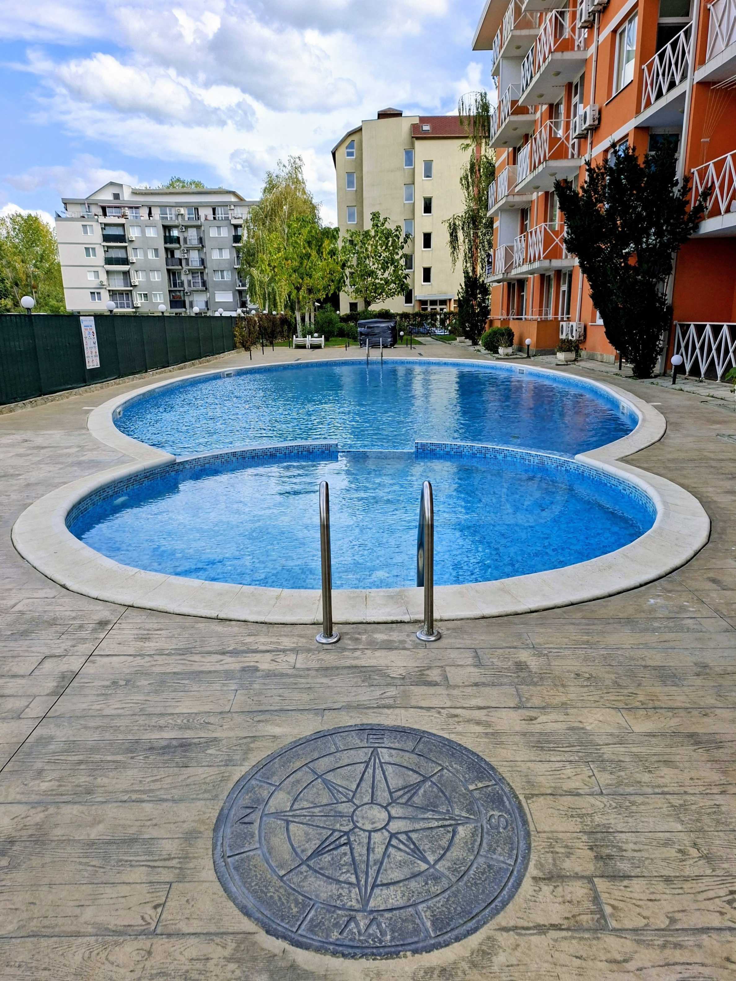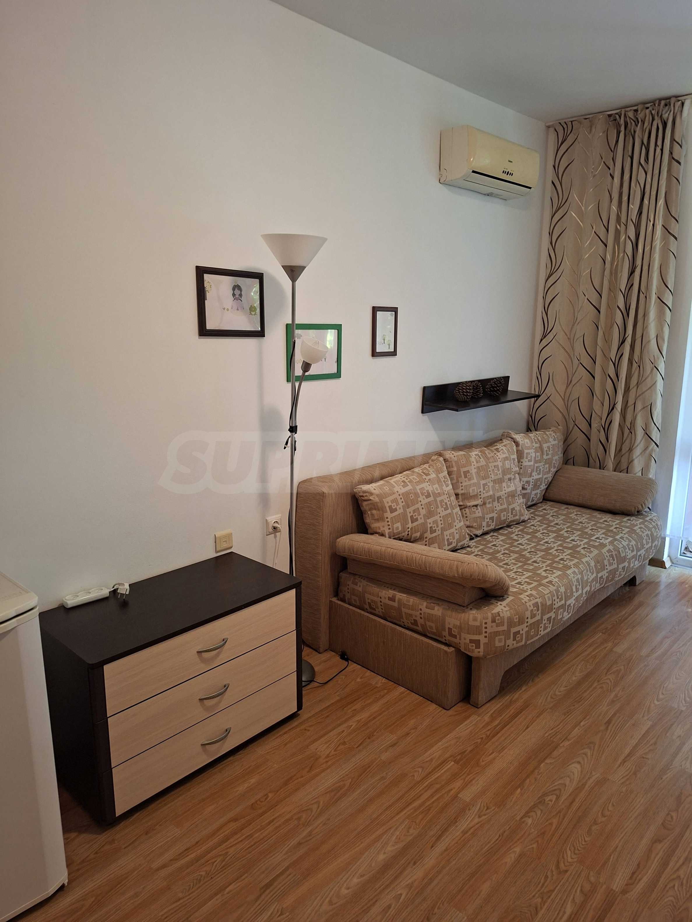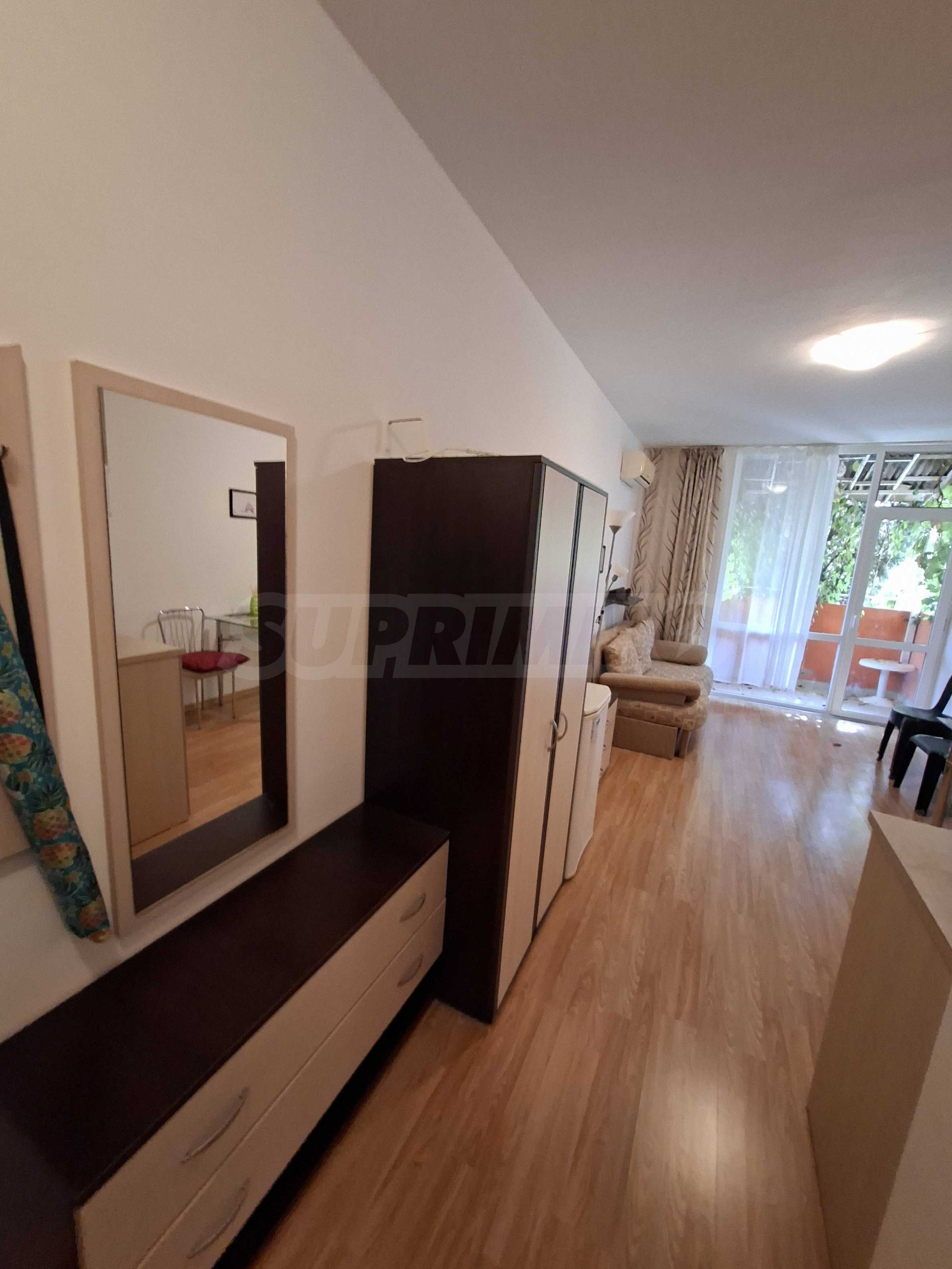 Oferujemy do sprzedaży mieszkanie jednopokojowe w strzeżonym kompleksie z basenem w Słonecznym Brzegu. Znajduje się ono 200 metrów od supermarketu „Mladost”, w okolicy z licznymi punktami handlowymi, w dogodnej lokalizacji, w odległości spaceru od morza.
