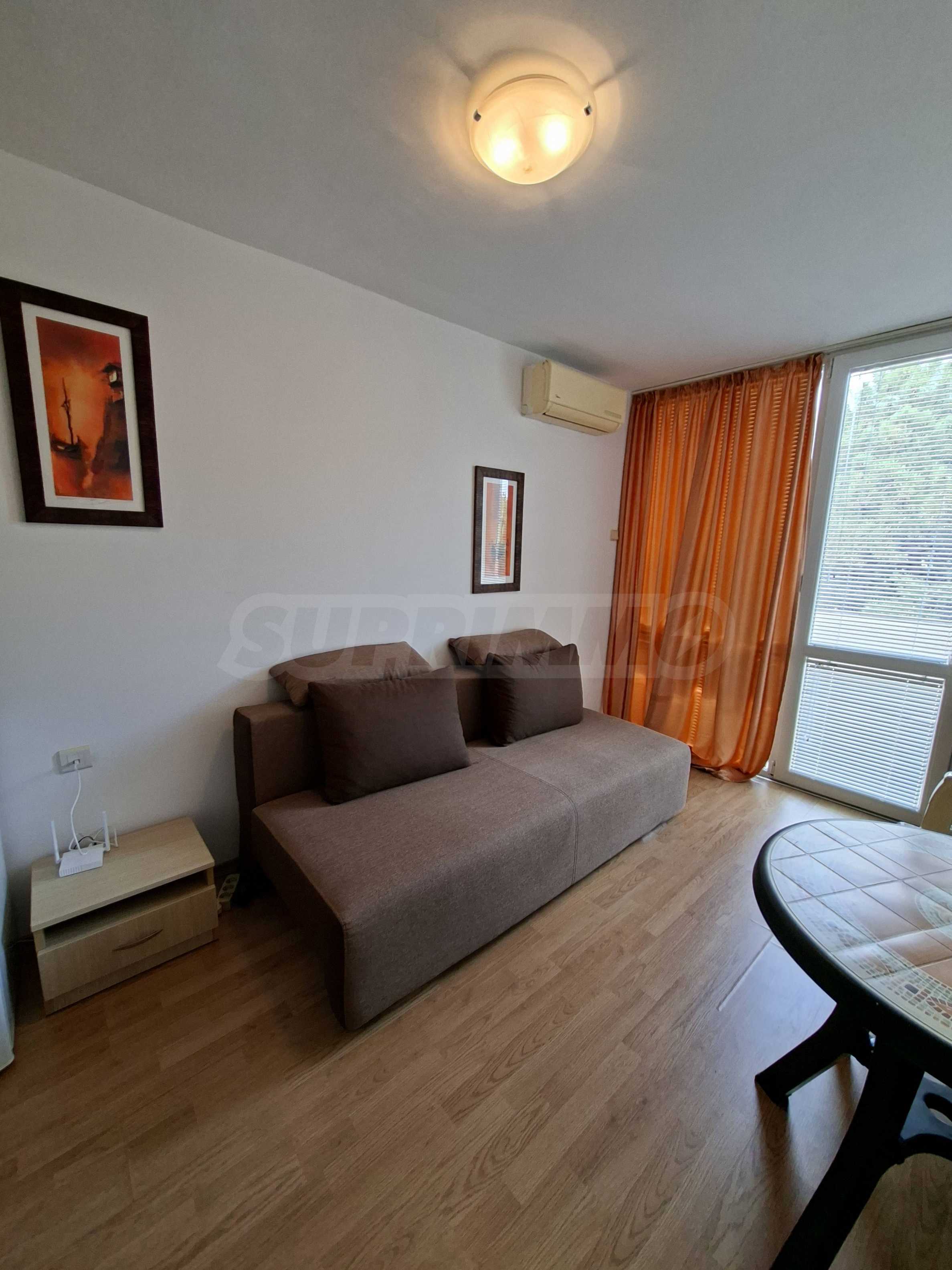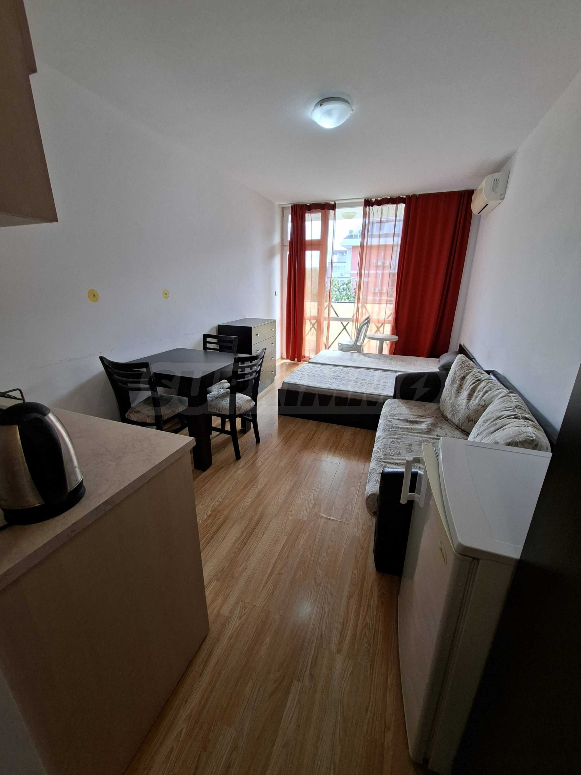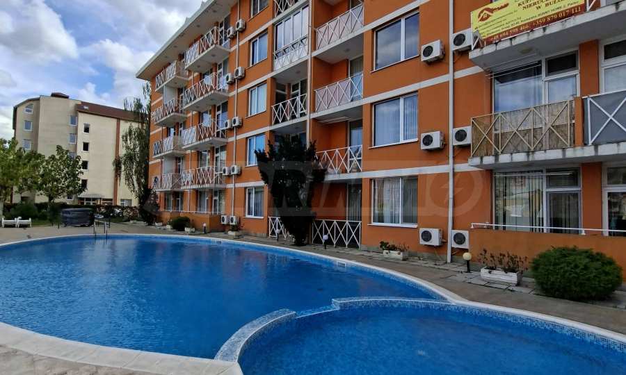 Oferujemy do sprzedaży zadbane mieszkanie jednopokojowe w strzeżonym kompleksie z basenem w Słonecznym Brzegu. Położone jest 200 metrów od supermarketu „Mladost”, w okolicy z licznymi punktami handlowymi, w dogodnej lokalizacji, w odległości spaceru od morza.
