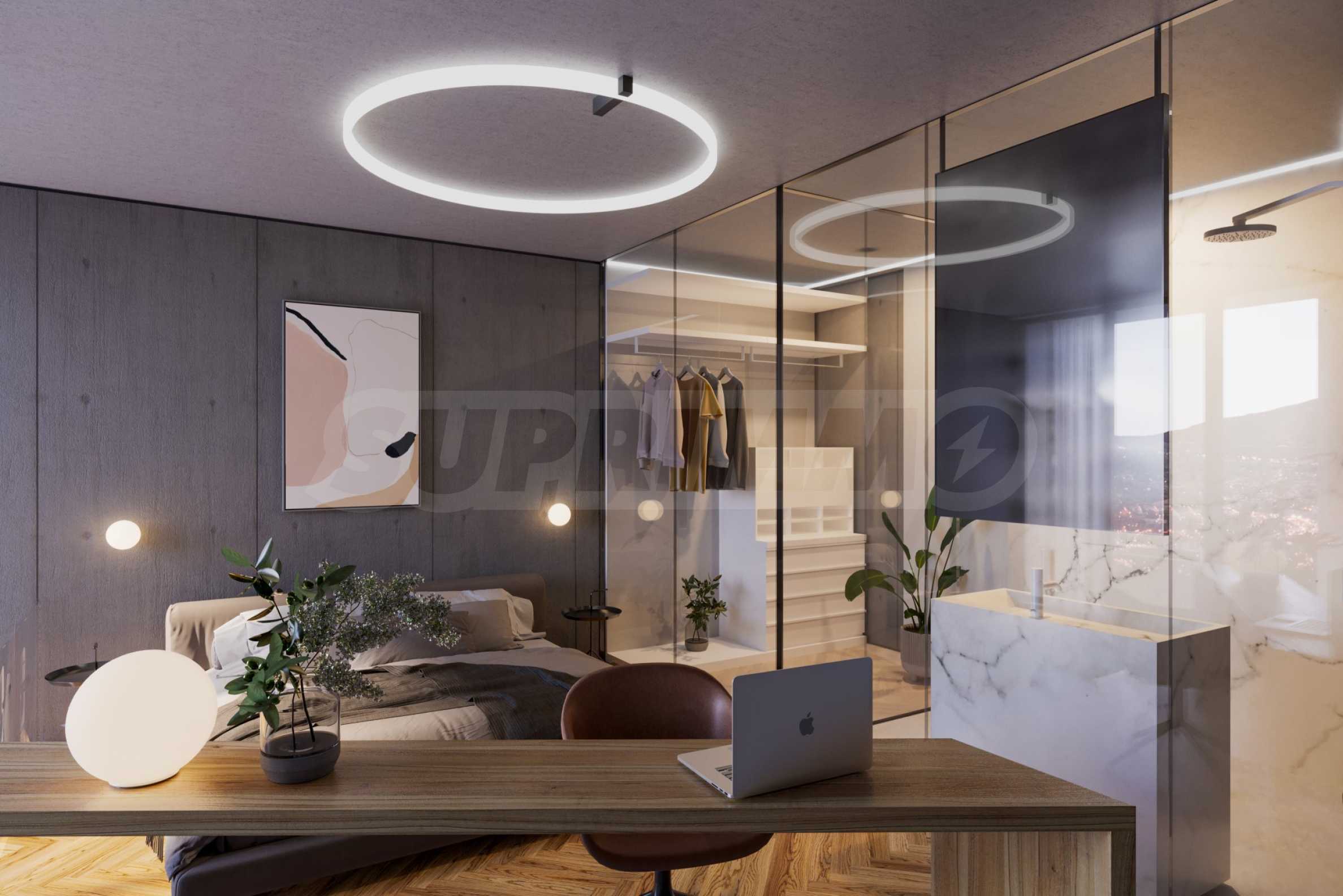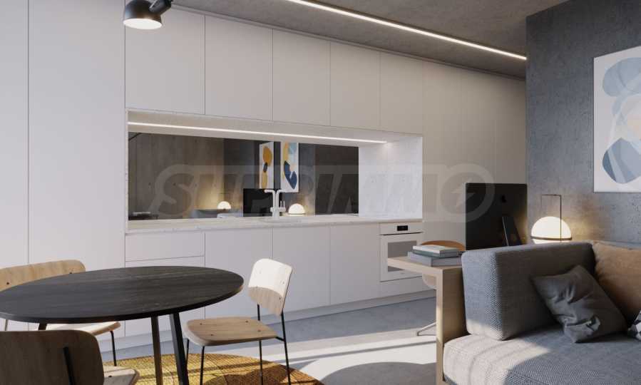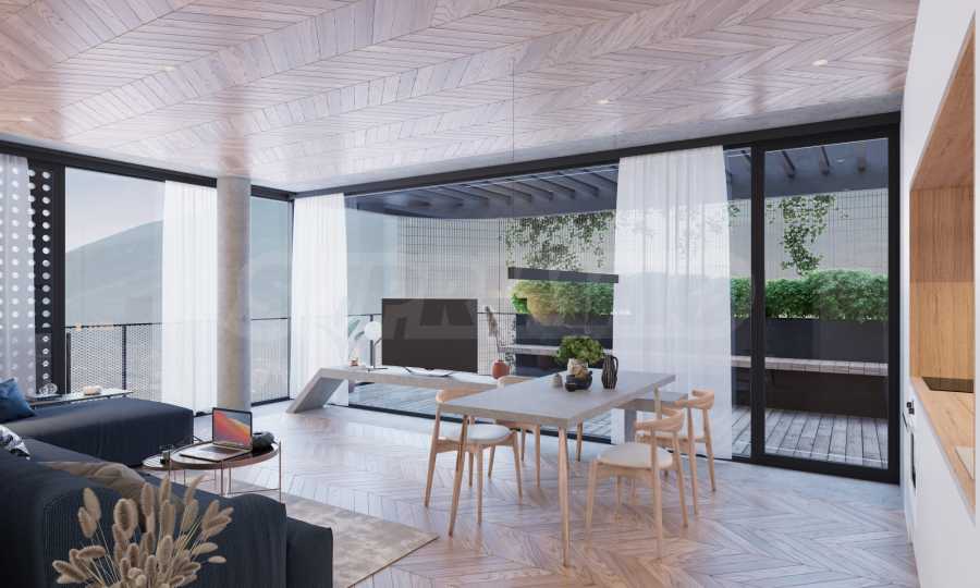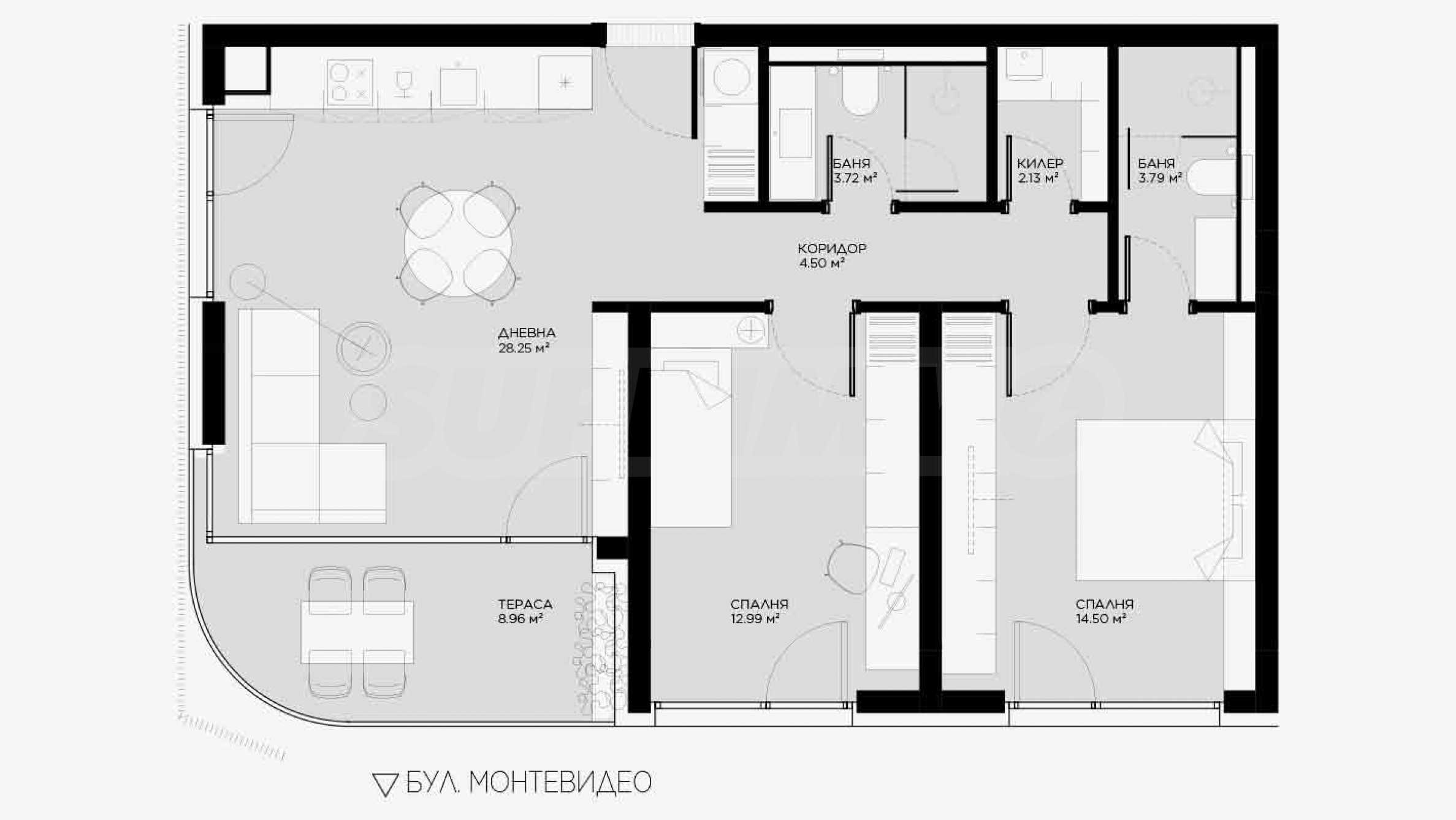 Prezentujemy Państwu na sprzedaż trzypokojowe mieszkanie o powierzchni całkowitej 111,77 m² (powierzchnia zabudowy – 92,20 m²), zlokalizowane na trzecim piętrze z sześciu w nowo wybudowanym budynku mieszkalnym o doskonałej koncepcji architektonicznej i nowoczesnej wizji, zlokalizowanym w dzielnicy „Ovcha Kupel 1”. Funkcjonalny układ mieszkania przedstawia się następująco: salon z aneksem kuchennym o powierzchni 28,25 m², dwie sypialnie o powierzchni 12,99 m² i 14,50 m², dwie łazienki z toaletami (3,72 m² i 3,79 m²), garderoba (2,13 m²), korytarz (4,50 m²) oraz taras (8,96 m²). Mieszkanie ma ekspozycję północno-wschodnią, a ogrzewanie będzie gazowe.
