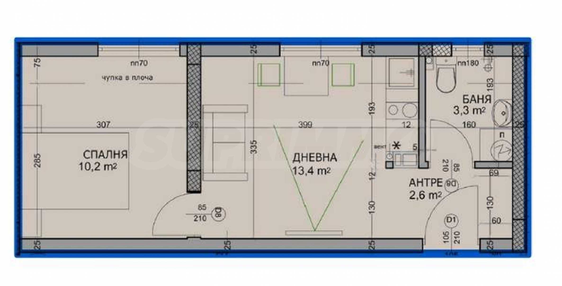 Prezentujemy jednopokojowe mieszkanie w nowym budynku mieszkalnym, który umiejętnie łączy estetykę, funkcjonalność i wysoki standard życia, w samym sercu jednej z najbardziej pożądanych dzielnic Płowdiwu – „Hristo Smirnenski”. Lokalizacja jest niezwykle dogodna – tuż obok parku „Rekreacja i Kultura” i blisko Kanału Wioślarskiego, o krok od przystanku komunikacji miejskiej oraz w pobliżu sklepów, aptek, przedszkoli i prestiżowych szkół, w tym Liceum Matematycznego. To idealny wybór zarówno dla rodzin, jak i osób o dynamicznym stylu życia.