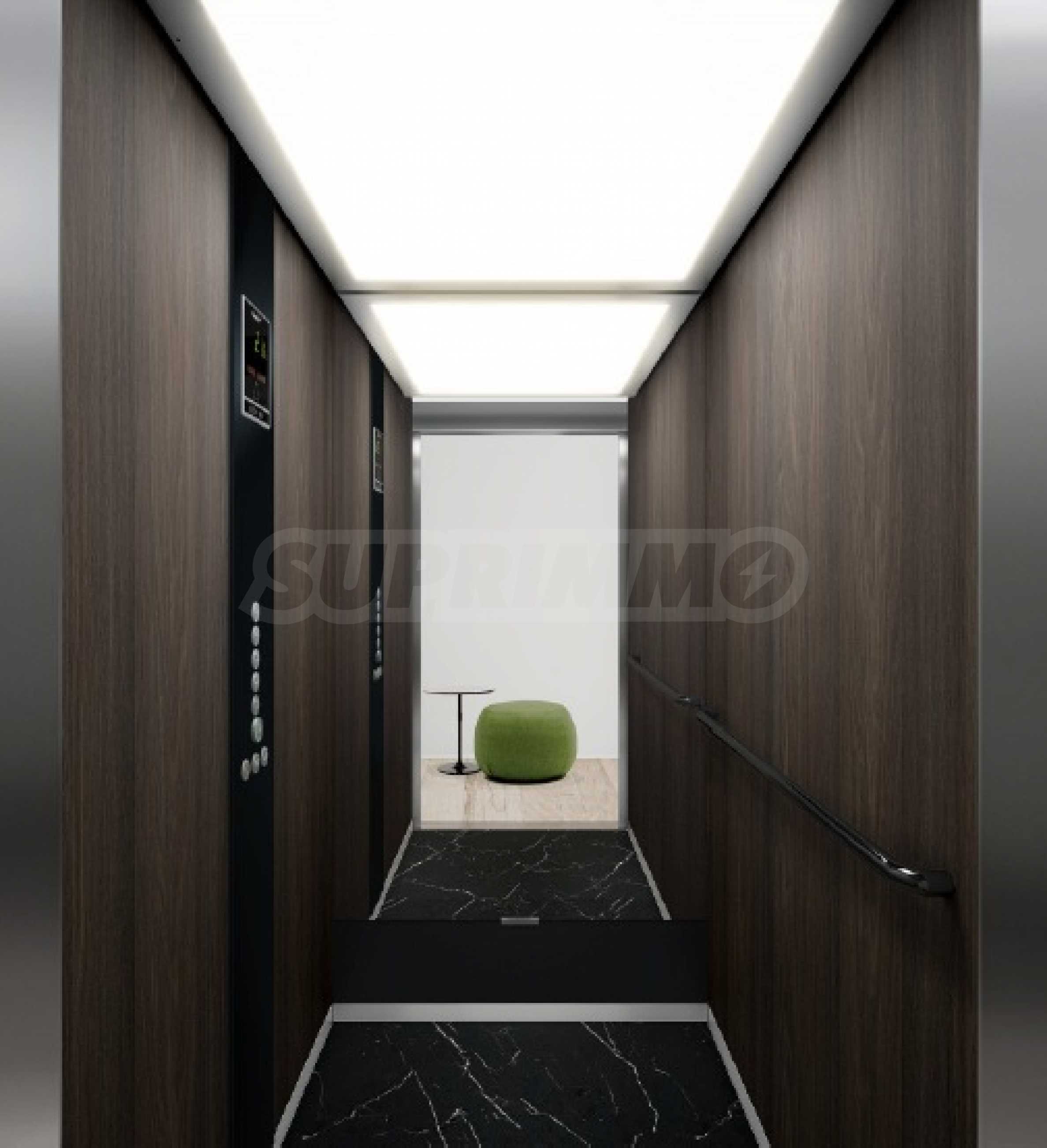 Ciche, nowoczesne windy z oświetleniem LED i automatycznym wyłączaniem po zatrzymaniu. Wnętrze z czarną marmurową podłogą, eleganckim czarnym panelem sterowania i ścianami w kolorze Roasted Coffee Oak.