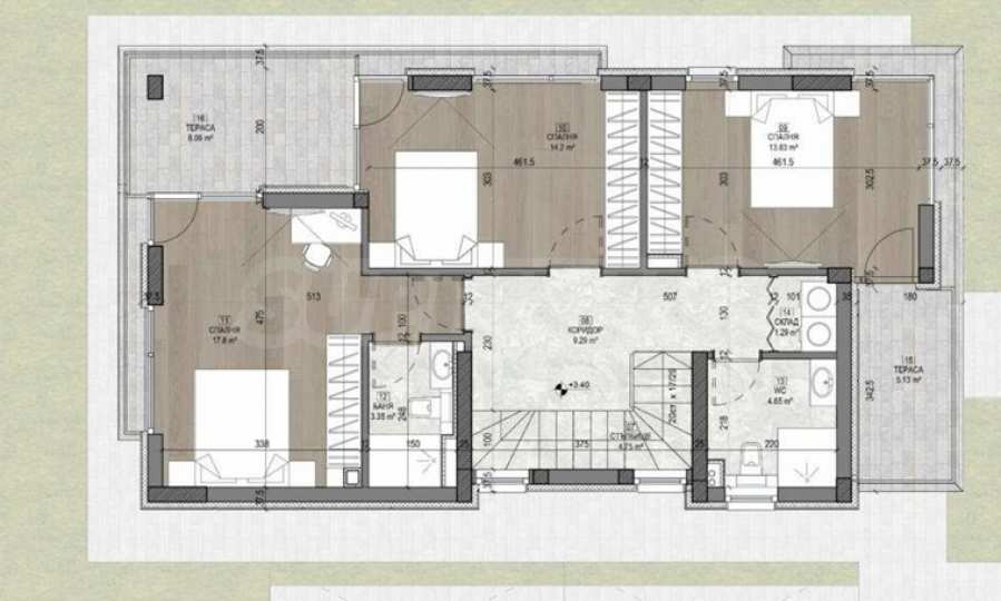 • piętro 2: trzy sypialnie, pomieszczenie gospodarcze, dwie łazienki z toaletą, dwa tarasy.