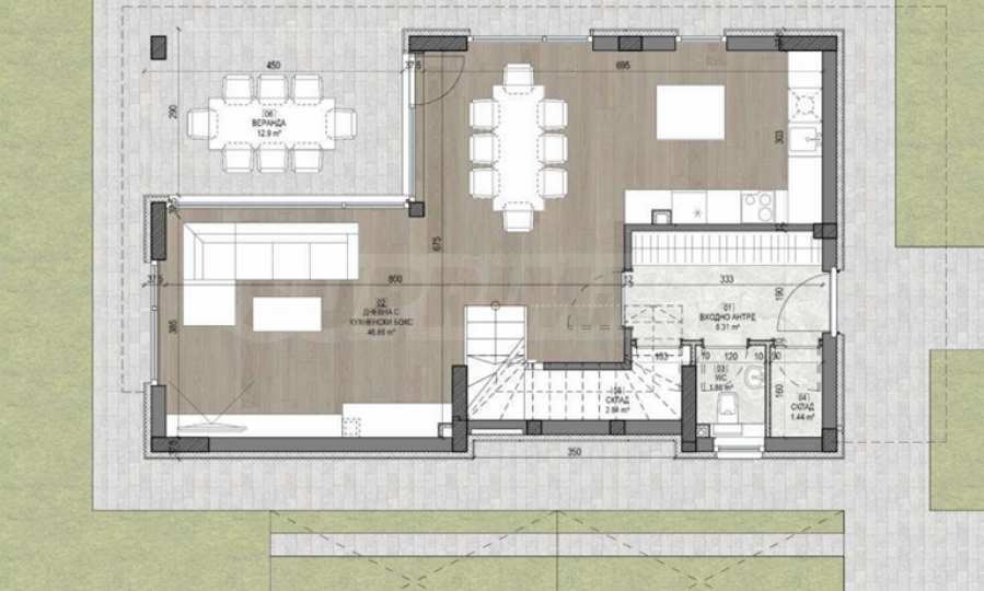 • piętro 1: hol wejściowy, salon z kuchnią, łazienka, pomieszczenie gospodarcze, weranda;