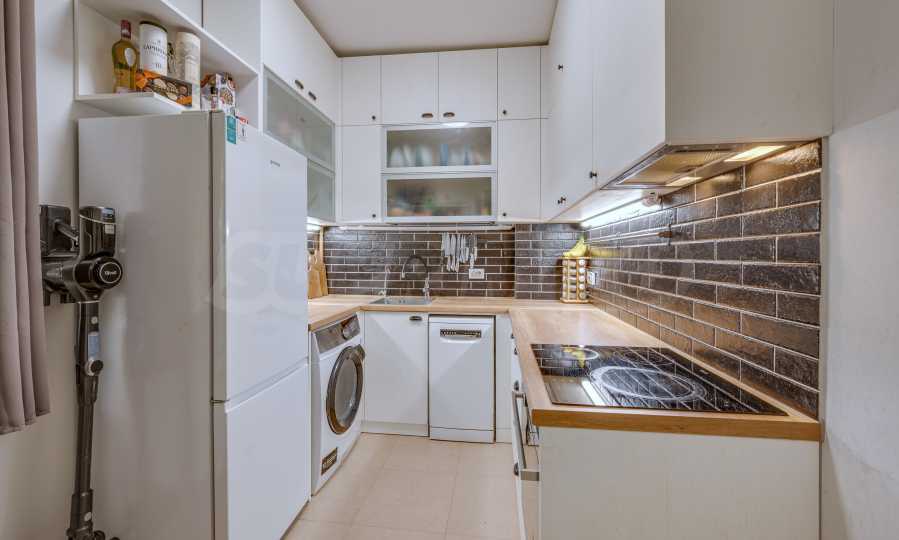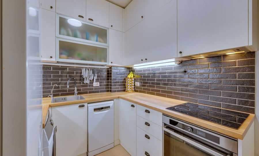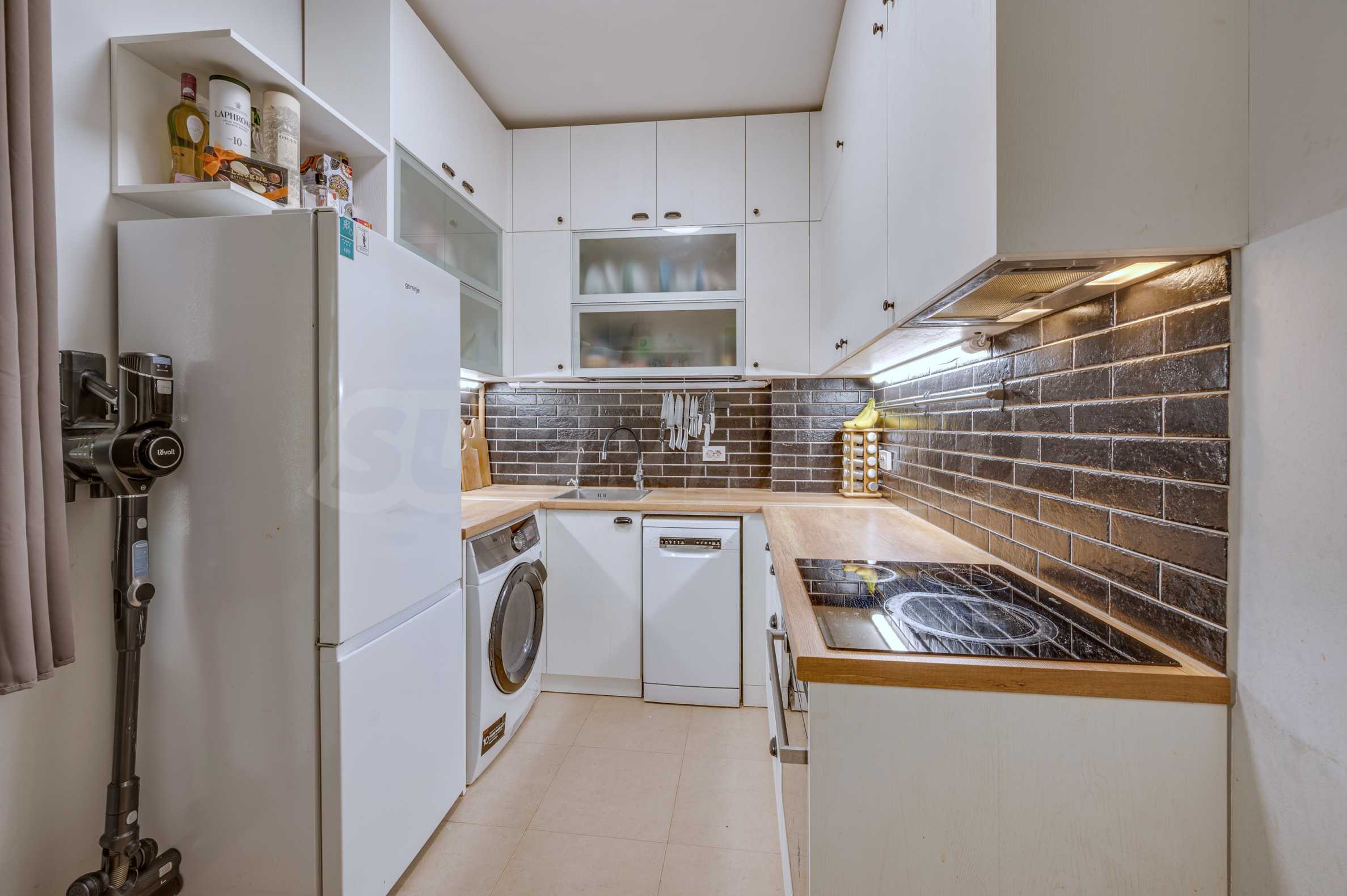 Mieszkanie sprzedawane jest w pełni umeblowane. Kuchnia wyposażona jest w meble na wymiar z licznymi funkcjonalnymi rozwiązaniami do przechowywania oraz wysokiej klasy sprzęt AGD: wbudowany piekarnik i płytę grzewczą Whirlpool z pirolizą, pralkę i suszarkę AEG, zmywarkę BOSCH oraz system oczyszczania wody pitnej.