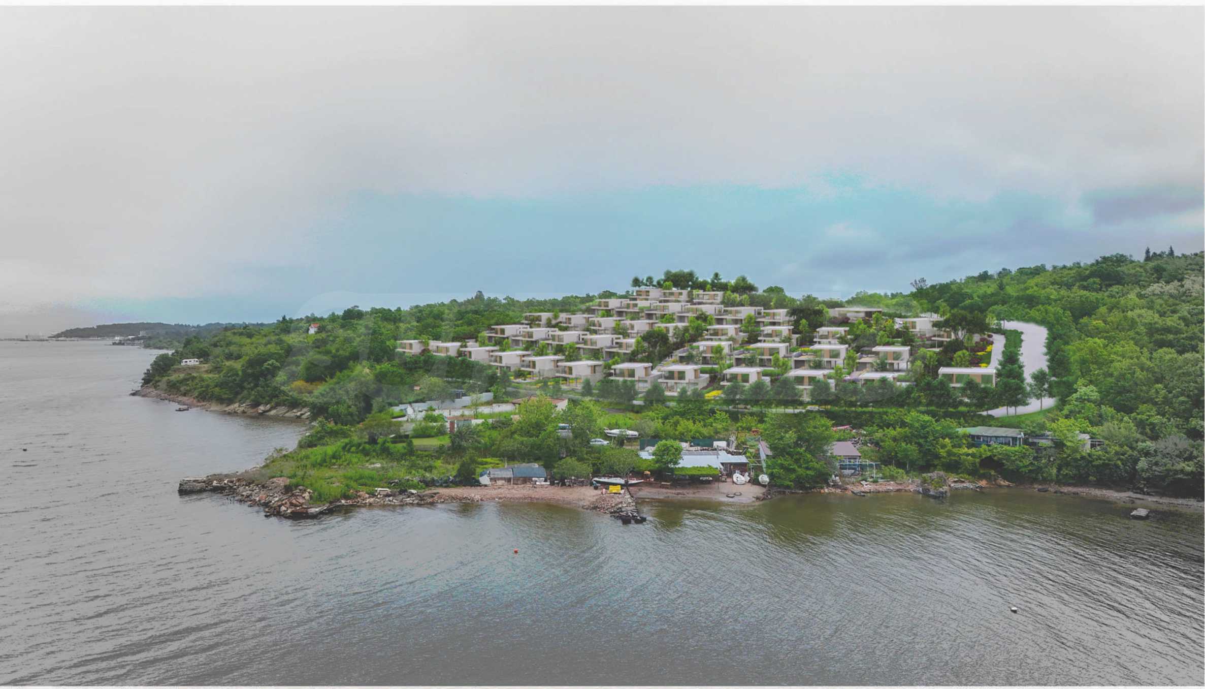 Działka położona jest nad niewielką zatoką, z rozległym widokiem na morze i miasto. Naturalne wzniesienie zapewnia widok na morze z każdego domu i podkreśla naturalne piękno terenu.