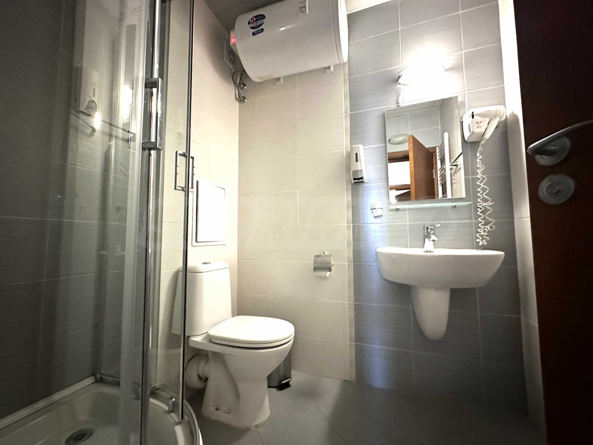 Łazienka wyposażona jest w kabinę prysznicową, umywalkę z lustrem, toaletę i podgrzewacz wody.