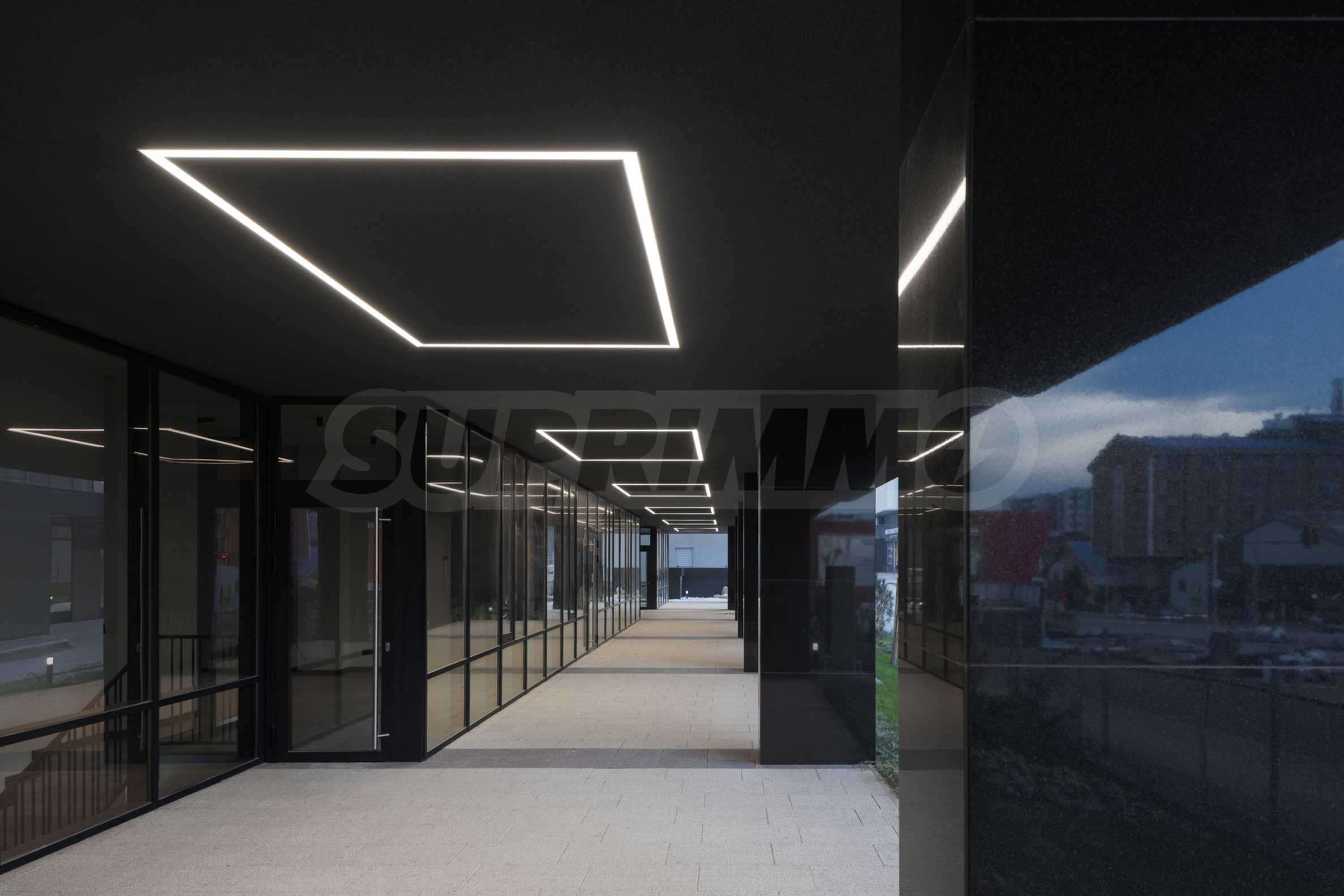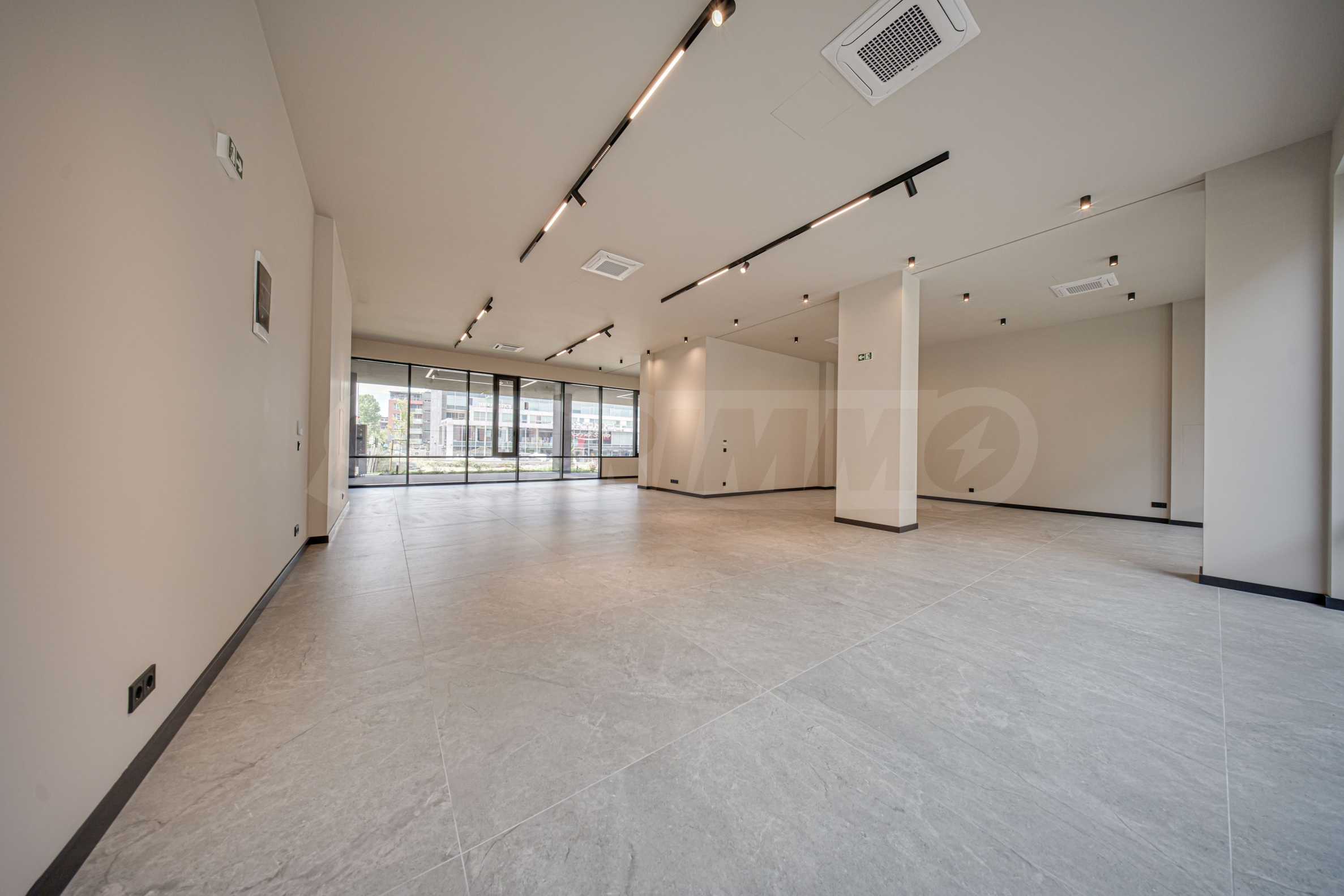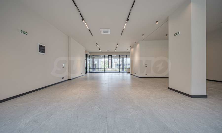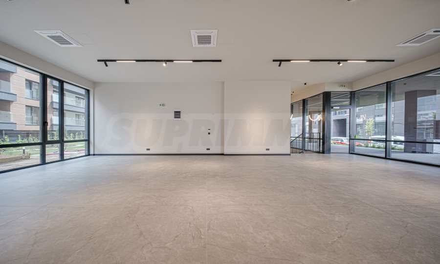W części handlowej budynku znajduje się łącznie 5 lokali handlowych. Są one rozmieszczone na 2 poziomach (z wyjątkiem najmniejszego, który jest jednopoziomowy). Górny poziom znajduje się na parterze budynku (kondygnacja „0”), a dolny na pierwszej kondygnacji podziemnej (kondygnacja „-1”). Oba poziomy połączone są wewnętrznymi schodami, oddzielnymi dla każdego lokalu. Każde z wejść do lokali handlowych znajduje się bezpośrednio na parterze budynku i ma bezpośrednie wejście z ulicy. Sama część handlowa jest oddzielona od wejść do części mieszkalnej i biurowej budynku. Powierzchnia dostępnych lokali waha się od 106,32 m² do 259,76 m², wliczając powierzchnie wspólne. Główne i większe witryny lokali handlowych znajdują się na parterze, od strony zachodniej fasady budynku, od strony bulwaru Simeonovsko Shose. Obiekty posiadają również niewielkie witryny sklepowe po drugiej, wschodniej stronie budynku, dzięki czemu są widoczne z obu długich fasad budynku (wschodniej i zachodniej).
