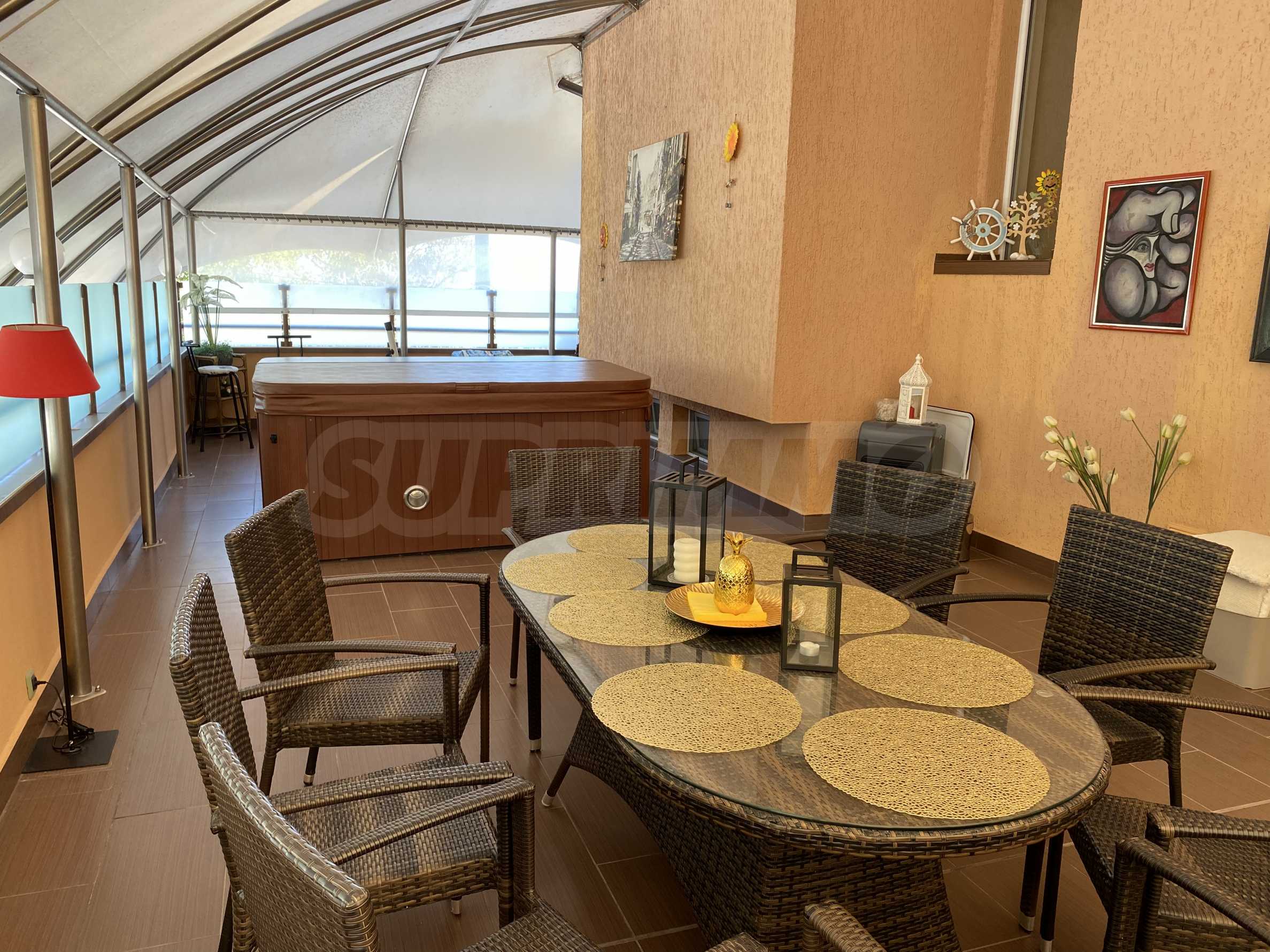 • Drugie piętro - cztery sypialnie, dwie łazienki z toaletą, duży zadaszony taras ze stołem jadalnym i jacuzzi.
