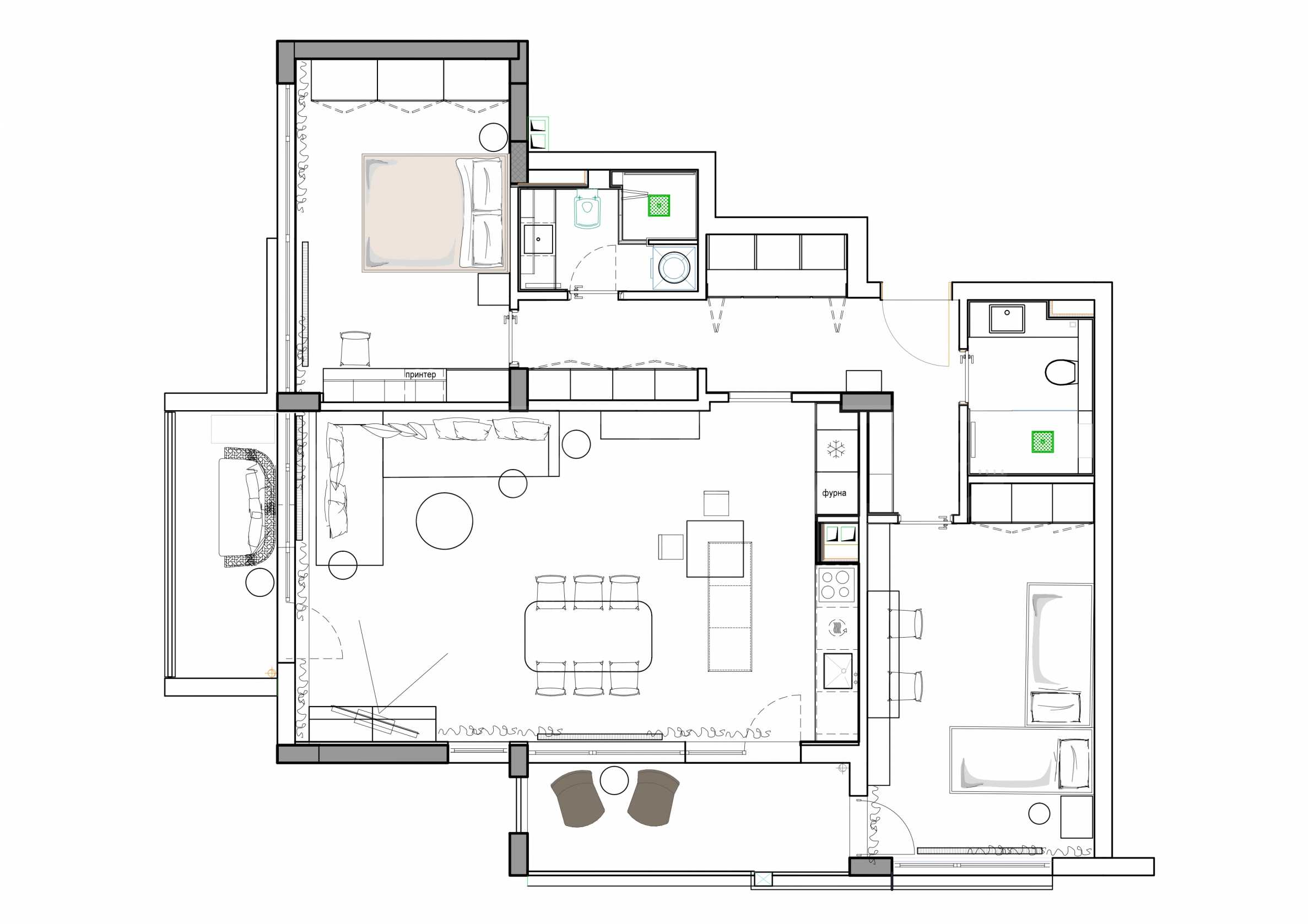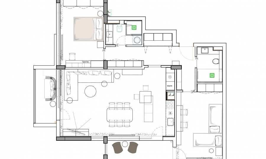 • jasny i przestronny salon z miejscem na kuchnię i jadalnię;