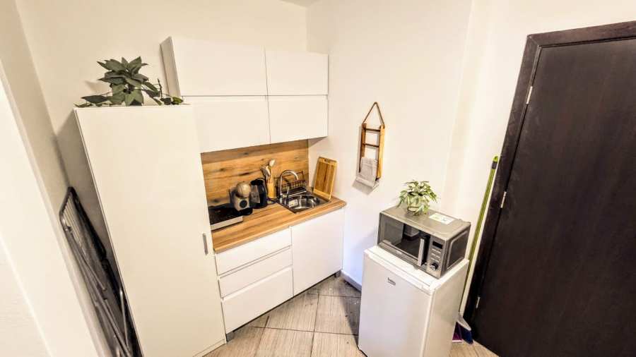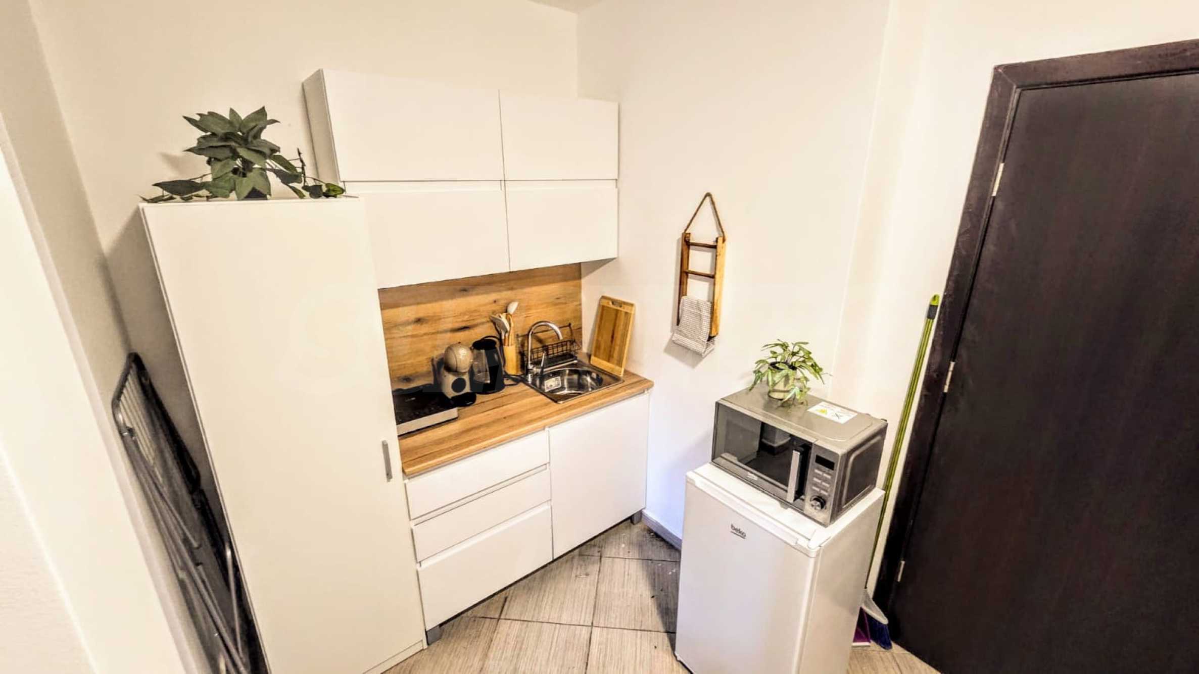 Mieszkanie jest umeblowane i wyposażone w dwupalnikową kuchenkę, piekarnik elektryczny, okap, lodówkę, zlew, szafki na przybory i naczynia, stół jadalny z dwoma krzesłami, telewizor, sypialnię, sofę, szafę, łazienkę z kabiną prysznicową, toaletę, umywalkę z lustrem.