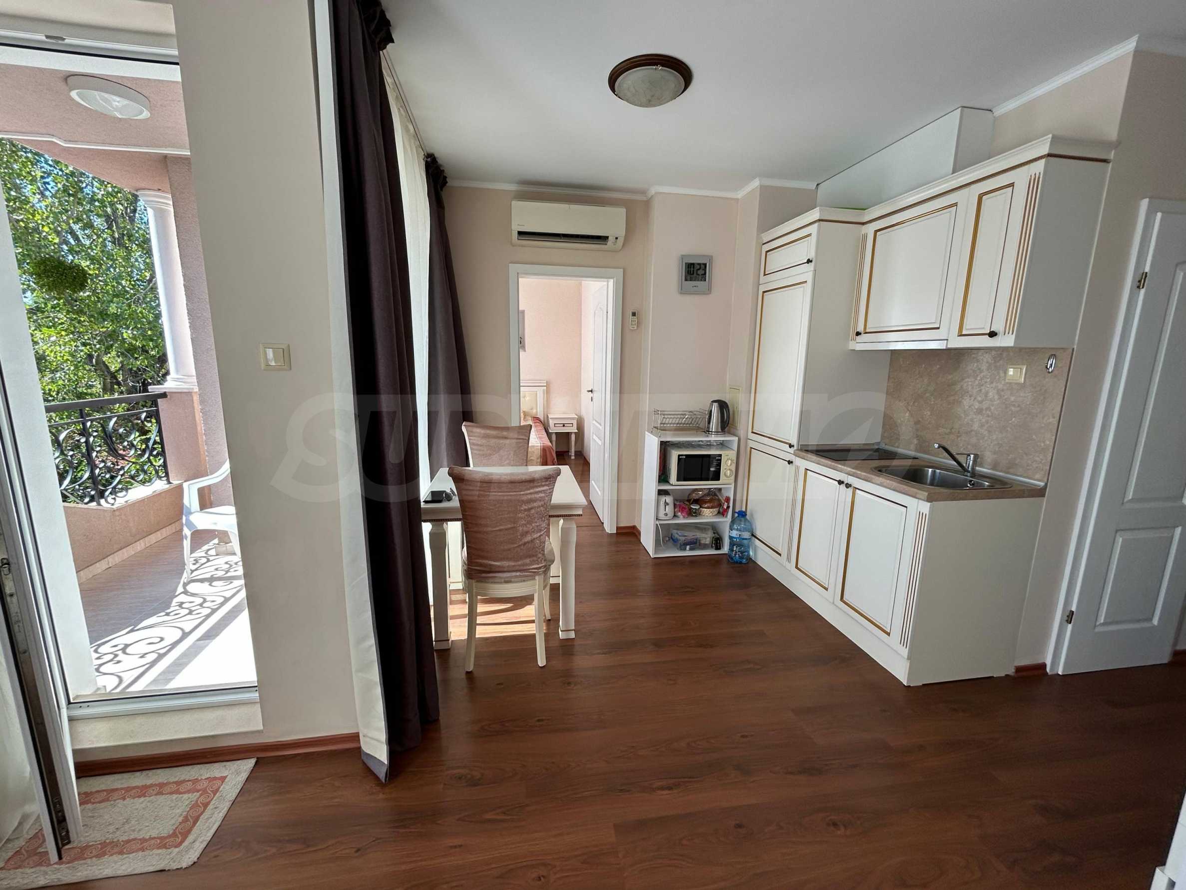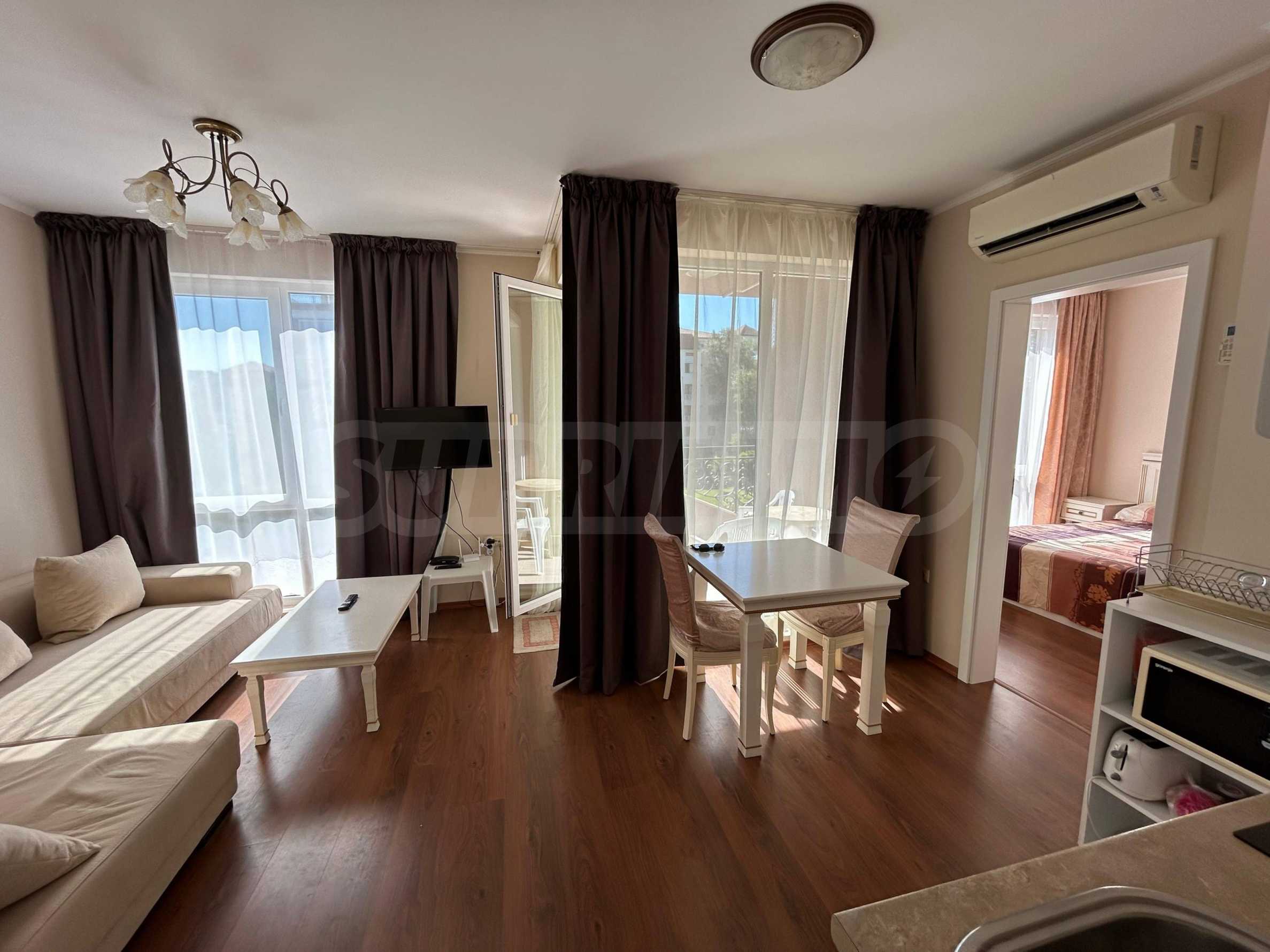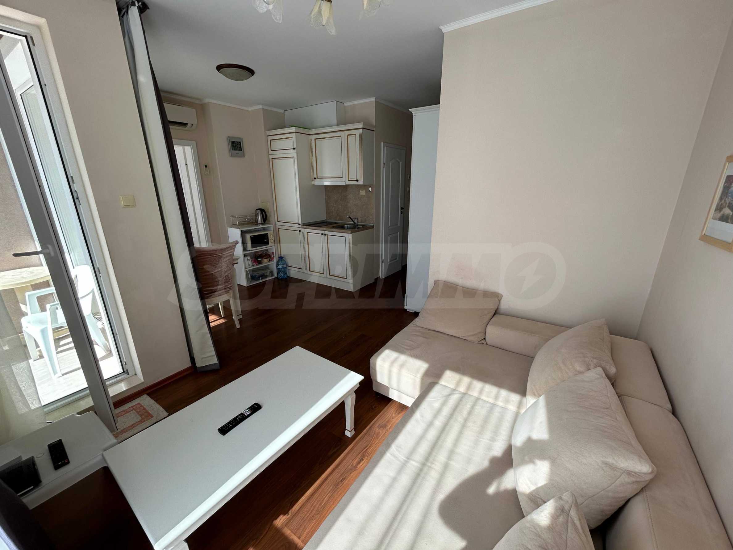 Oferujemy do sprzedaży mieszkanie jednopokojowe na ogrodzonym osiedlu, 200 metrów od aquaparku i 10 minut spacerem od plaży Słonecznego Brzegu.