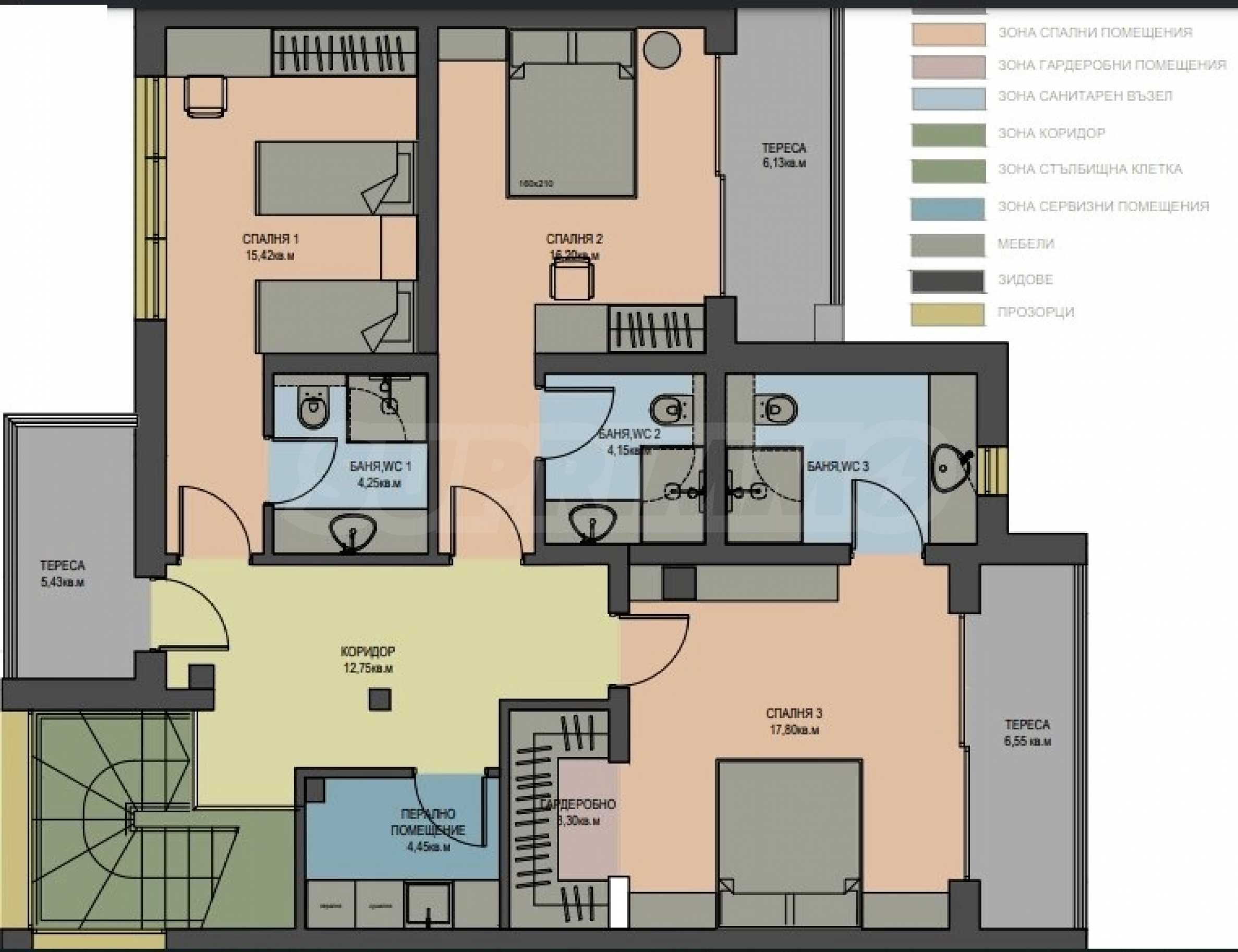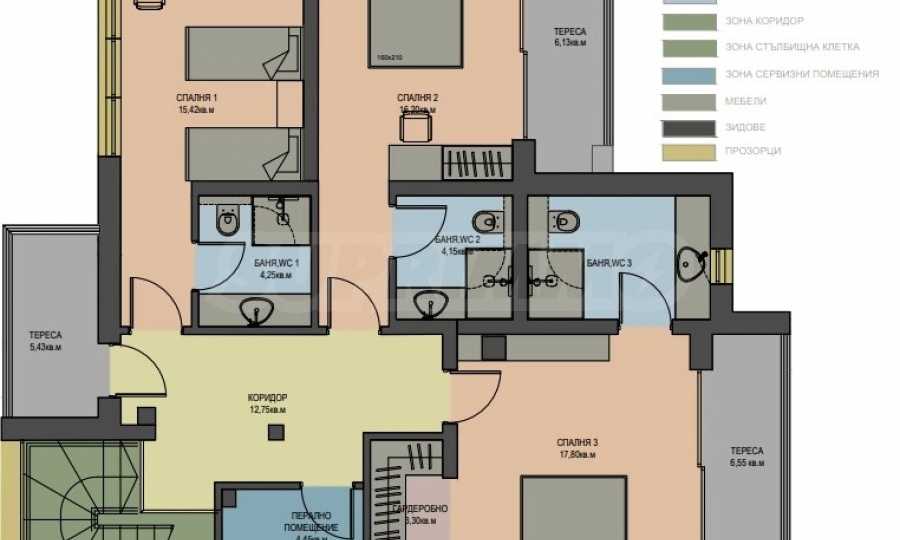 • drugie piętro - korytarz, trzy sypialnie, trzy łazienki z toaletą, pralnia, trzy tarasy.
