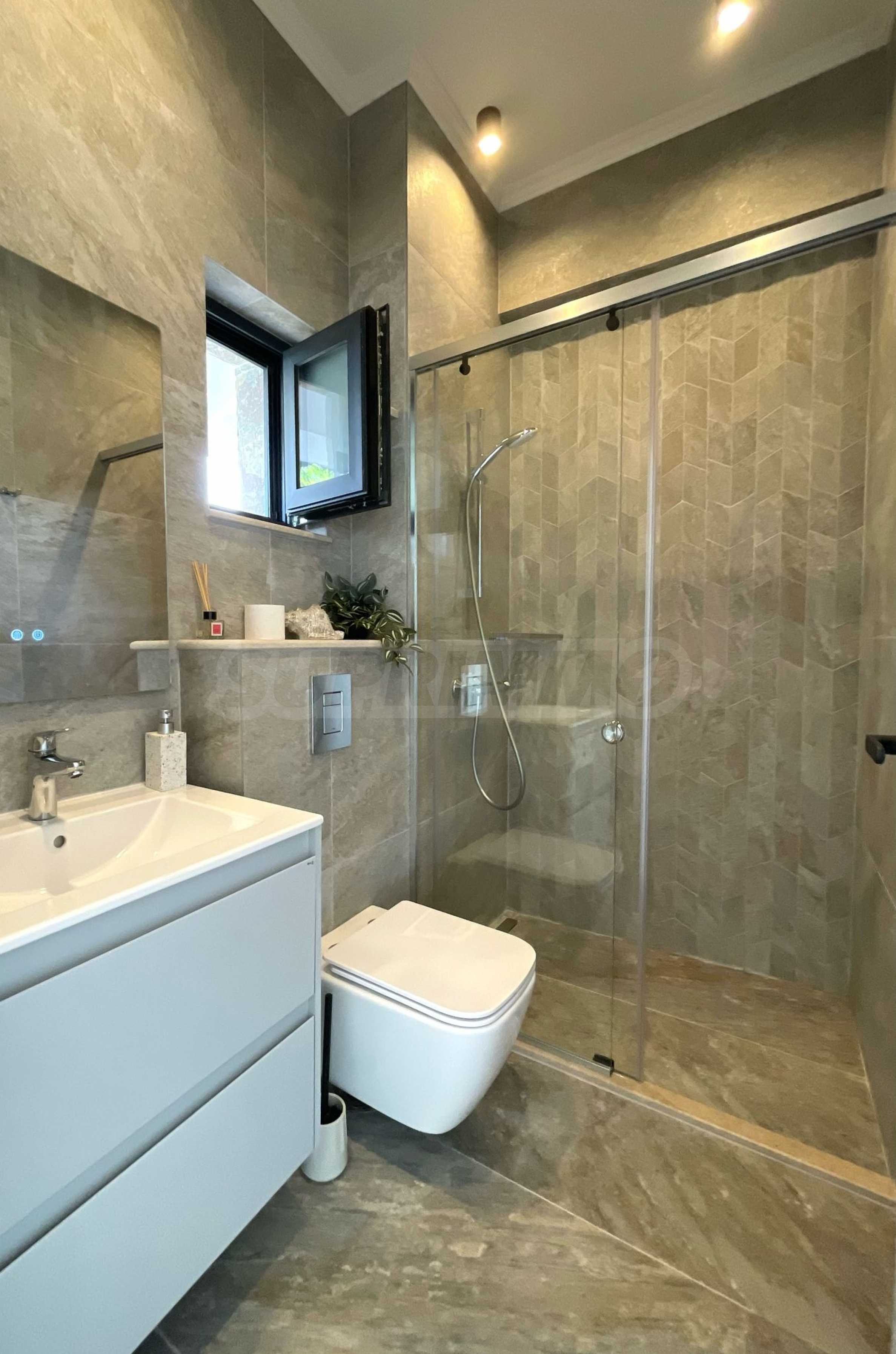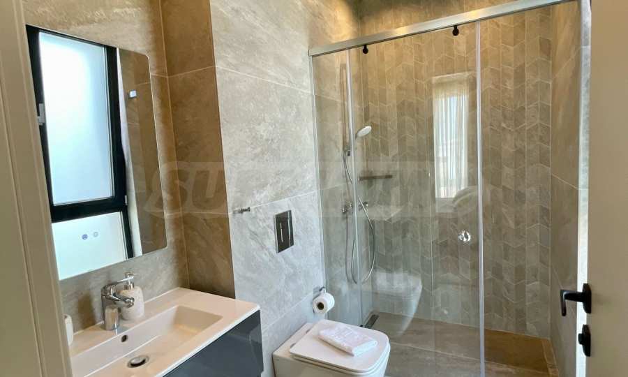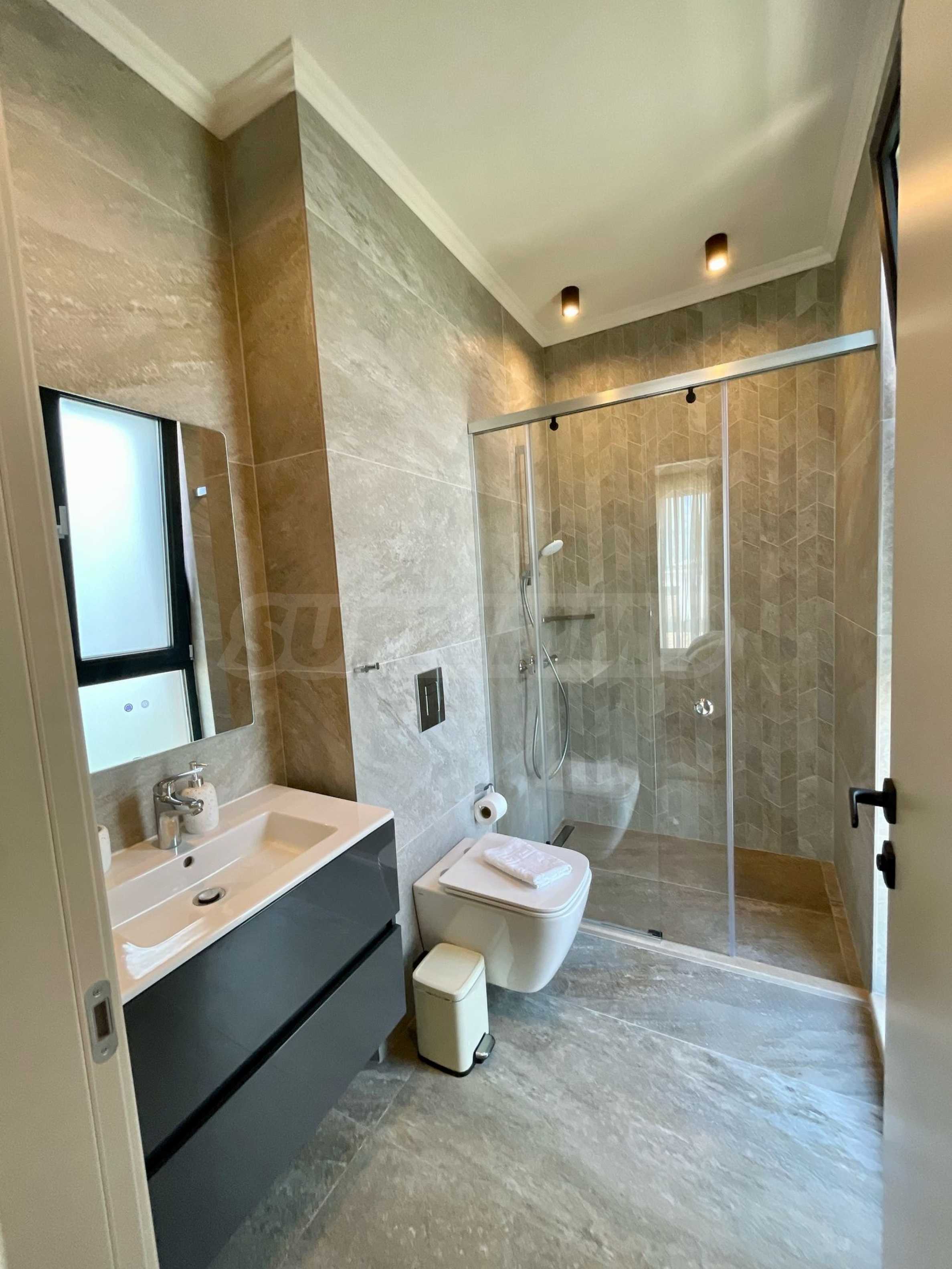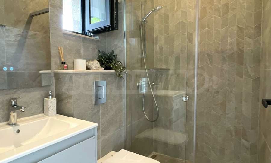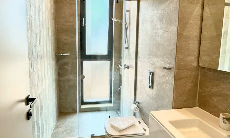 • W pełni wykończone łazienki według projektu wnętrza z włoskimi płytkami granitowymi i efektem 3D na ścianach. Zabudowy Grohe. Przesuwne szklane ścianki działowe w kabinach prysznicowych;