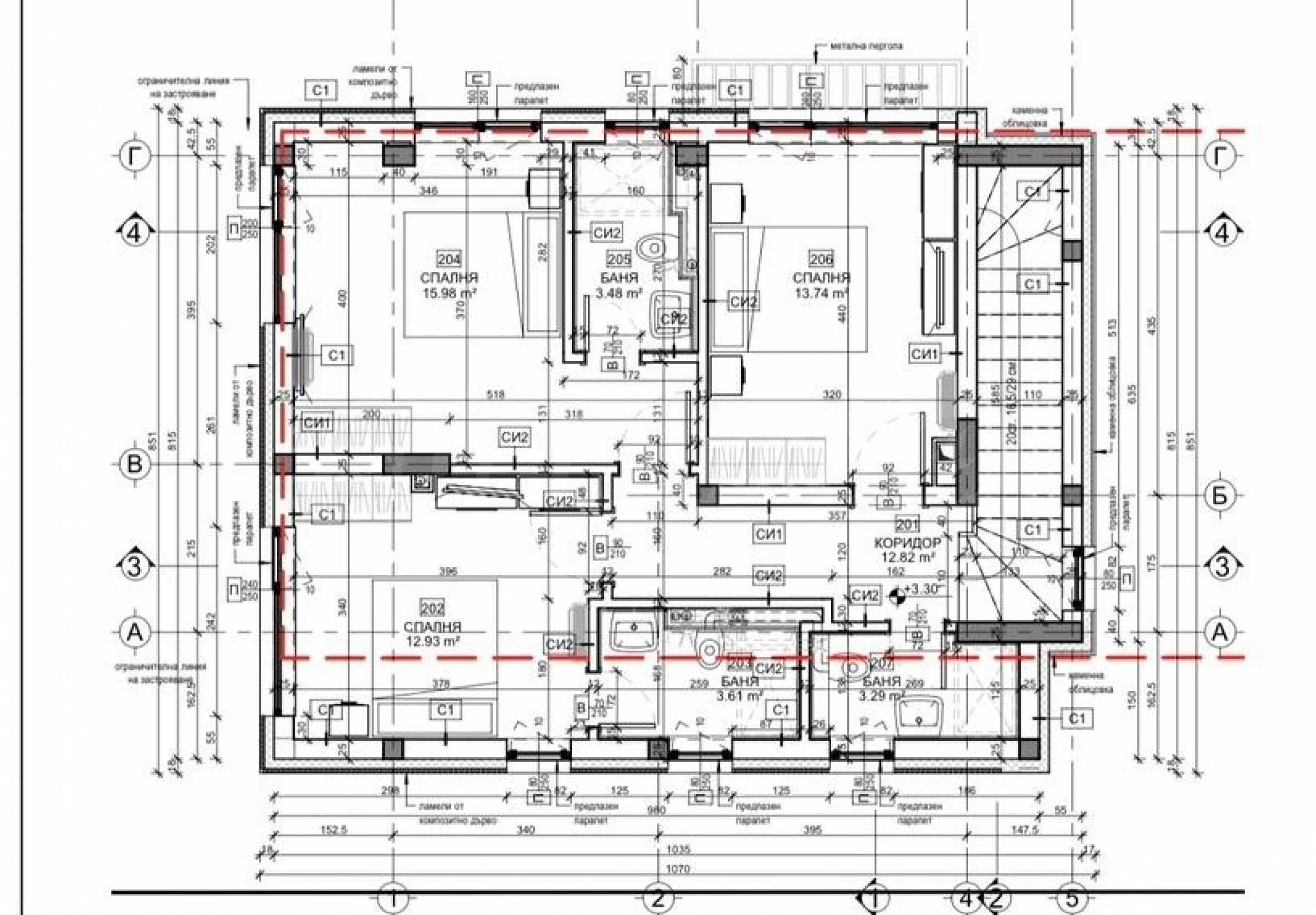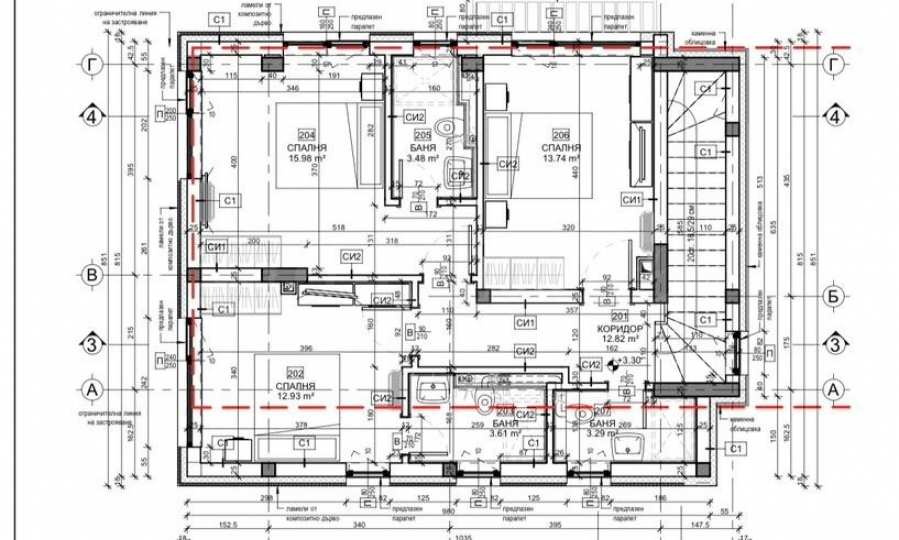• Piętro 2: trzy sypialnie, trzy łazienki, korytarz.