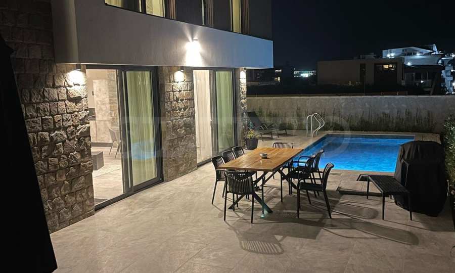 • Piętro 1: hol wejściowy, salon z jadalnią i kuchnią, łazienka z toaletą, pomieszczenie gospodarcze, wewnętrzne schody, weranda z wyjściem na basen;