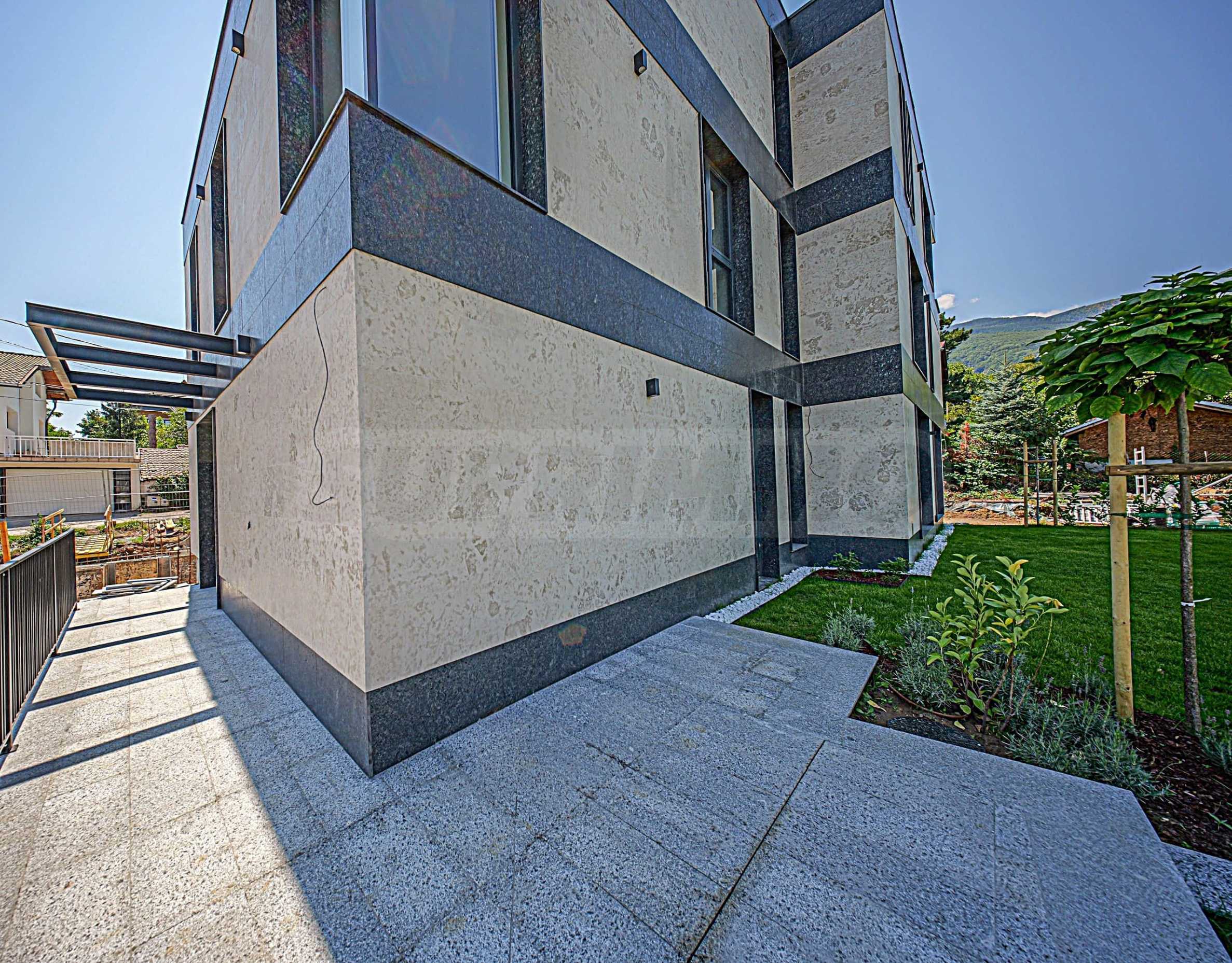 • Cegły Wienerberger, izolacja termiczna o grubości 20 cm z powłoką wykończeniową w połączeniu kamienia naturalnego, wapienia i granitu;