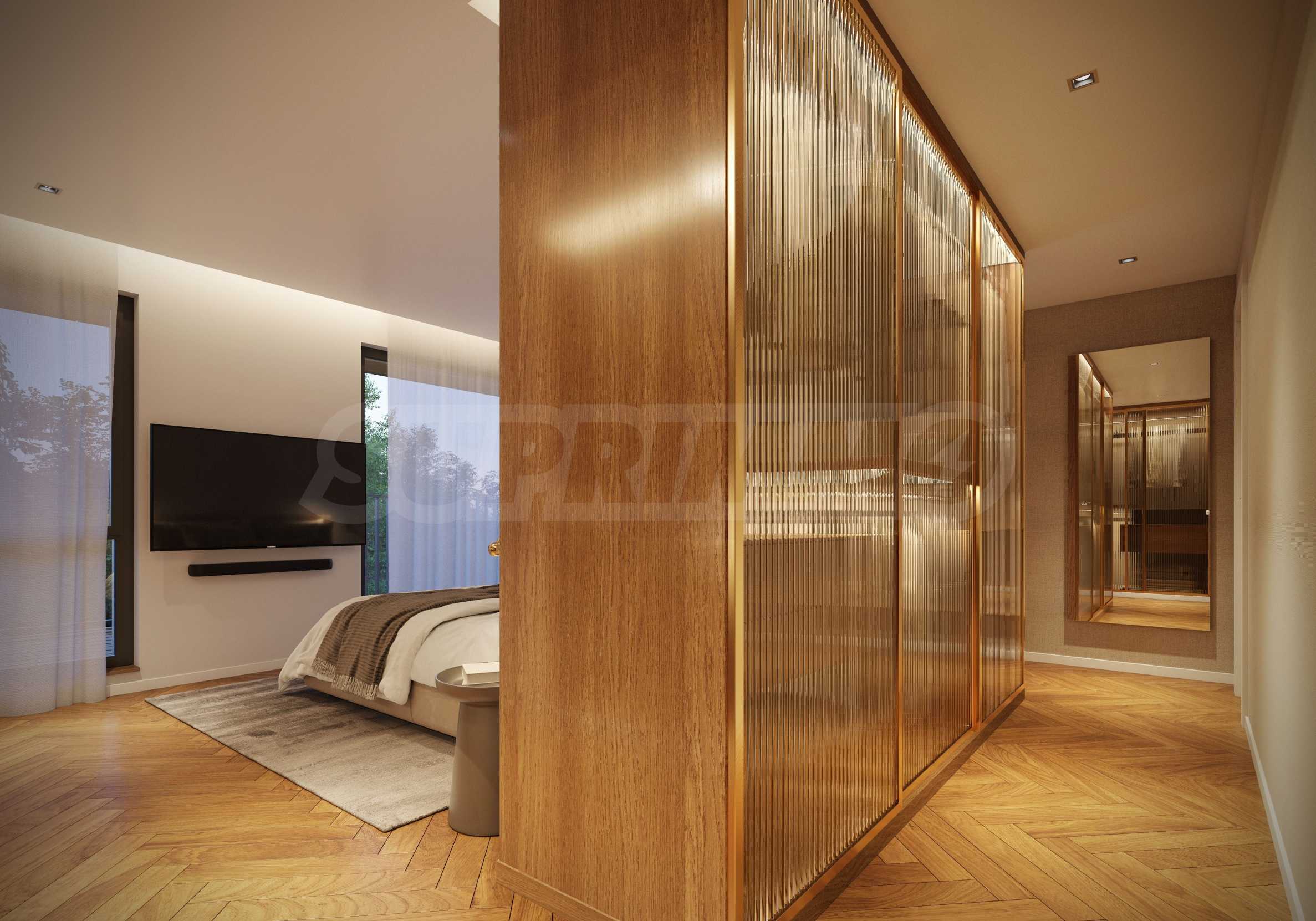 • Drugie piętro – trzy sypialnie z trzema łazienkami, dwiema garderobami, tarasem i korytarzem;