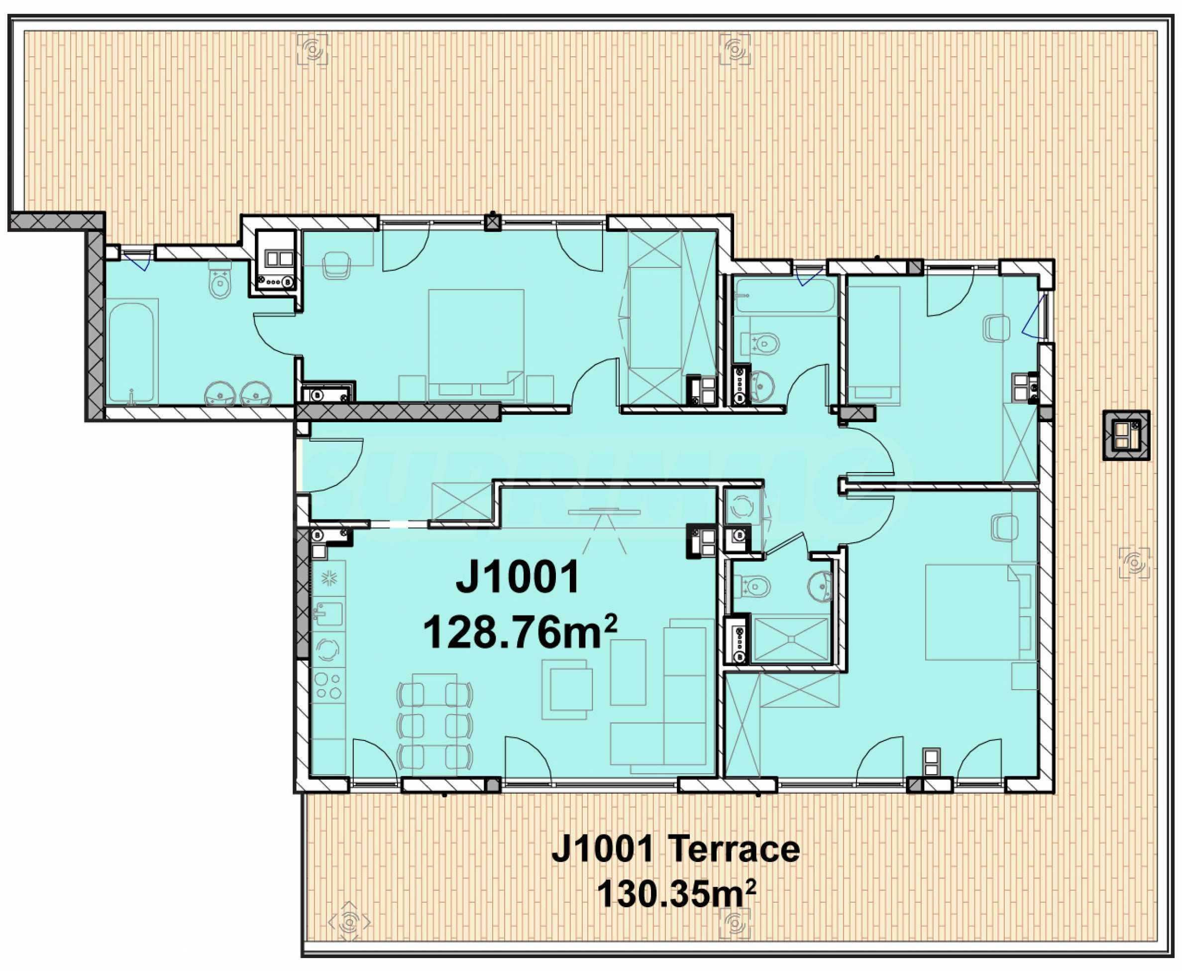Układ nieruchomości: powierzchnia całkowita 151,97 m2 (powierzchnia netto 128,76 m2 + powierzchnie wspólne 23,21 m2), z tarasem o powierzchni 153,55 m2, położonym na dziesiątym piętrze.