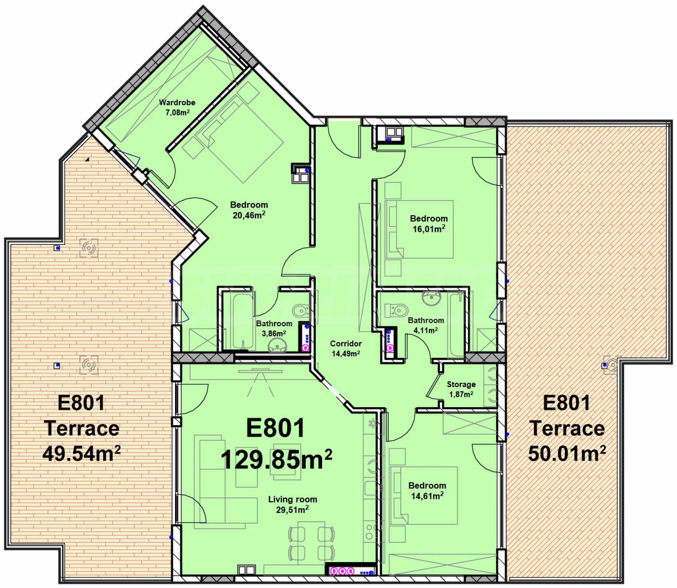 Układ nieruchomości: powierzchnia całkowita 158,59 m2 (powierzchnia netto 129,85 m2 + powierzchnie wspólne 28,74 m2), z tarasem o powierzchni 121,57 m2, położonym na dziesiątym piętrze.