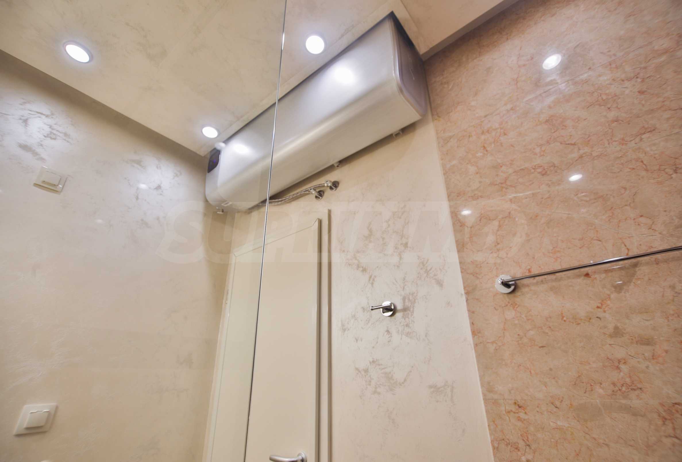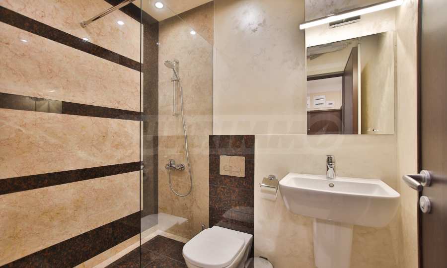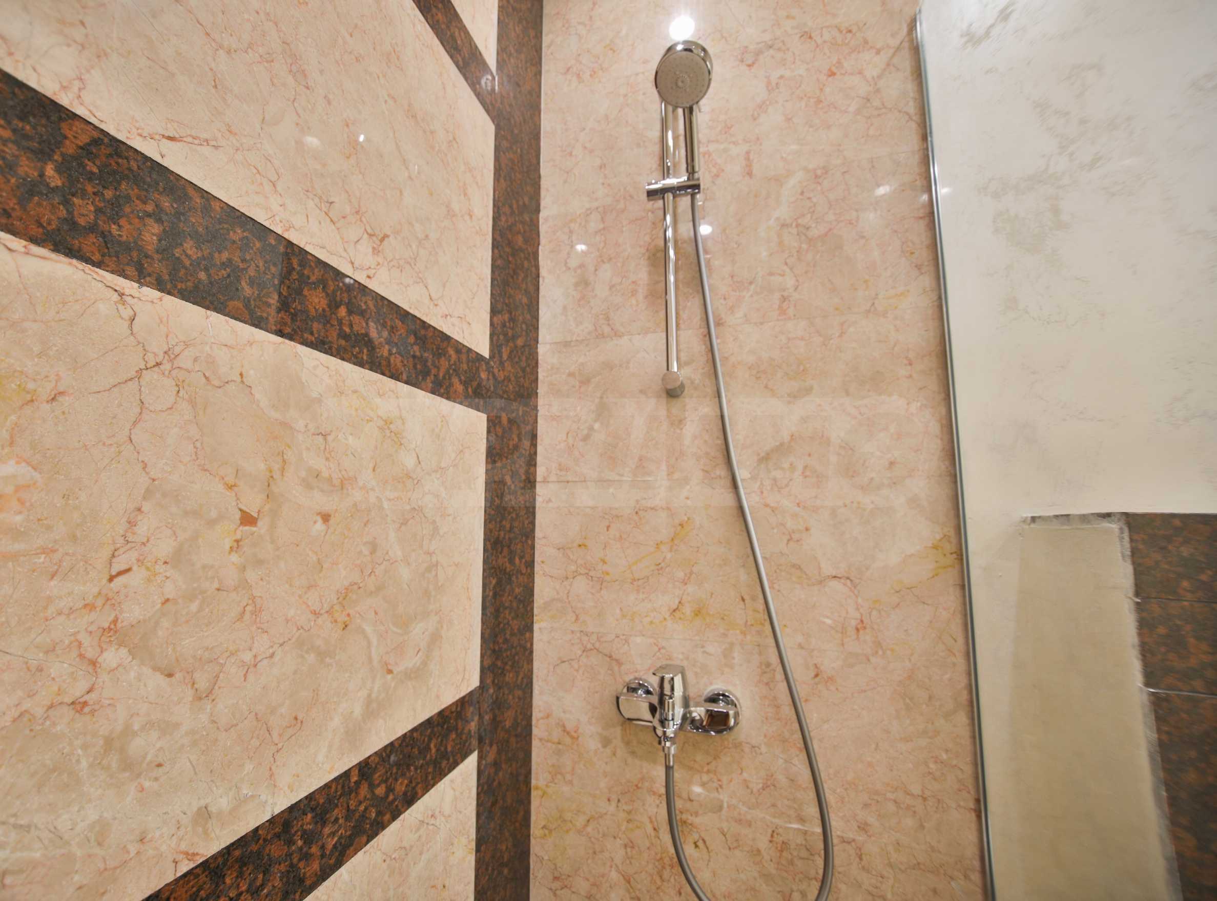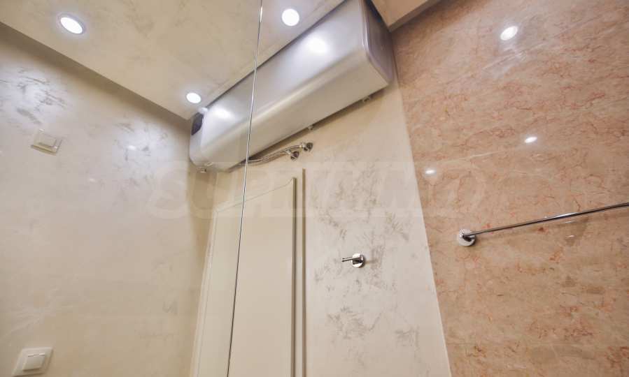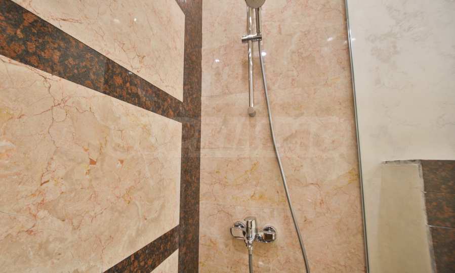 Podłogi we wszystkich pomieszczeniach apartamentu wykonane są z białego marmuru. Łazienka wyłożona jest w całości naturalnym kamieniem – trawertynem i innymi odmianami – i wyposażona w kabinę prysznicową oraz duży, poziomy podgrzewacz wody Ariston.