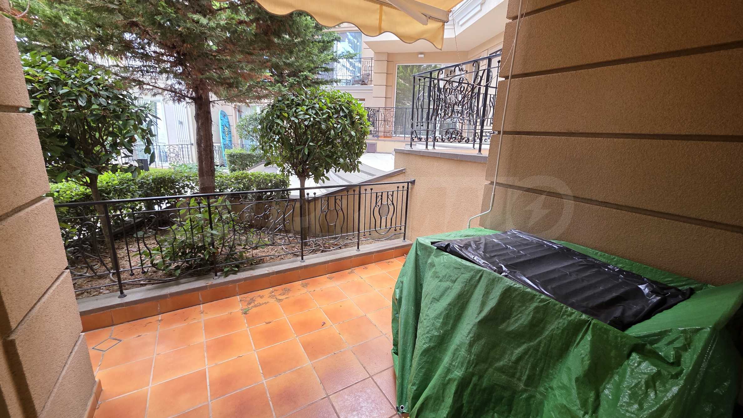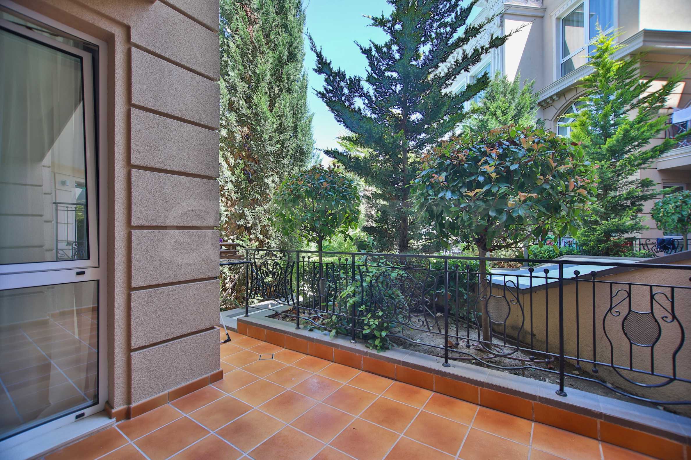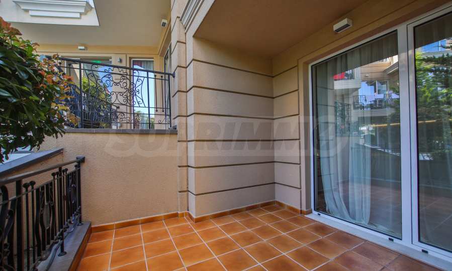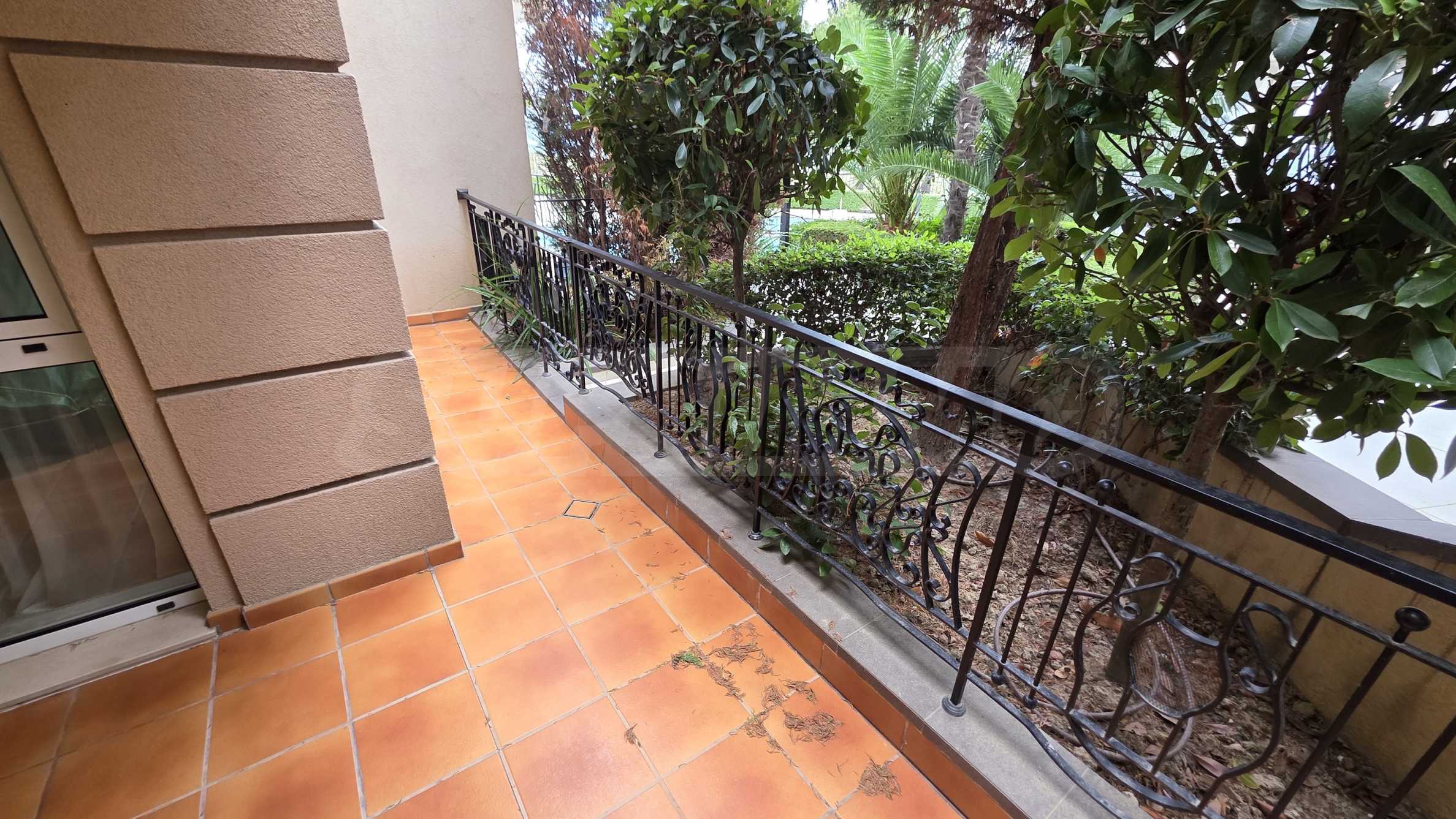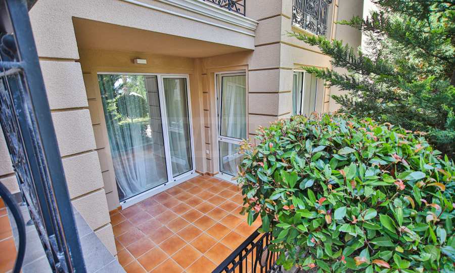 Apartament znajduje się na parterze budynku i posiada dużą werandę z widokiem na basen i zagospodarowany dziedziniec kompleksu, a także drugi, mniejszy taras przy sypialni. Mieszkanie jest w pełni umeblowane na zamówienie i wyposażone w meble wolnostojące renomowanych marek. Sprzęt AGD pochodzi głównie z prestiżowej marki Bosch – pralka, zmywarka, piekarnik, lodówka do zabudowy z oddzielnym zamrażalnikiem. Duża ogrodowa weranda została wyłożona płytkami klinkierowymi i wyposażona w komplet mebli ogrodowych – dużą sofę i fotel ze stolikiem kawowym, telewizor na uchwycie sufitowym, a także markizę chroniącą przed słońcem i deszczem, którą można rozciągnąć i zwinąć za pomocą korby. Mały taras przy sypialni również wyposażono w rozkładaną markizę. Taras ogrodowy otoczony jest pięknym, kutym ogrodzeniem i furtką, która zapewnia bezpośrednie wyjście do ogrodu kompleksu i na teren basenu.