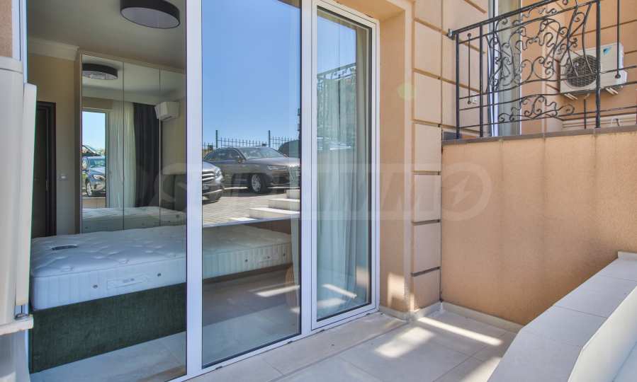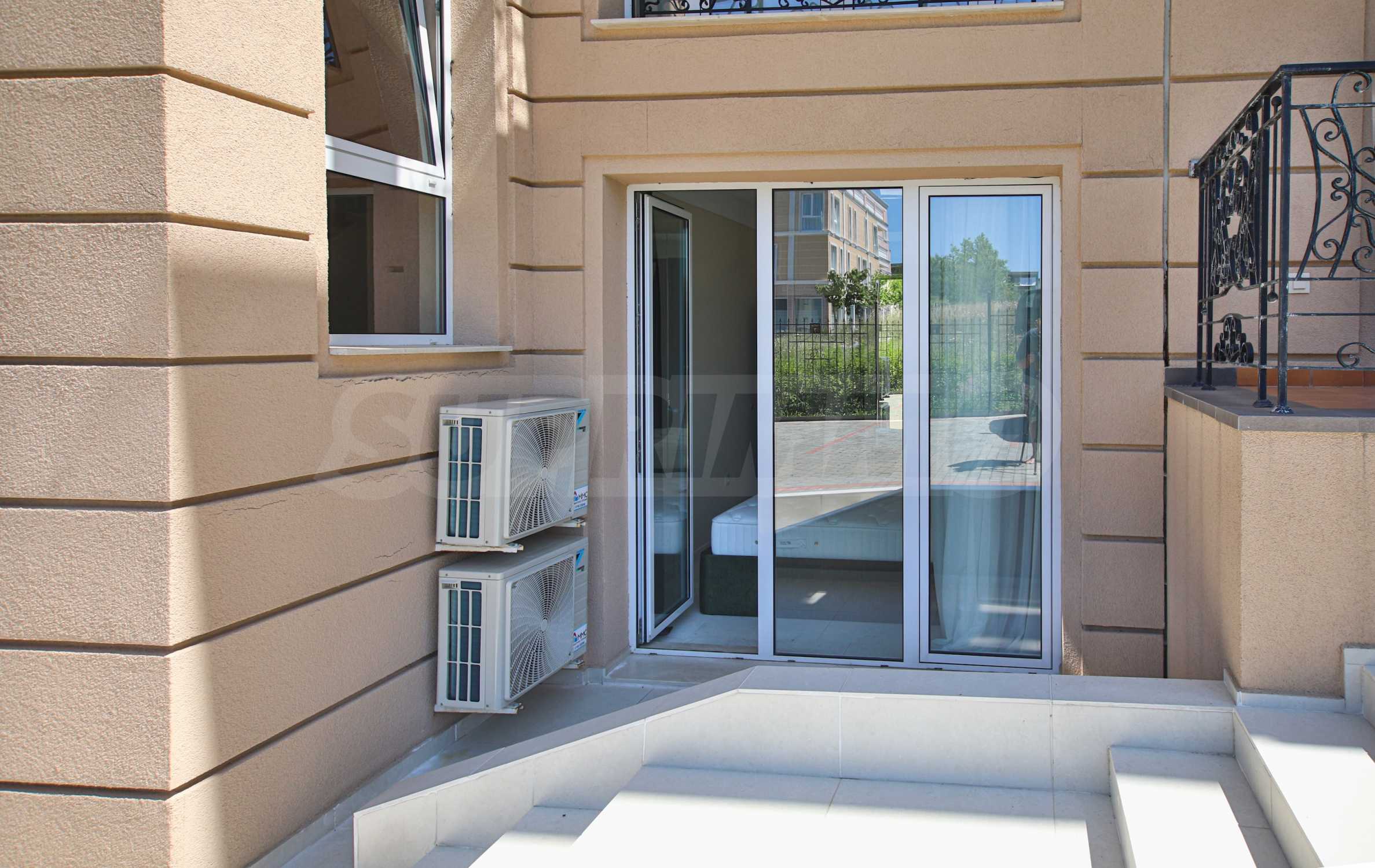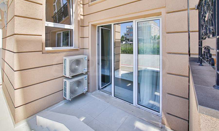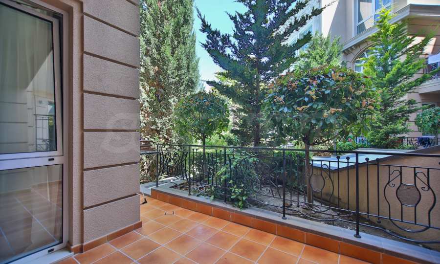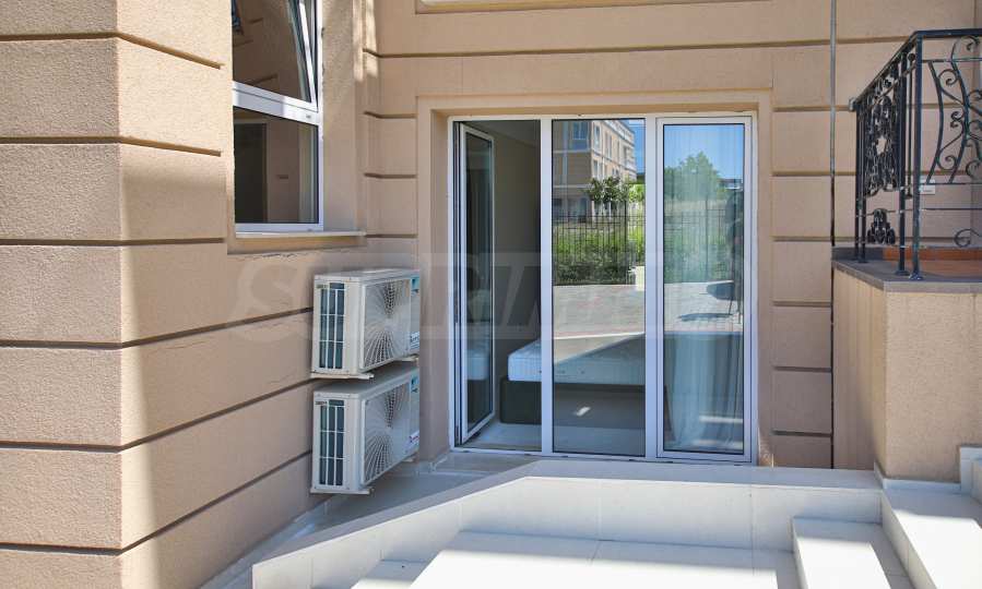 Apartament znajduje się na parterze budynku i posiada dużą werandę z widokiem na basen i zagospodarowany dziedziniec kompleksu, a także drugi, mniejszy taras przy sypialni. Mieszkanie jest w pełni umeblowane na zamówienie i wyposażone w meble wolnostojące renomowanych marek. Sprzęt AGD pochodzi głównie z prestiżowej marki Bosch – pralka, zmywarka, piekarnik, lodówka do zabudowy z oddzielnym zamrażalnikiem. Duża ogrodowa weranda została wyłożona płytkami klinkierowymi i wyposażona w komplet mebli ogrodowych – dużą sofę i fotel ze stolikiem kawowym, telewizor na uchwycie sufitowym, a także markizę chroniącą przed słońcem i deszczem, którą można rozciągnąć i zwinąć za pomocą korby. Mały taras przy sypialni również wyposażono w rozkładaną markizę. Taras ogrodowy otoczony jest pięknym, kutym ogrodzeniem i furtką, która zapewnia bezpośrednie wyjście do ogrodu kompleksu i na teren basenu.