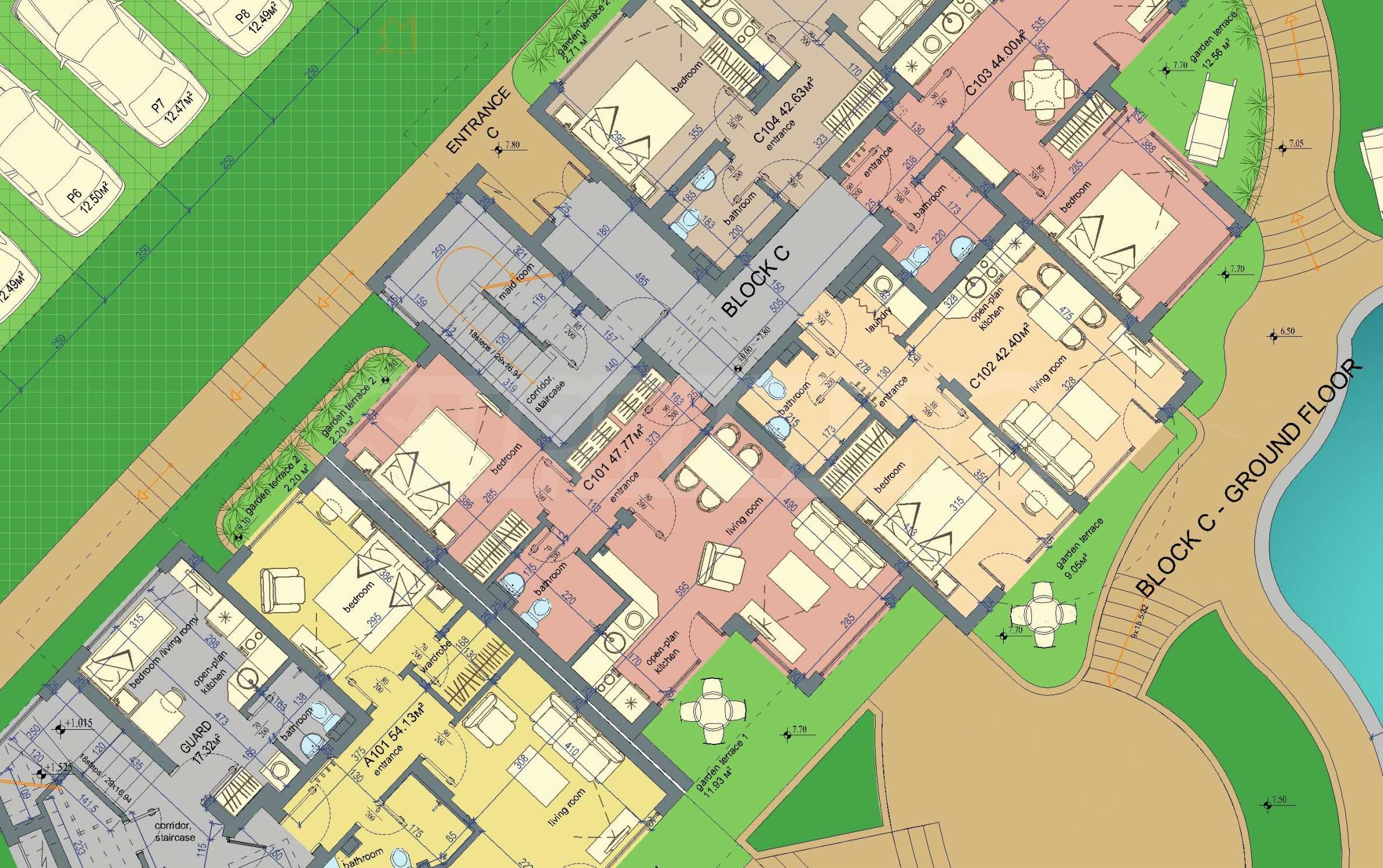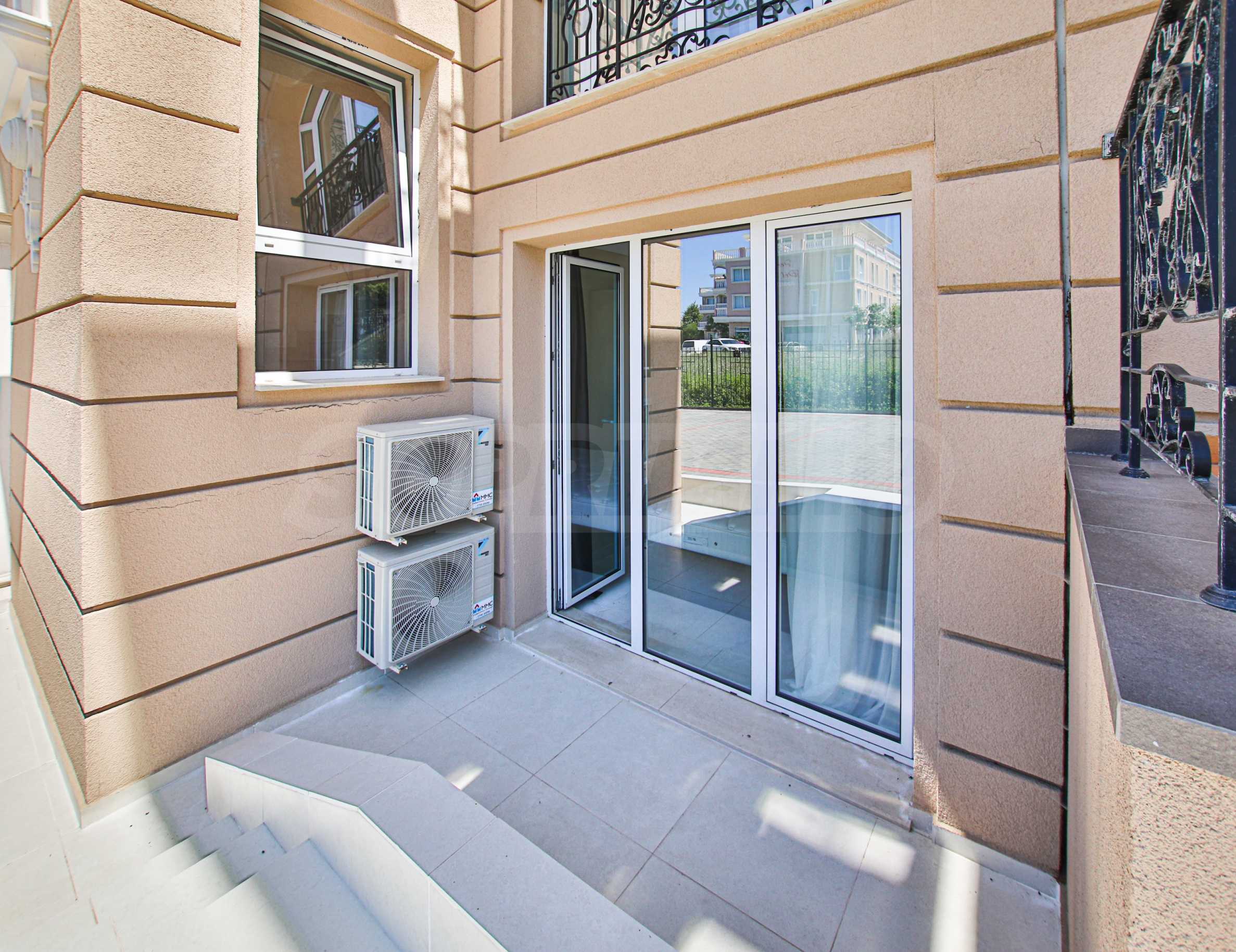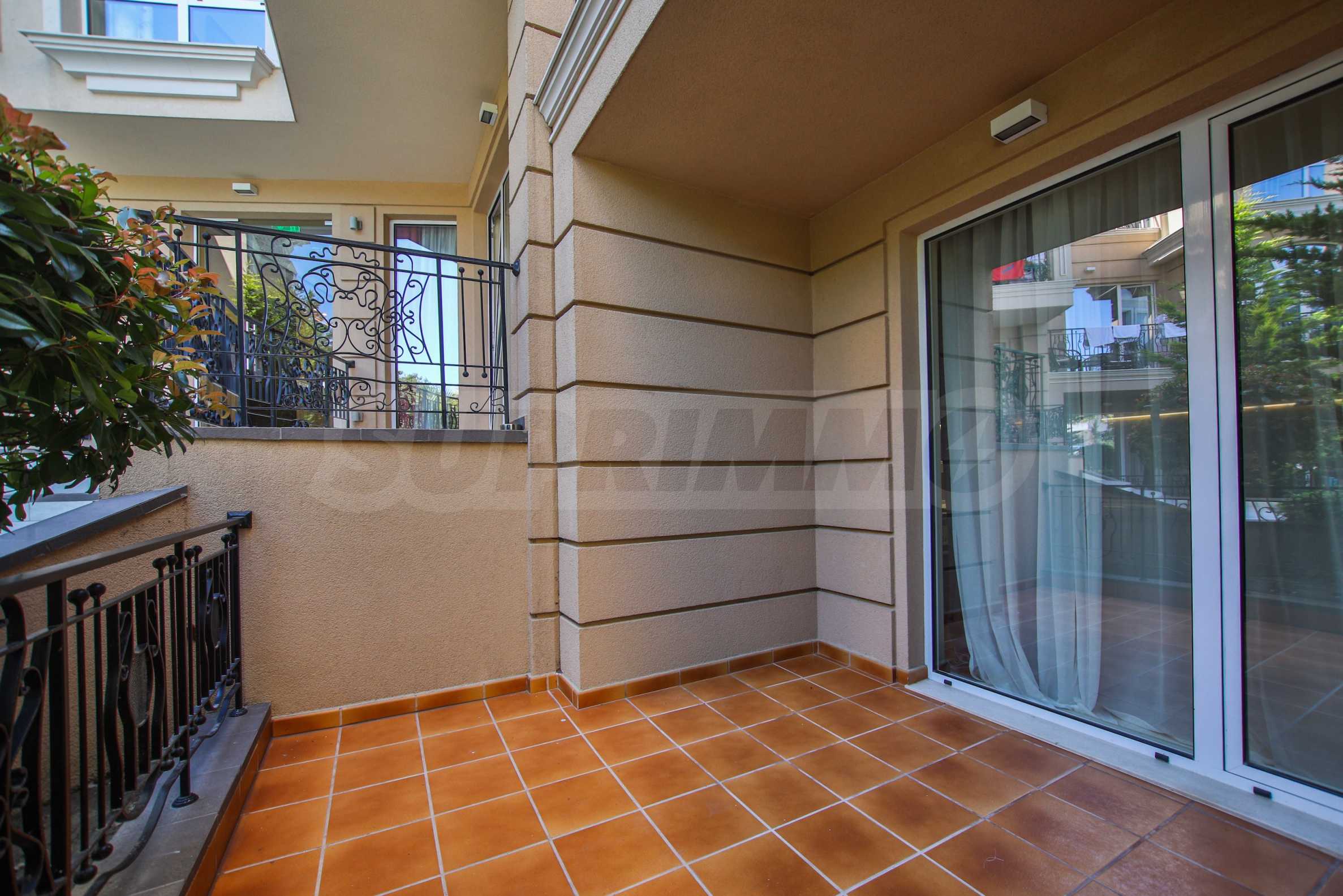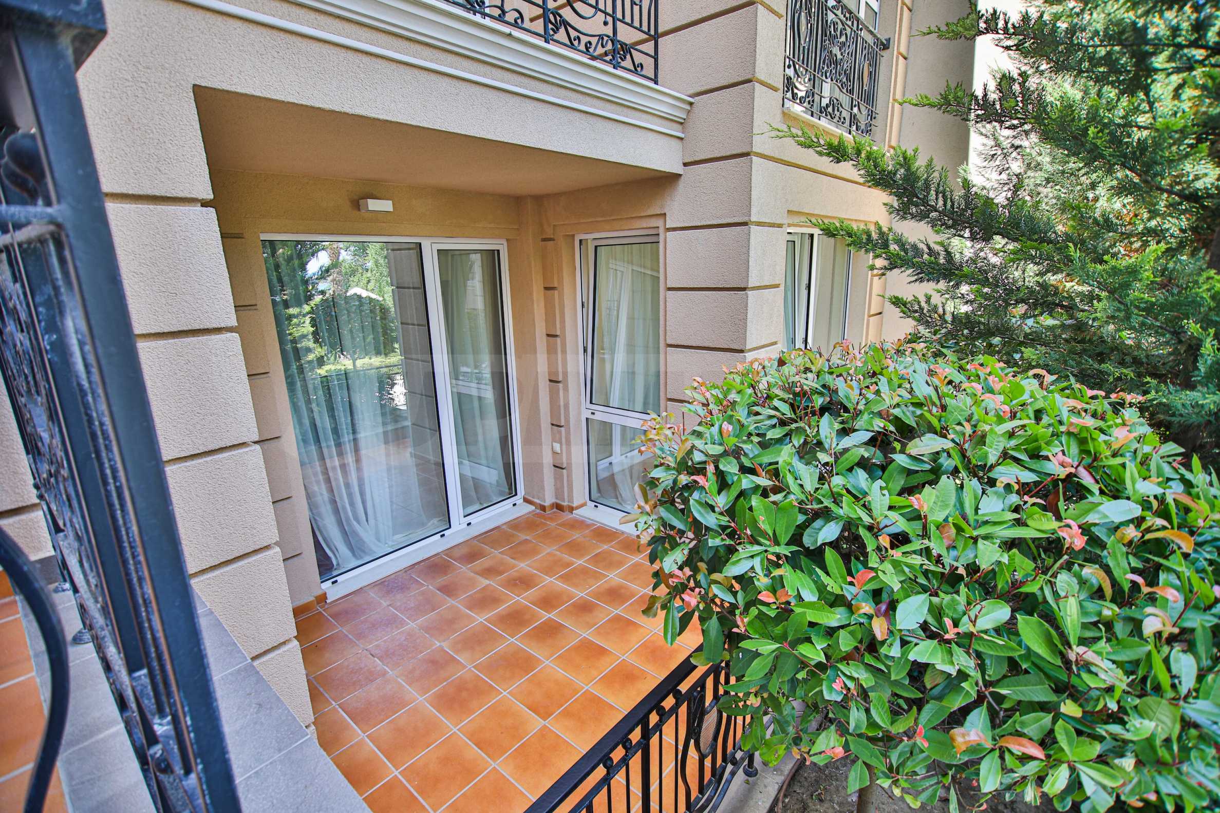 Apartament znajduje się na parterze budynku i posiada dużą werandę z widokiem na basen i zagospodarowany dziedziniec kompleksu, a także drugi, mniejszy taras przy sypialni. Mieszkanie jest w pełni umeblowane na zamówienie i wyposażone w meble wolnostojące renomowanych marek. Sprzęt AGD pochodzi głównie z prestiżowej marki Bosch – pralka, zmywarka, piekarnik, lodówka do zabudowy z oddzielnym zamrażalnikiem. Duża ogrodowa weranda została wyłożona płytkami klinkierowymi i wyposażona w komplet mebli ogrodowych – dużą sofę i fotel ze stolikiem kawowym, telewizor na uchwycie sufitowym, a także markizę chroniącą przed słońcem i deszczem, którą można rozciągnąć i zwinąć za pomocą korby. Mały taras przy sypialni również wyposażono w rozkładaną markizę. Taras ogrodowy otoczony jest pięknym, kutym ogrodzeniem i furtką, która zapewnia bezpośrednie wyjście do ogrodu kompleksu i na teren basenu.