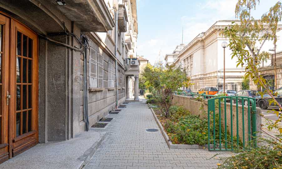 Nieruchomość położona jest w elitarnej dzielnicy z prestiżowymi budynkami, rezydencjami dyplomatycznymi i terenami zielonymi, zaledwie kilka minut od Uniwersytetu Sofijskiego, stacji metra „Teatralna”, Ogrodu Lekarzy oraz wszystkich udogodnień i atrakcji centralnej części stolicy.