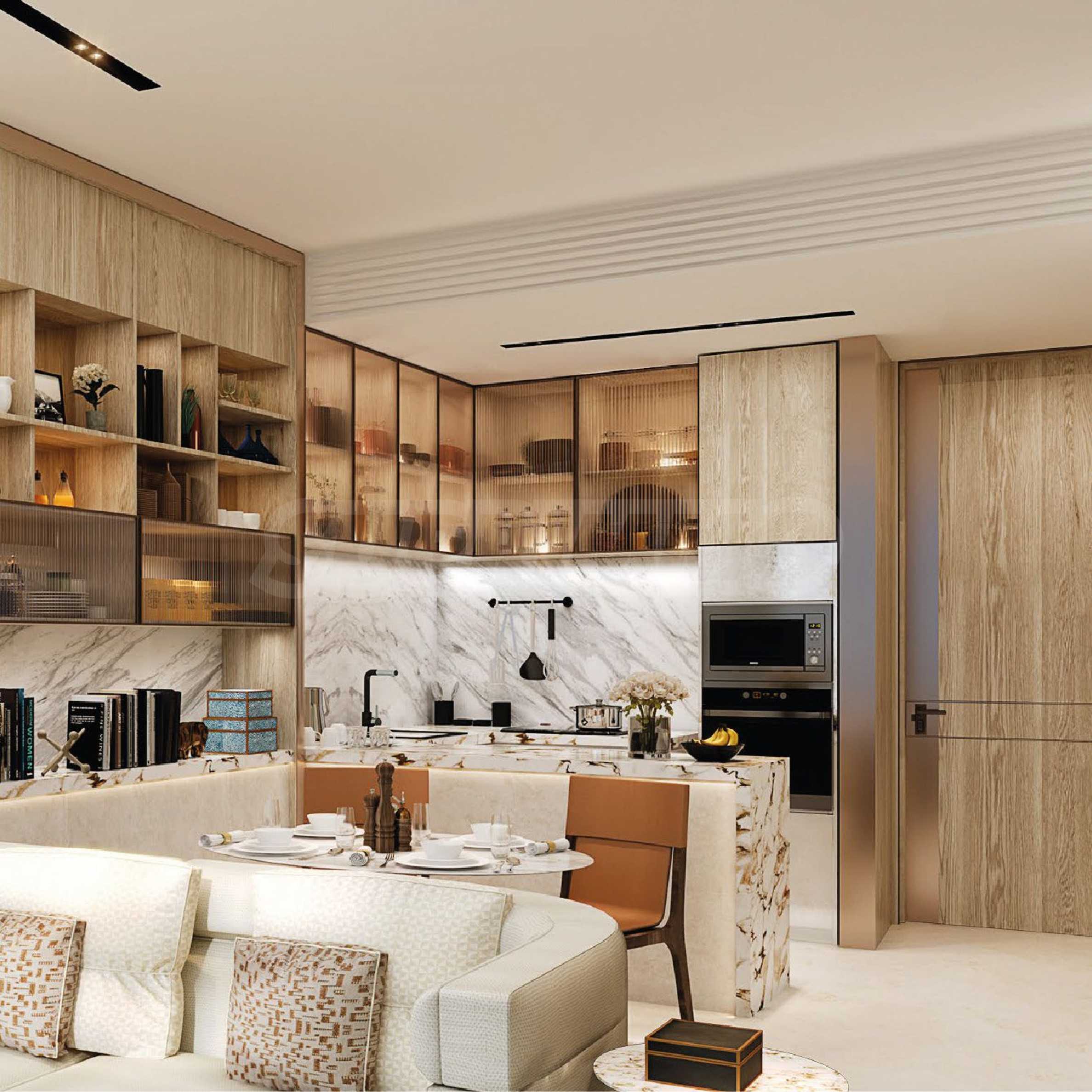 Kuchnia jest stylowo wykończona i w pełni wyposażona w eleganckie szafki i wysokiej klasy sprzęt AGD, gotowy zainspirować każde kulinarne przedsięwzięcie. Łazienki zachwycają marmurowymi detalami i złotymi akcentami, które nadają im wyrafinowania i ponadczasowego luksusu.