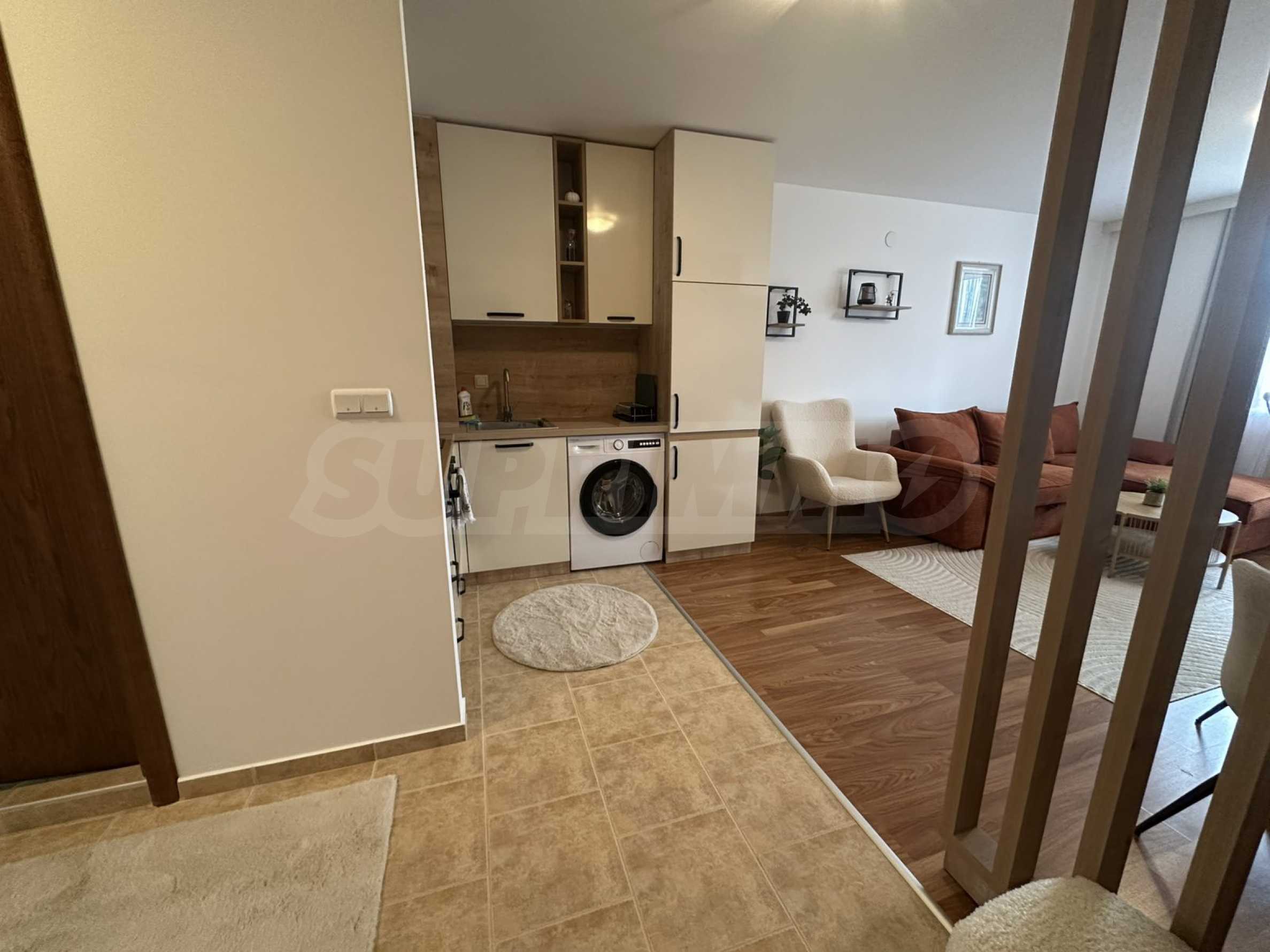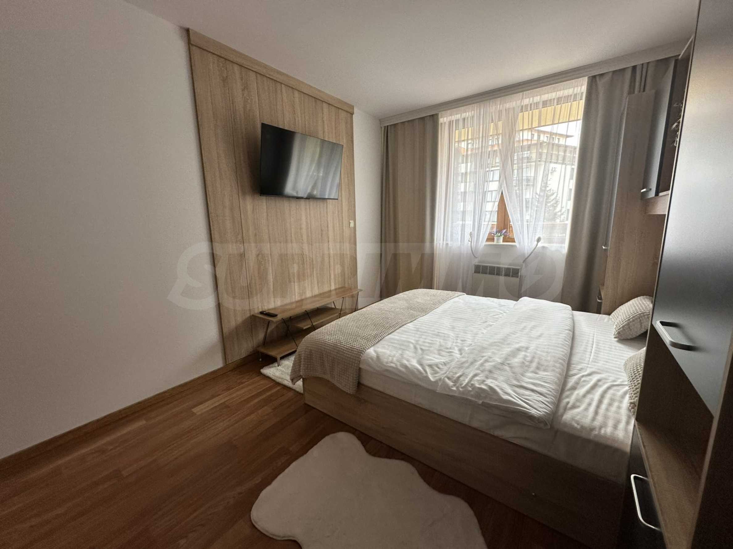 Nieruchomość składa się z: korytarza, jasnego i przytulnego salonu z dużymi oknami, wygodną rozkładaną sofą, telewizorem z płaskim ekranem i stolikiem kawowym. Aneks kuchenny jest w pełni wyposażony – znajdują się w nim sprzęty AGD w zabudowie, płyta grzewcza, lodówka, kuchenka mikrofalowa, czajnik elektryczny, naczynia i przybory kuchenne. Sypialnia jest oddzielna i oferuje duże łóżko z wysokiej jakości materacem, szafę z miejscem na bagaż oraz stoliki nocne z lampkami. Łazienka jest nowoczesna, z kabiną prysznicową, suszarką do włosów i wszystkimi niezbędnymi udogodnieniami.