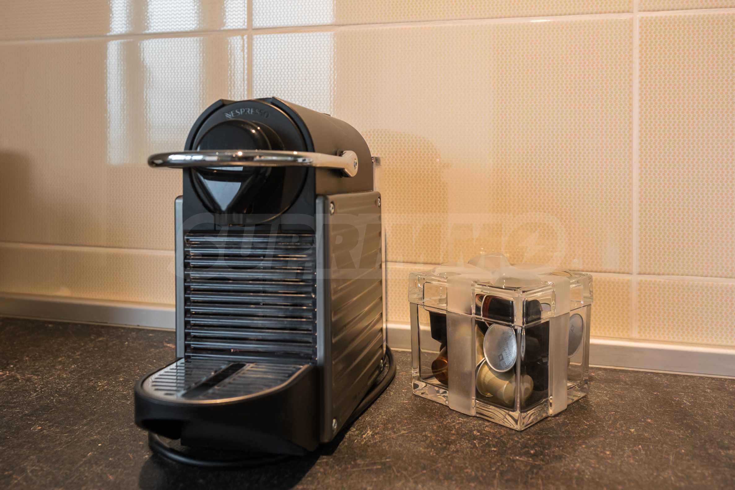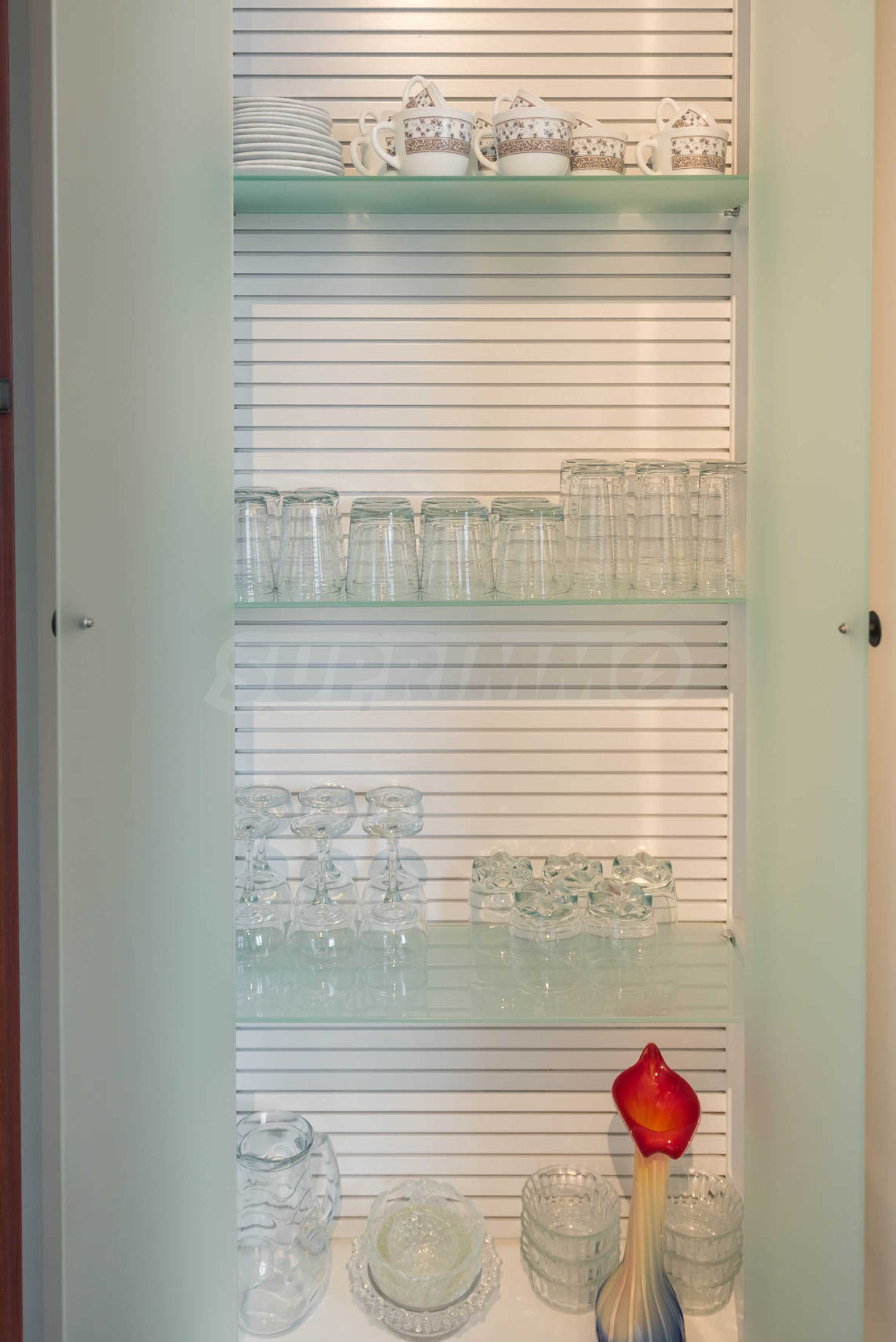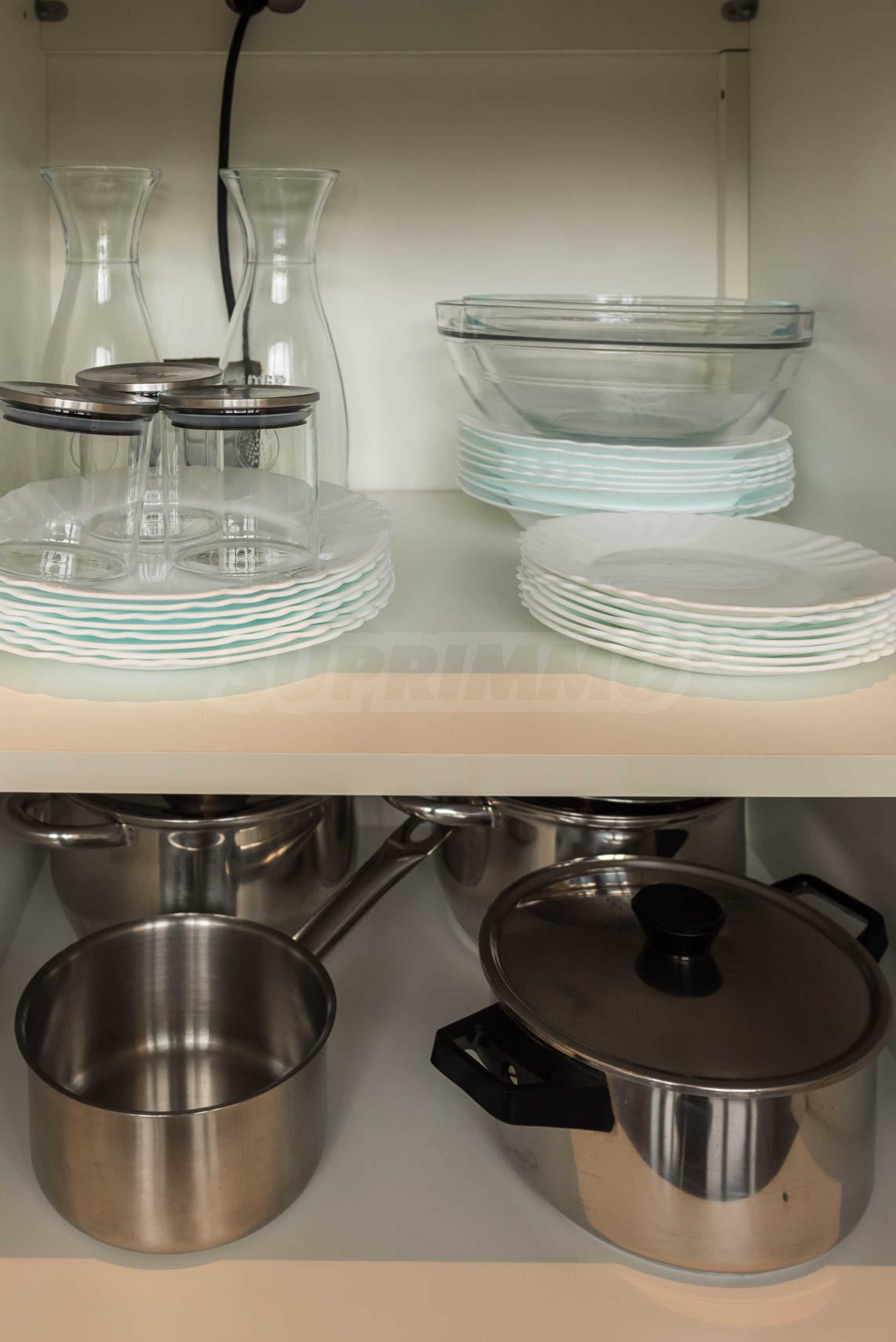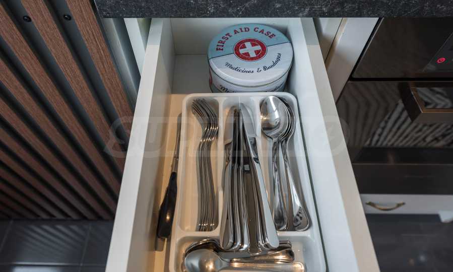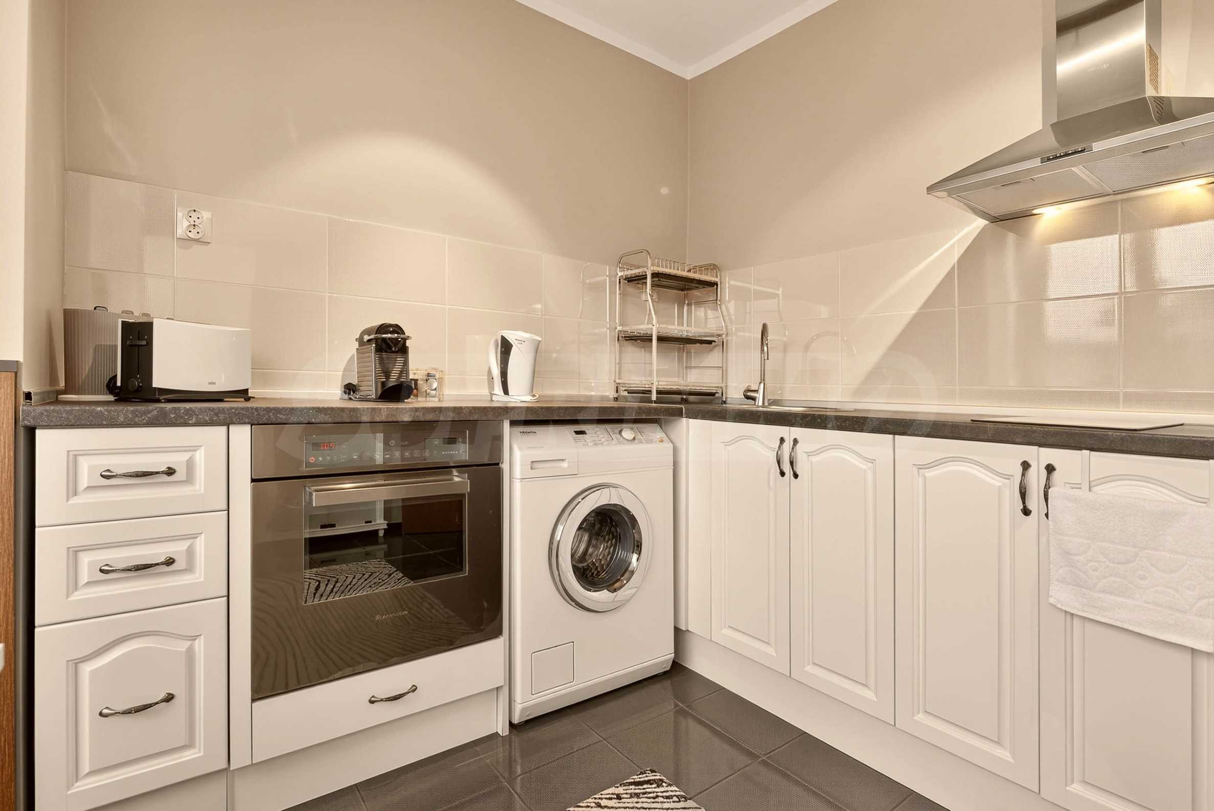 Apartament jest jasny i przestronny, z nowoczesnym wnętrzem, utrzymanym w stonowanych barwach, które tworzą harmonię i poczucie spokoju. Jest w pełni umeblowany i wyposażony we wszystko, co niezbędne do komfortowego i komfortowego życia.