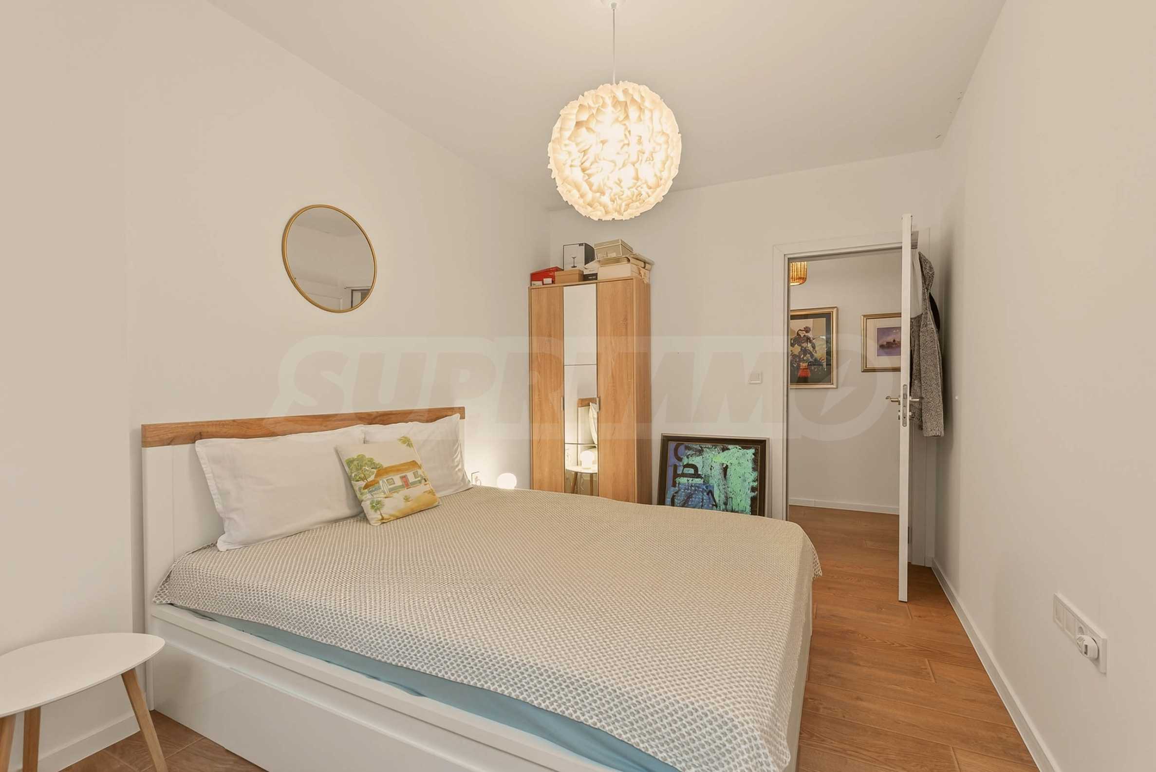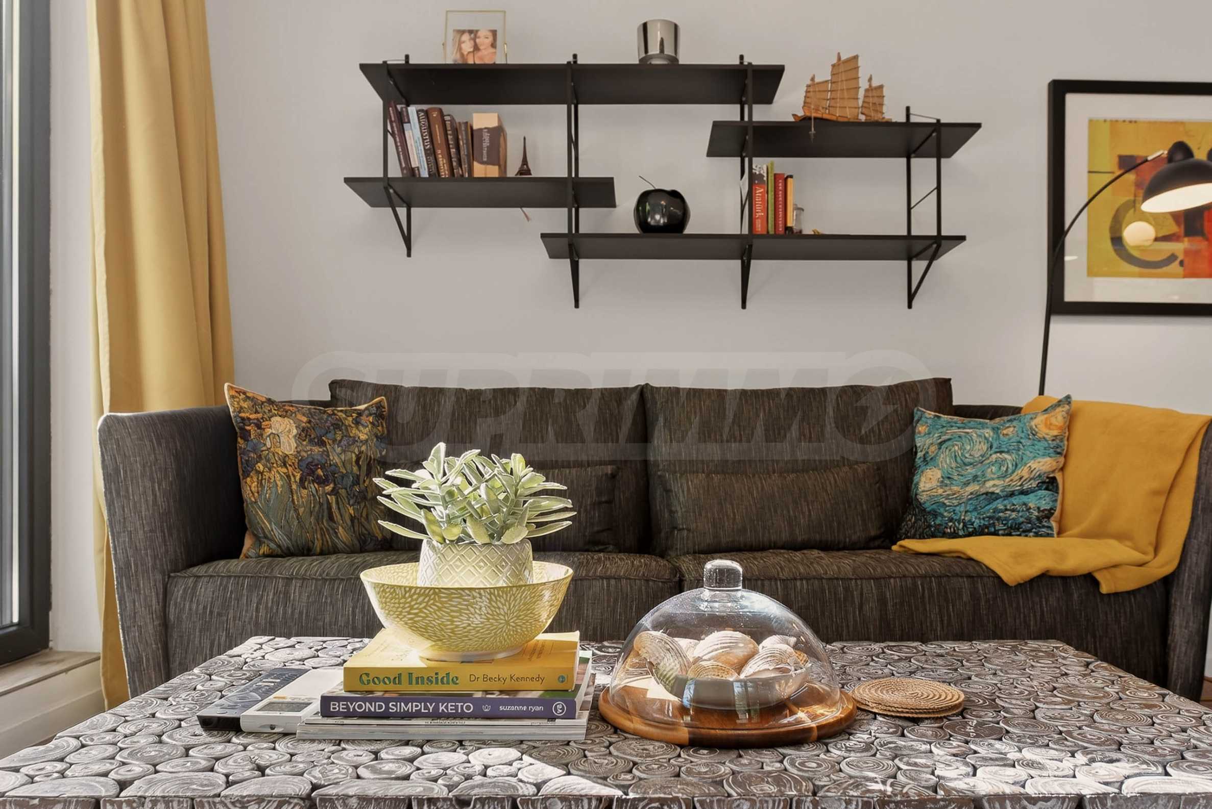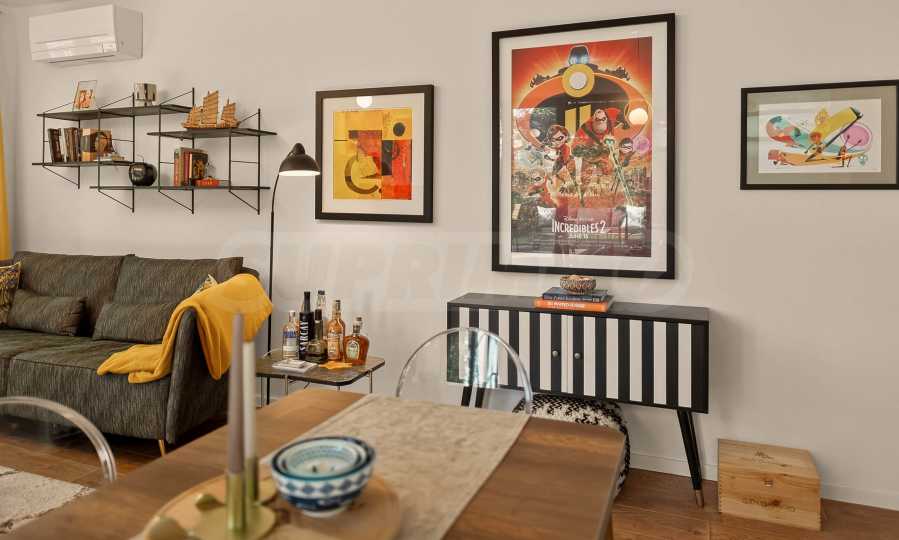 Apartament wyróżnia się nowym, stylowym umeblowaniem, które w połączeniu z artystycznymi elementami tworzy ciepłą i przyjemną atmosferę.