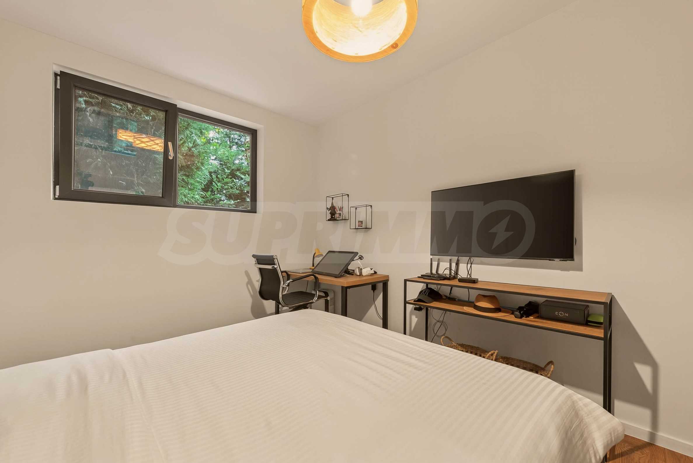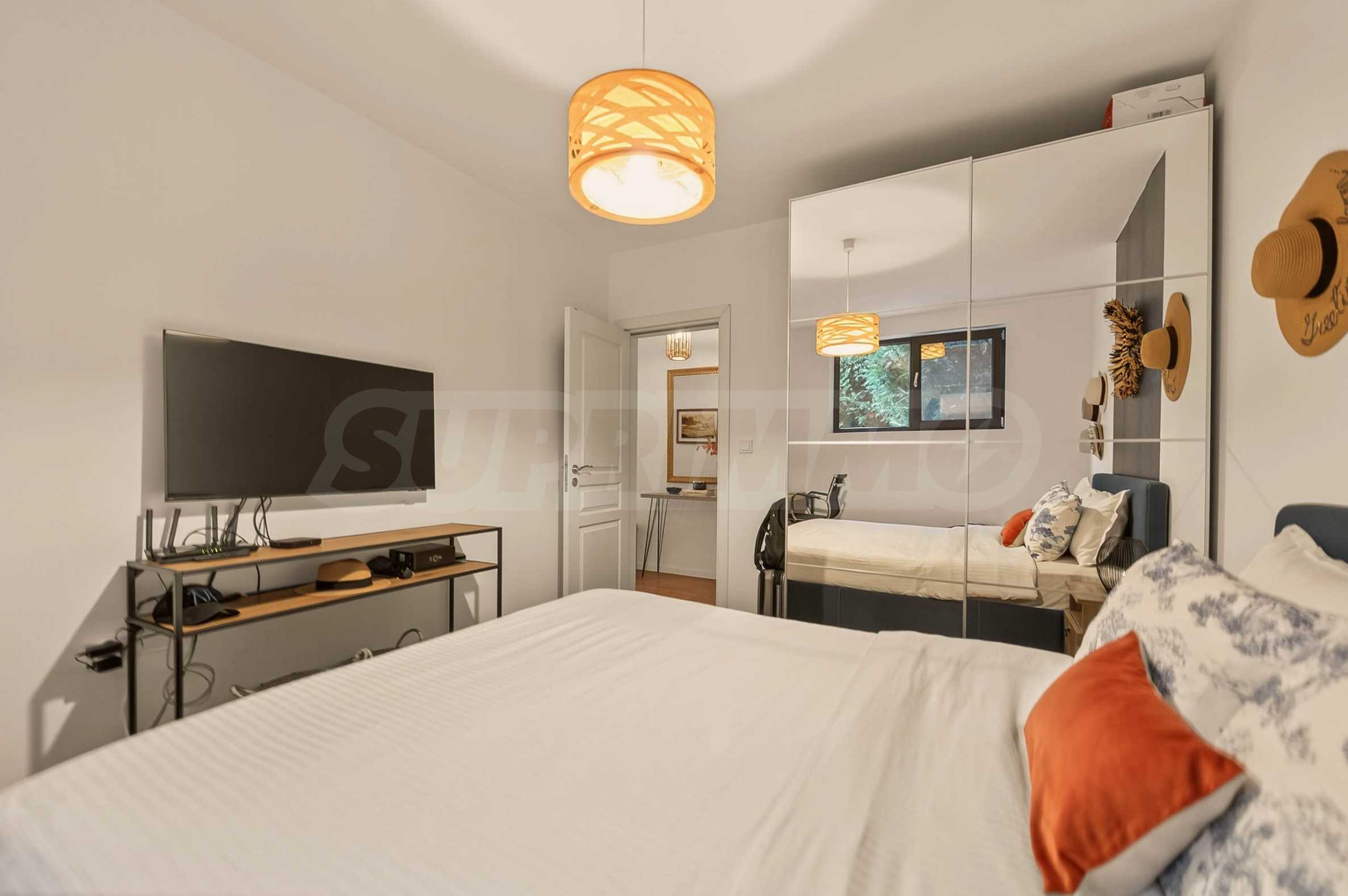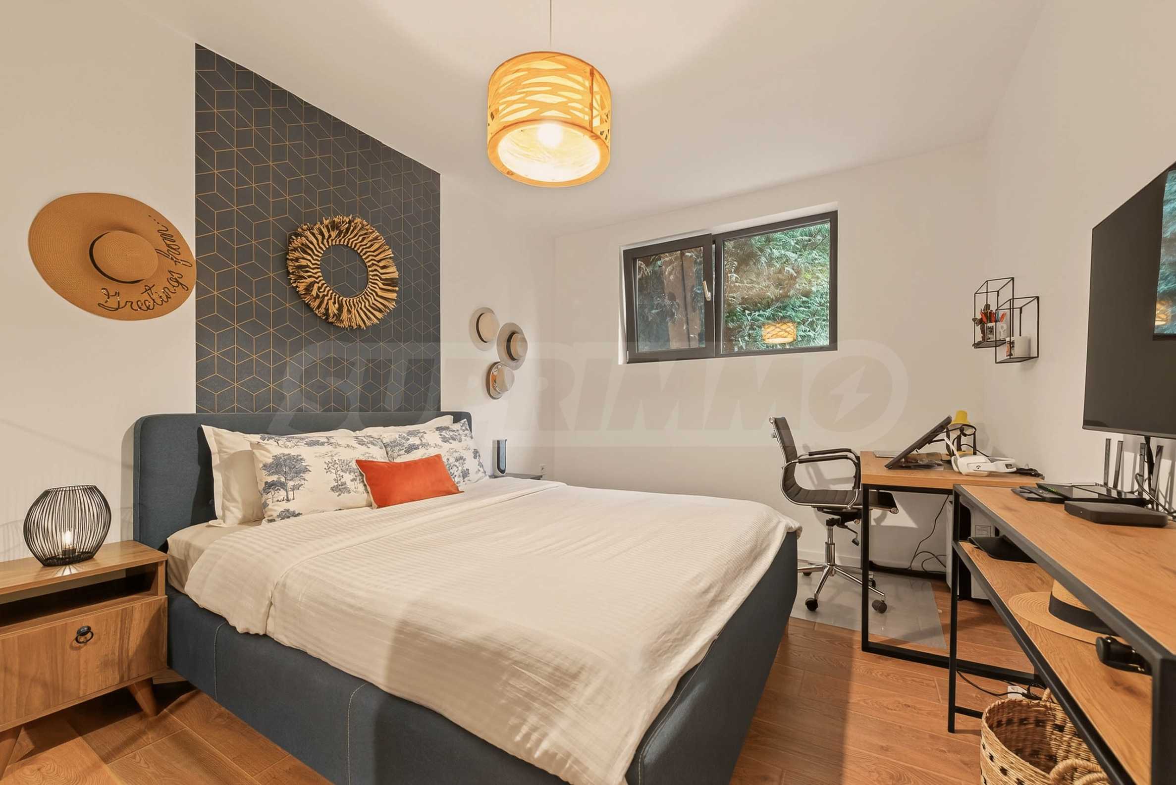 Apartament wyróżnia się nowym, stylowym umeblowaniem, które w połączeniu z artystycznymi elementami tworzy ciepłą i przyjemną atmosferę.