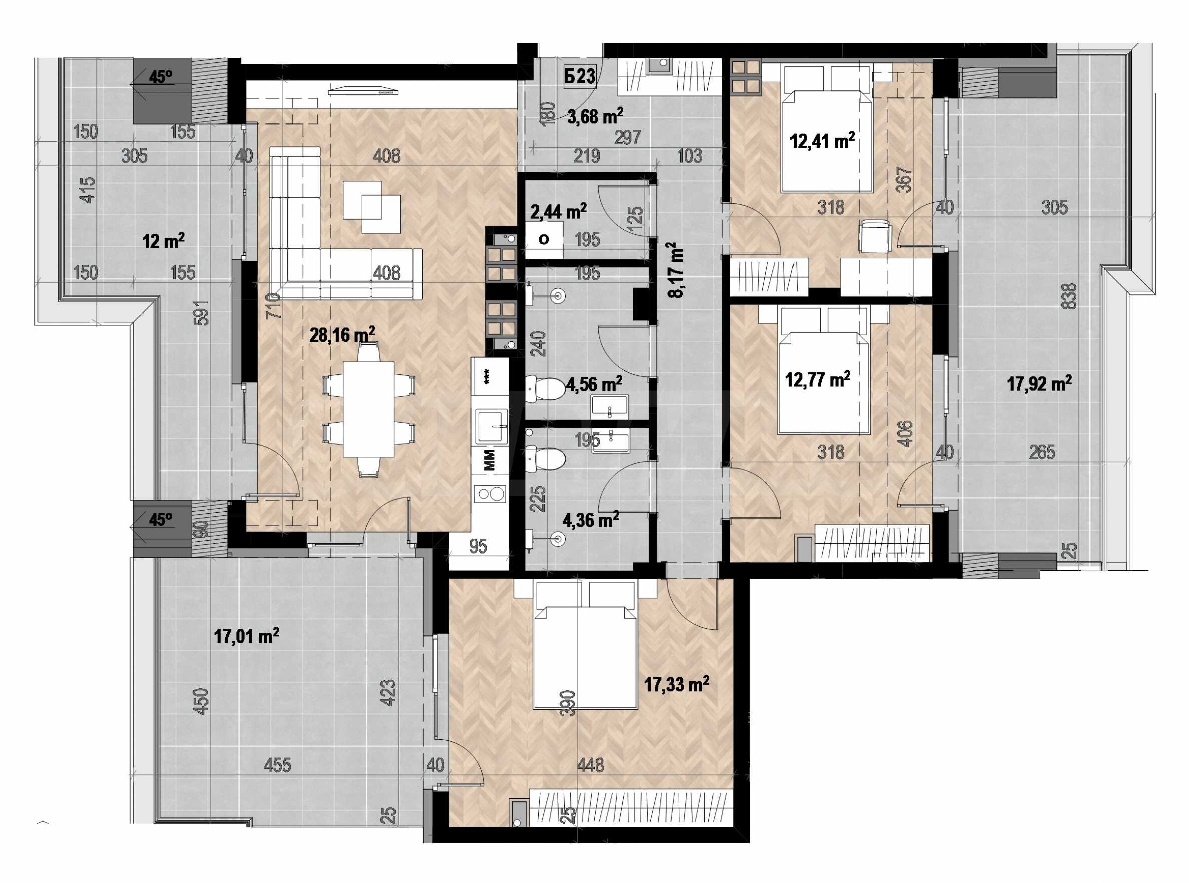 Powierzchnia mieszkalna wynosi 168,94 m2, powierzchnia części wspólnych wynosi 26,31 m2 i ma następujący rozkład: