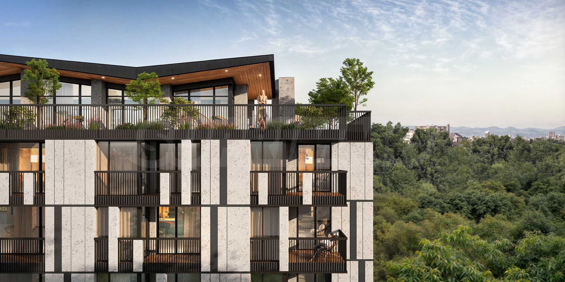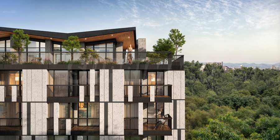 Budynek zajmuje pięć kondygnacji mieszkalnych i zachwyca nowoczesną linią architektoniczną oraz charakterystyczną prezencją, która wyraźnie wyróżnia się na tle otoczenia. Nowoczesna elewacja i szerokie, panoramiczne okna zapewniają mnóstwo naturalnego światła w każdym domu, odsłaniając pełnię piękna otaczającego krajobrazu.