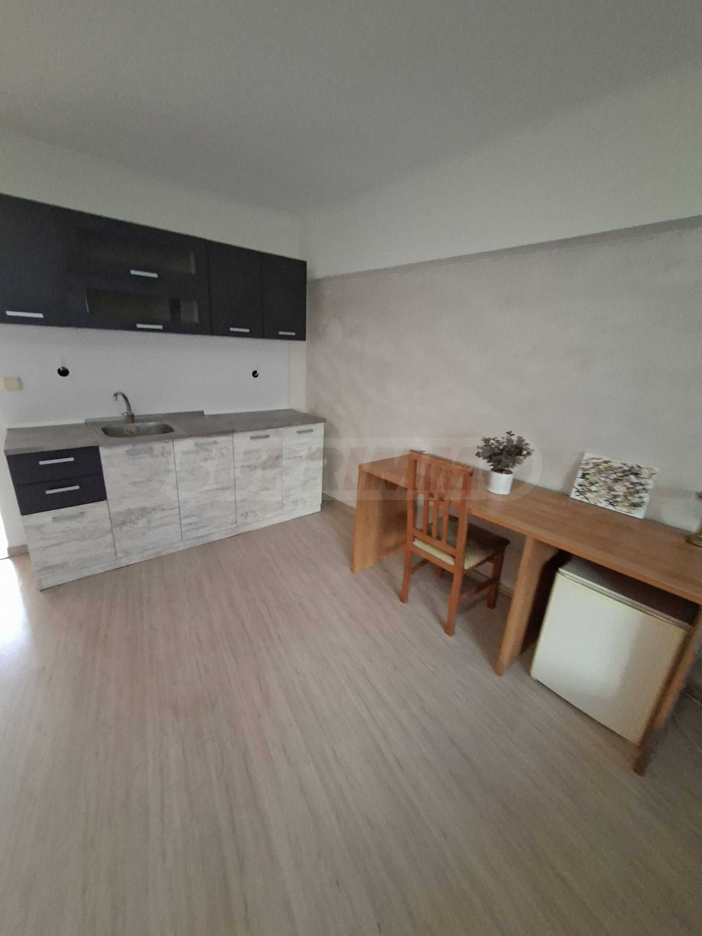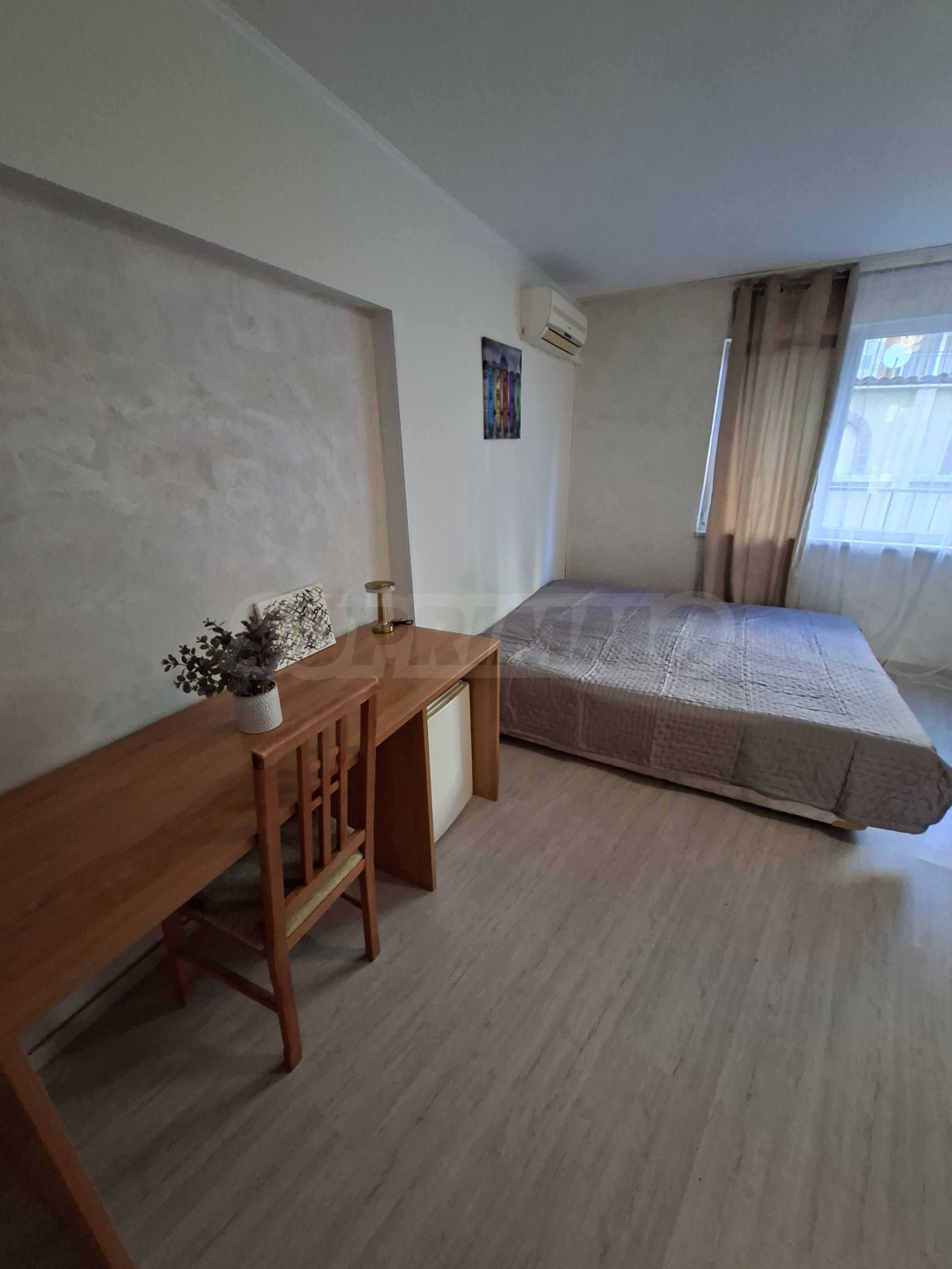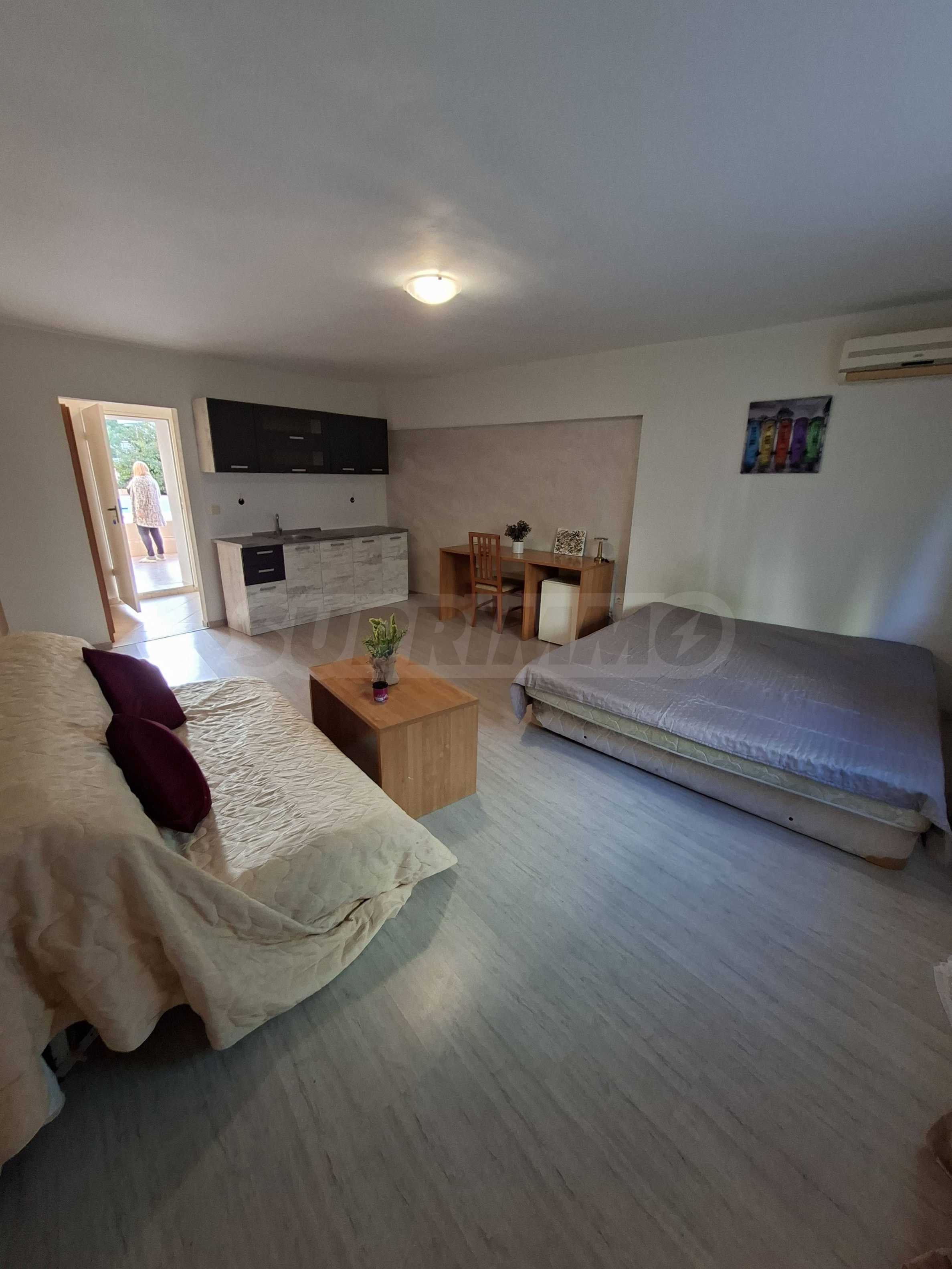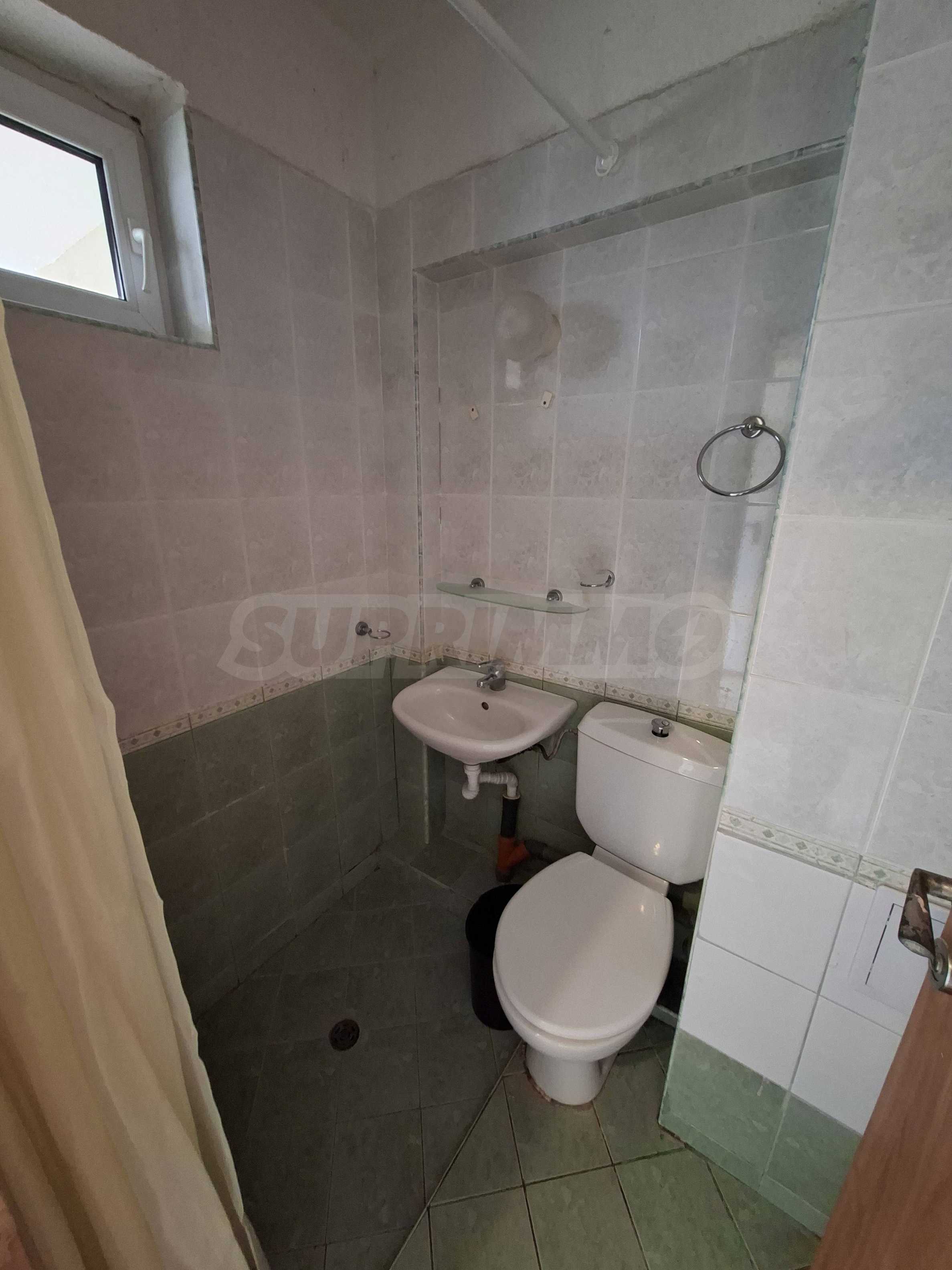 Oferujemy na sprzedaż mieszkanie jednopokojowe w strzeżonym kompleksie z basenem w cichej i spokojnej okolicy Słonecznego Brzegu. 450 metrów od plaży Cacao, w pobliżu sklepów, restauracji, atrakcji, przystanku autobusowego, apteki, w odległości spaceru od miasta Nesebyr.
