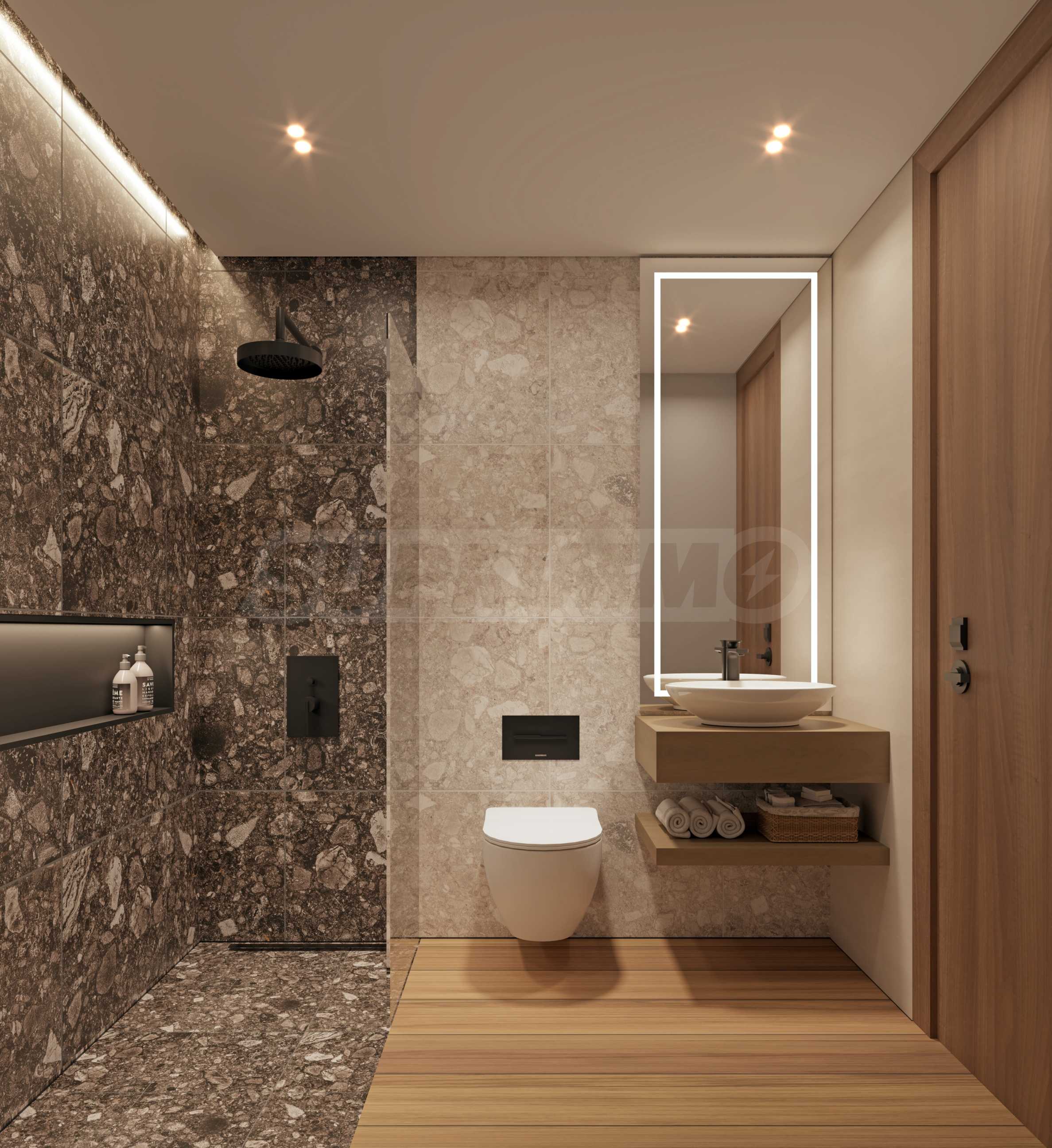 W łazience i kuchni położono wysokiej jakości płytki, a w sypialniach i salonie – parkiet winylowy imitujący drewno. Takie połączenie zapewnia praktyczność, łatwość utrzymania i poczucie przytulności we wnętrzu. Na tarasie znajduje się taras – stylowe i ekologiczne rozwiązanie, odpowiednie do warunków zewnętrznych. Okna z aluminiowymi ramami i podwójnymi szybami zostały zaprojektowane tak, aby zapewnić wysoki poziom ochrony przed trzęsieniami ziemi, huraganami i innymi klęskami żywiołowymi, gwarantując większe bezpieczeństwo. Ściany i sufity pomalowano farbą oddychającą, a drzwi wewnętrzne dobrano tak, aby harmonijnie wpisywały się w ogólny styl domu.